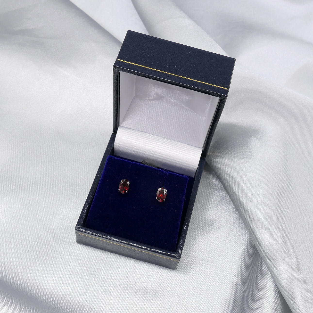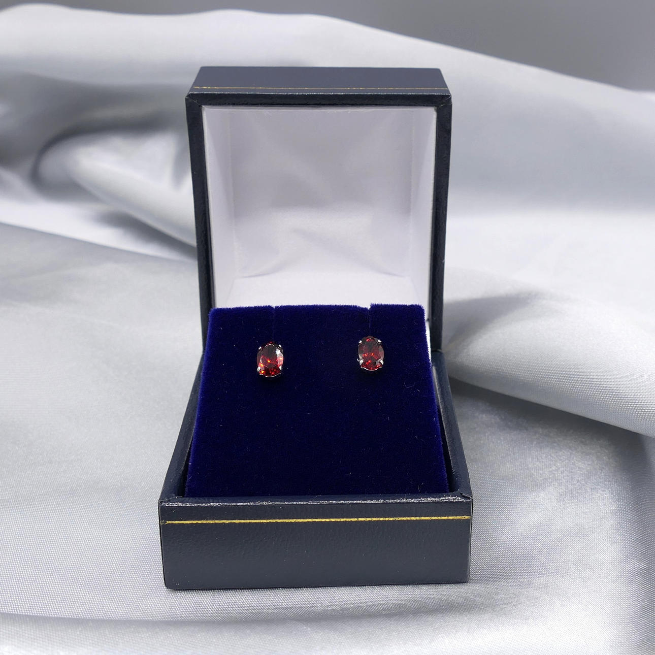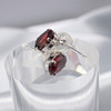 Jeder Ohrstecker besteht aus 4 Krallen, die mit einem einzelnen 6 x 4 mm großen Granat-Edelstein besetzt sind. Das Gesamtkaratgewicht beider Granate beträgt 0,80 ct.