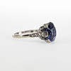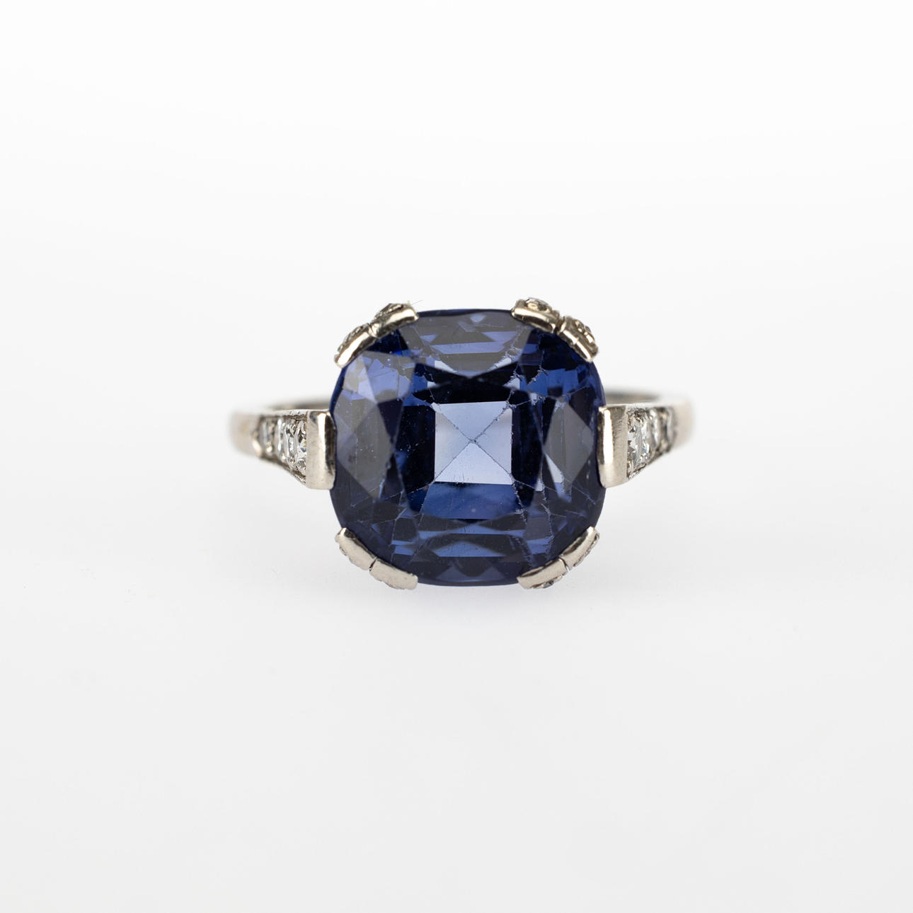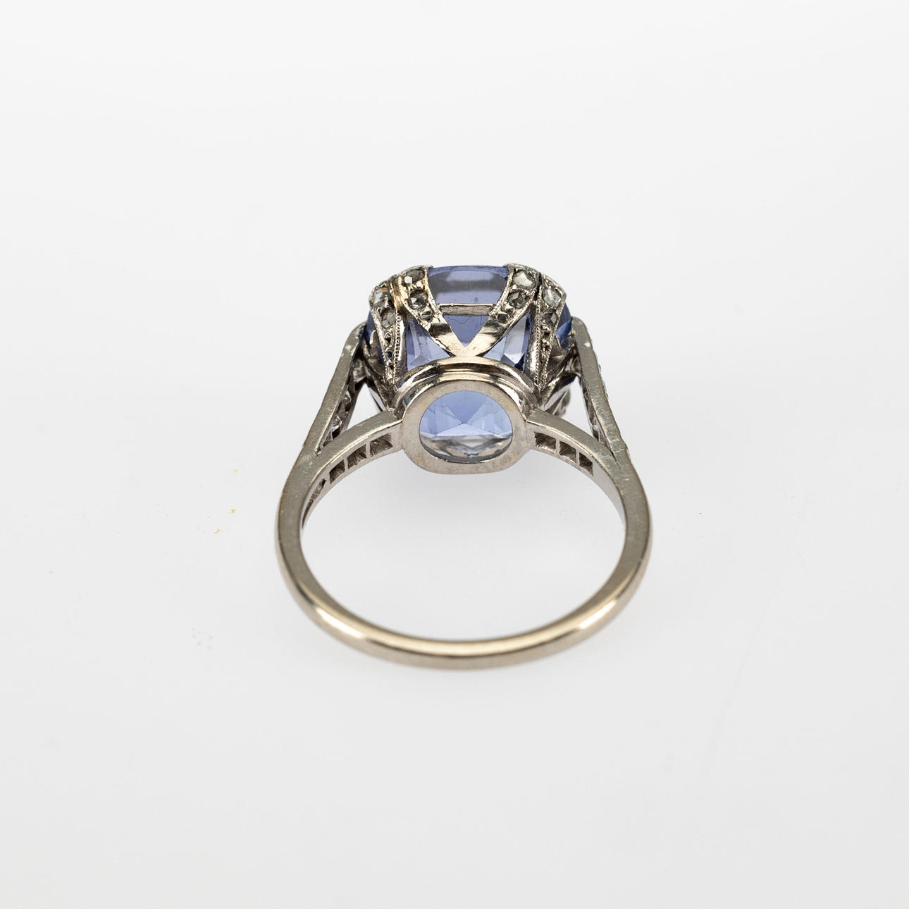 Saphir im Kissenschliff ca. 8,90 ct, Diamanten zus. ca. 0,40 ct, Größe 16,5, Gewicht ca. 6,3 g.