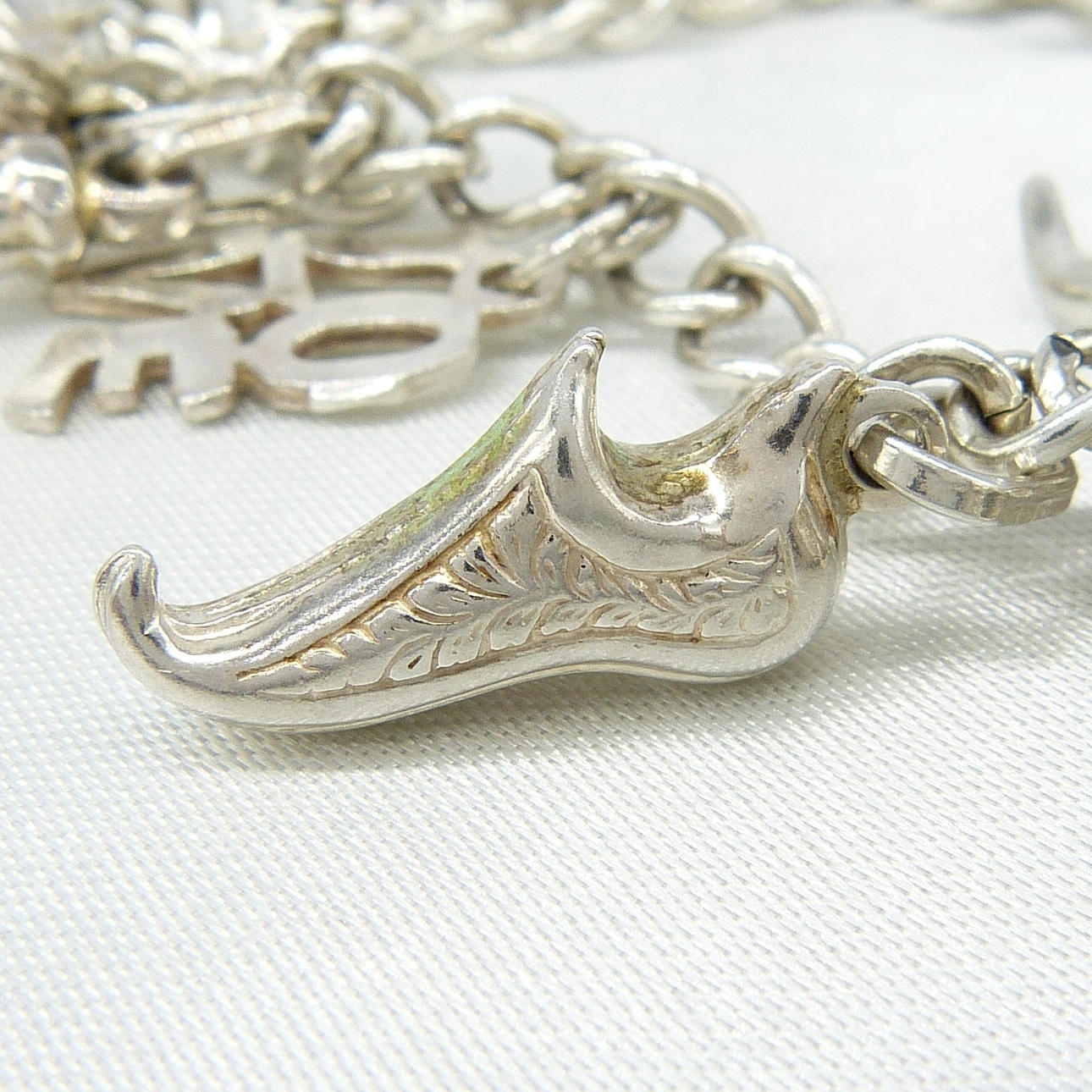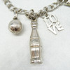 Hier sind die Beschreibungen der einzelnen Charms: • Nofretete-Kopf, 21 x 23 mm • Buttermesser, 29 x 2 mm • Springender Fisch, 22 x 6 mm • Umhülltes Herz, 19 mm Durchmesser • Fußball, 10 mm Durchmesser • Coca-Cola-Flasche, 35 x 7 mm • LIEBE Schriftzug, 15 x 10 mm • Narren-/Elfenschuh, 18 x 9 mm • Koalabär, der sich an einen Baum klammert, 21 x 12 mm • Füllhorn, 19 x 5 mm • Holländischer Clog, 20 x 5 mm • Anker, 27 x 16 mm • „Ok“-Zeiger Symbol, 34 x 11 mm Alle Maße sind ungefähre Angaben.
