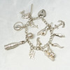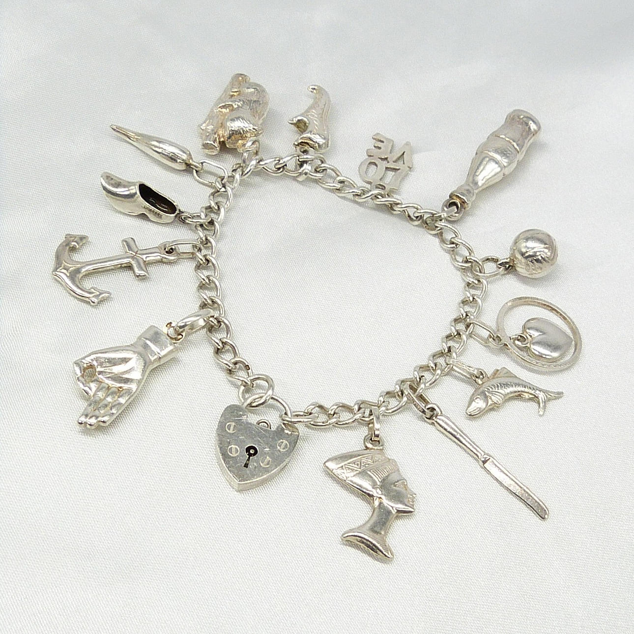 Ein Bettelarmband aus Sterlingsilber mit Vorhängeschlossverschluss und 13 Glücksbringern.