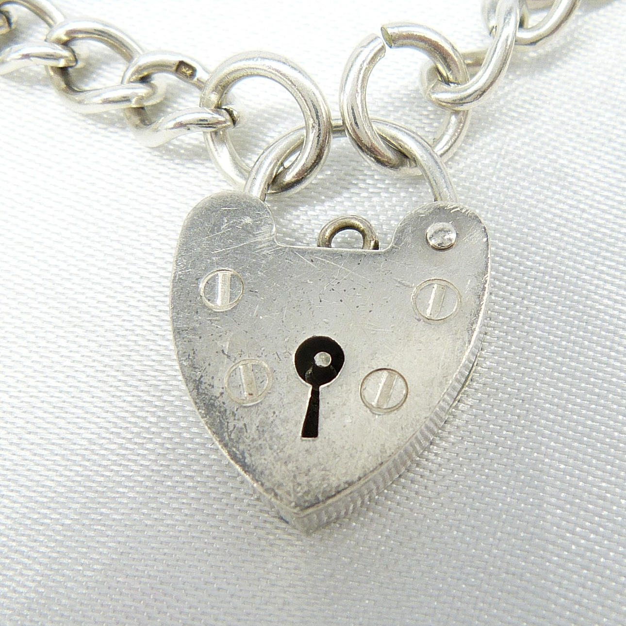 Dieses schwere Armband ist mit einem Vorhängeschlossverschluss ausgestattet. Armbandlänge (geschlossen): ca. 18 cm.
