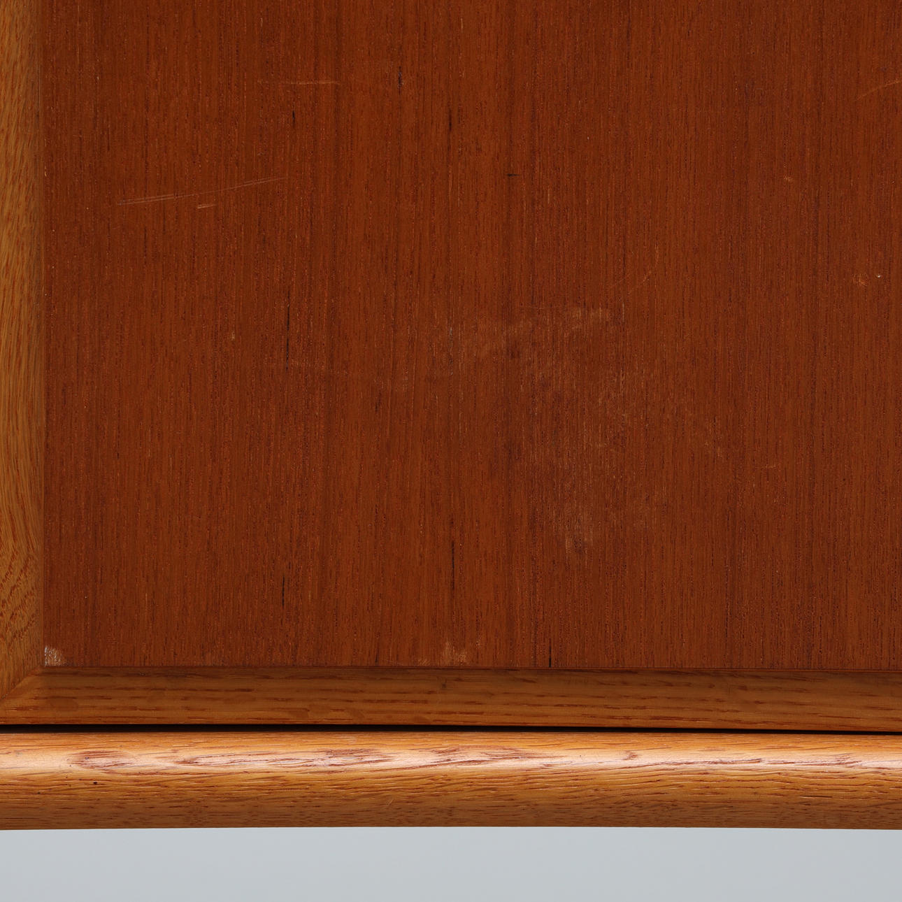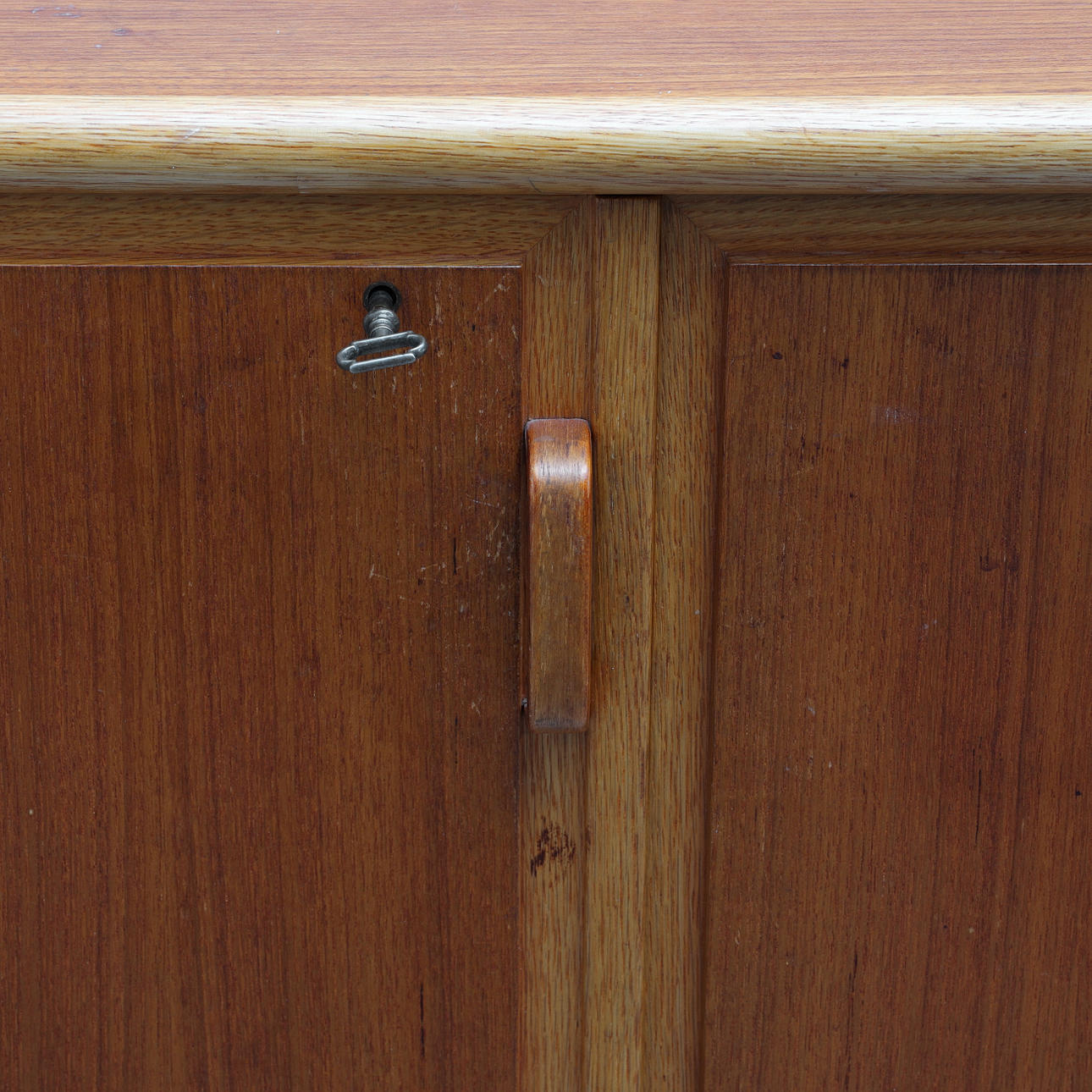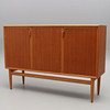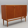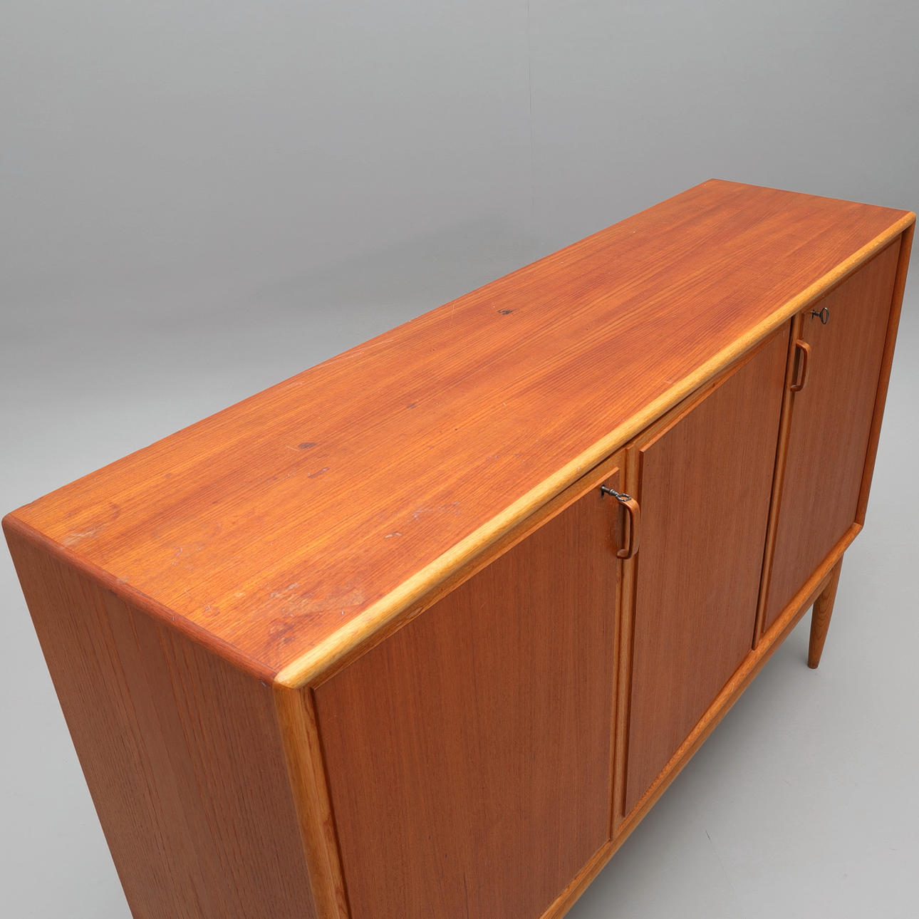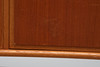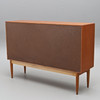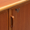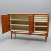 Mit Teakholz furniert, Beine und Details in Eiche, originales Interieur mit gelb/weiß gestreiften Regalen und 4 Schubladen.
