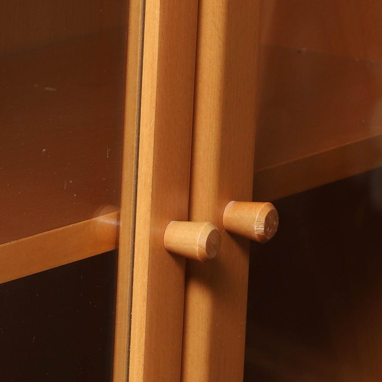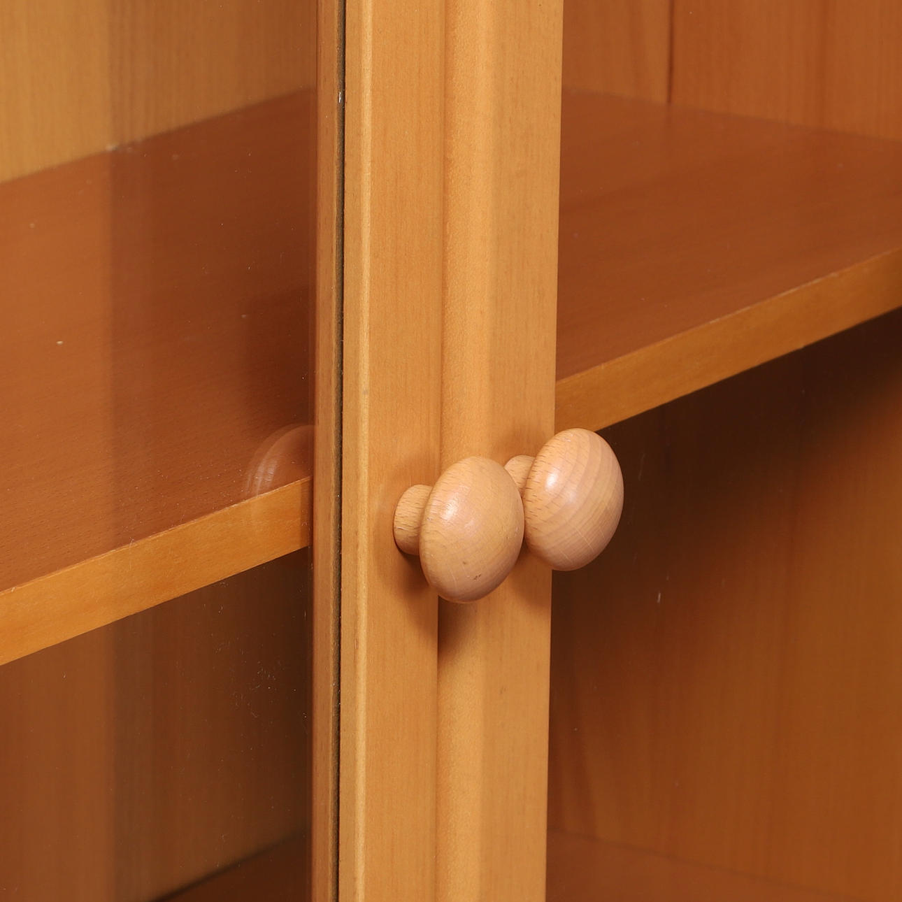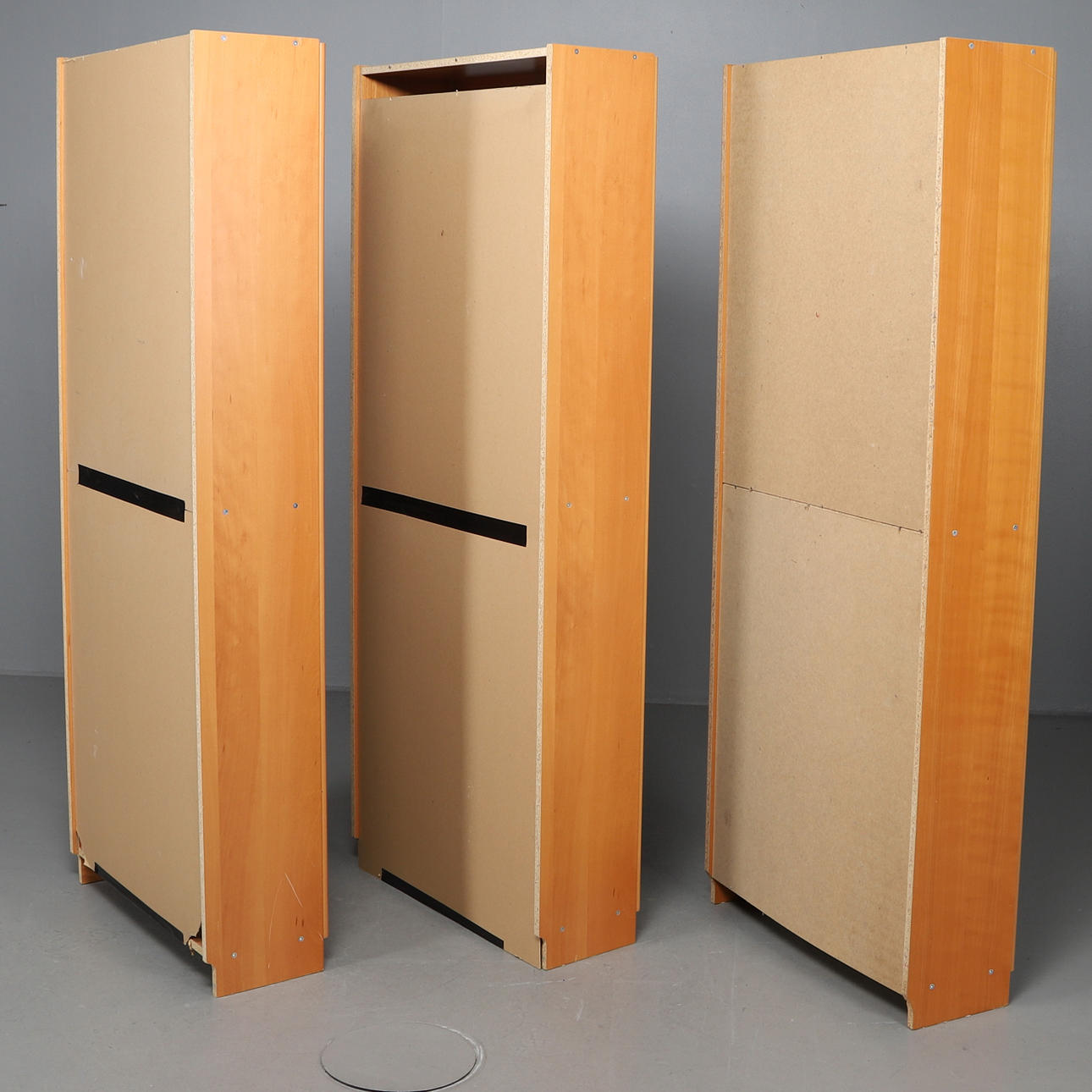Drei Bücherregale in Buchenfurnier mit Glastüren.