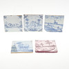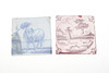Fünf verschiedene filigrane Kacheln, darunter blaue und weiße und manganfarbene Beispiele. Motive, darunter Tiere und eine Figur mit einem Hund. 13 cm, 12,5 cm und 12 cm im Quadrat.