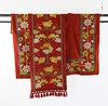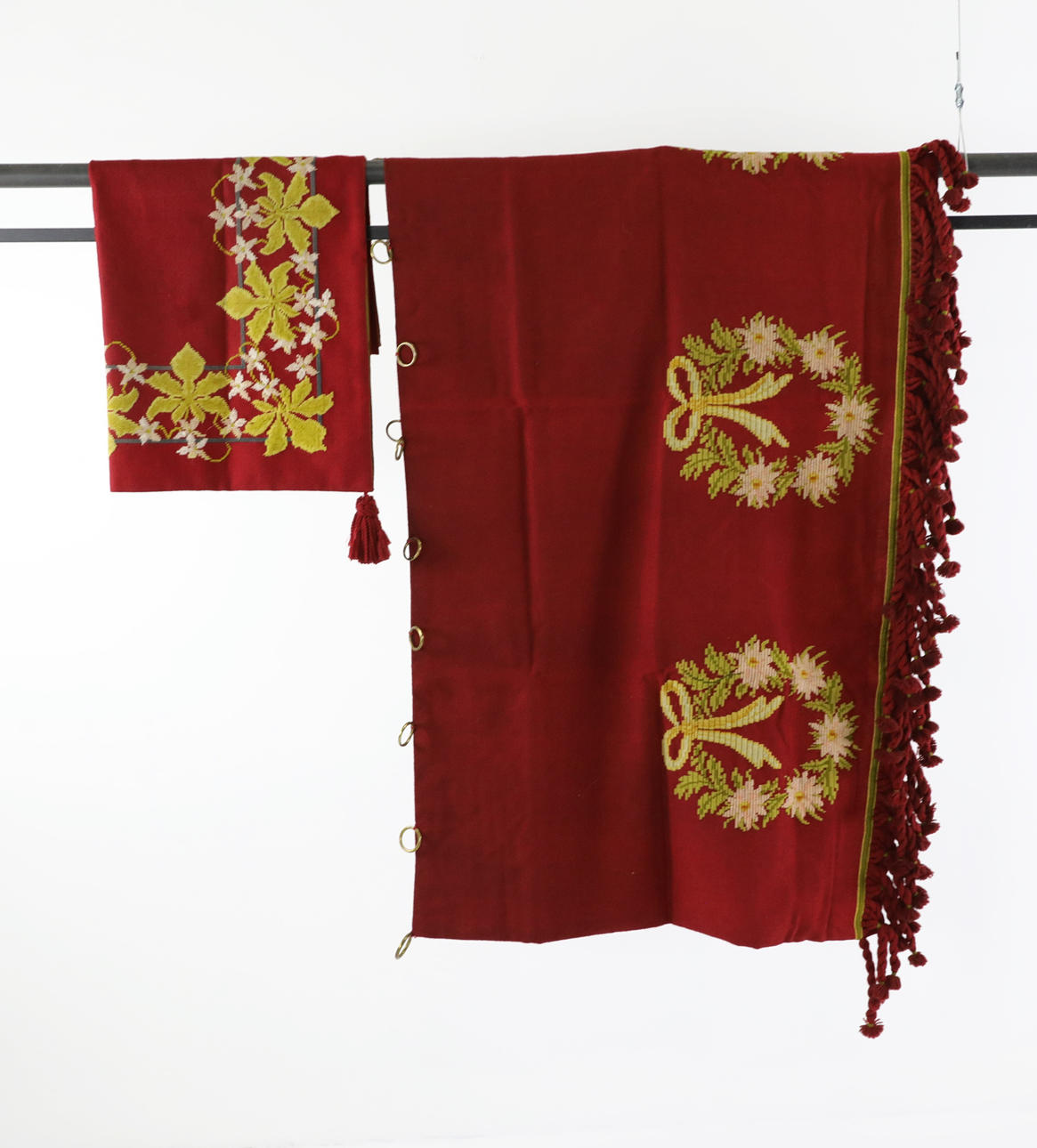 98 x 190 cm, inkl. Fransen, rotes Innenfutter, aufgenähte Ringe aus gelbem Metall am oberen Rand.