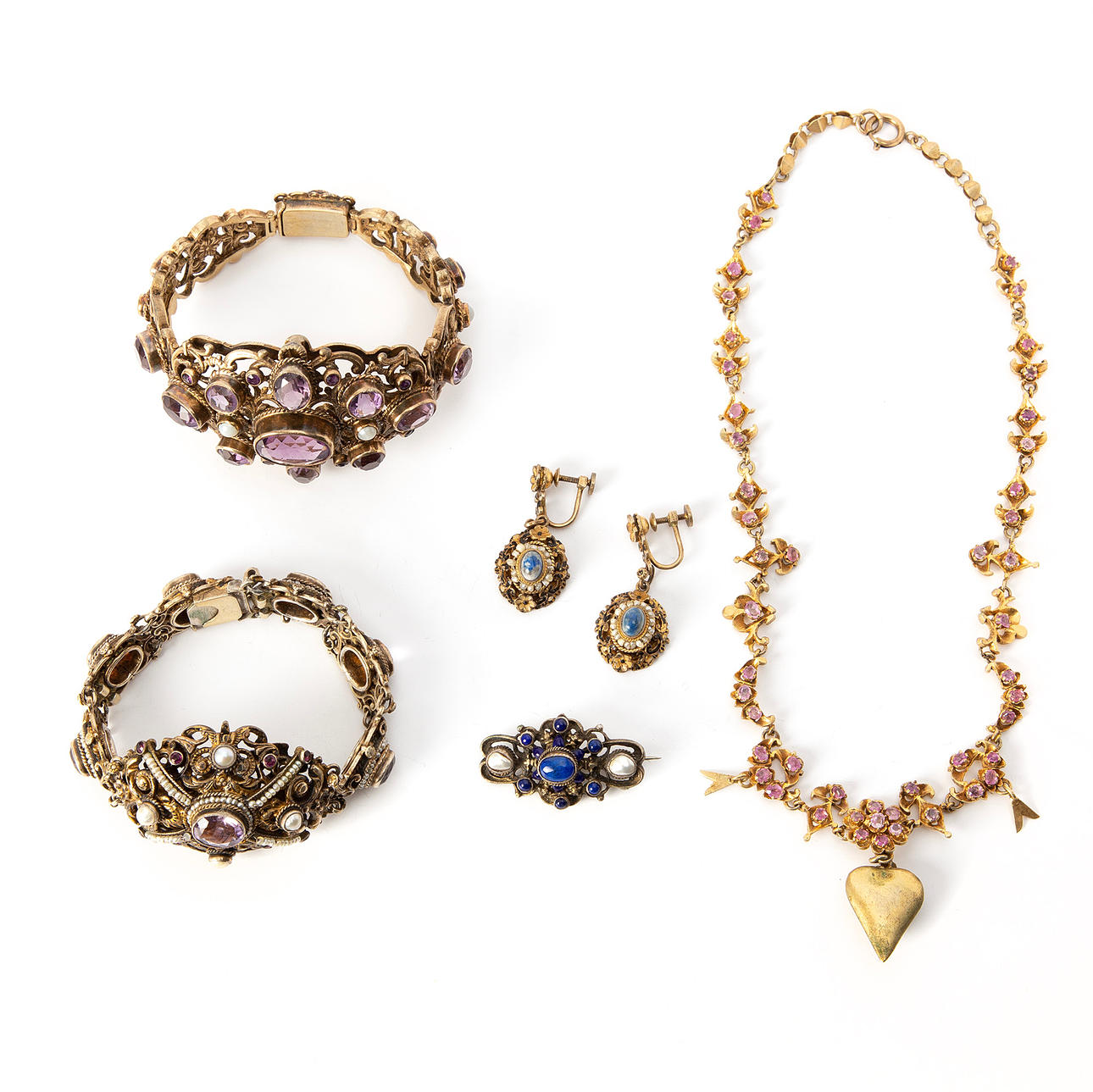Armband, Brosche und Halskette aus Metall mit Amethysten, wahrscheinlich Quarz, Zuchtperlen und wahrscheinlich Orientperlen.