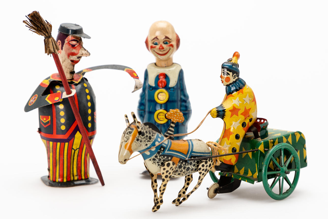Clown mit Eselskutsche, "störrischer Esel", lithographiertes Blech, Länge ca.: 19 cm.