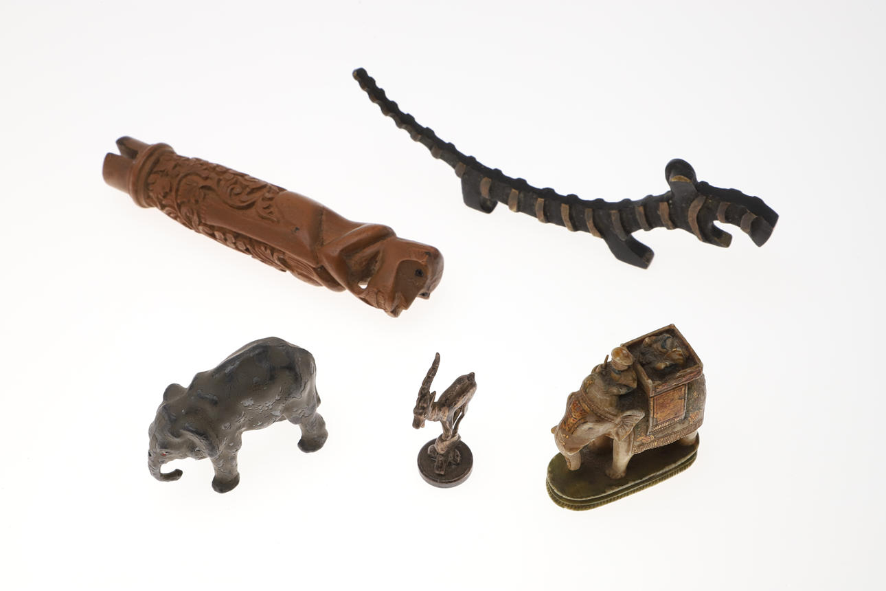 meist aus Holz, die höchste 17 cm, und eine Weißmetallfigur einer Antilope und eine Bleifigur eines Elefanten.