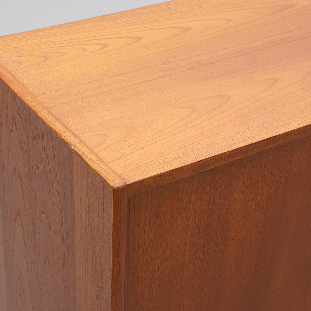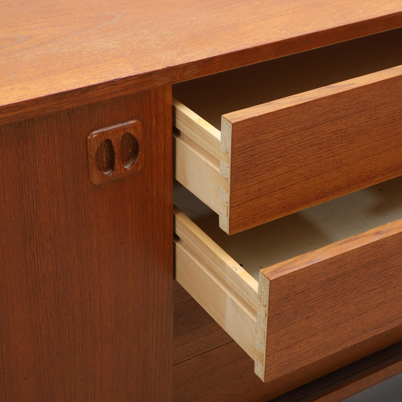 Teak. Vorne zwei Schiebetüren und vier Schubladen. Länge 182, Tiefe 182, Tiefe 42, Höhe 78 cm.