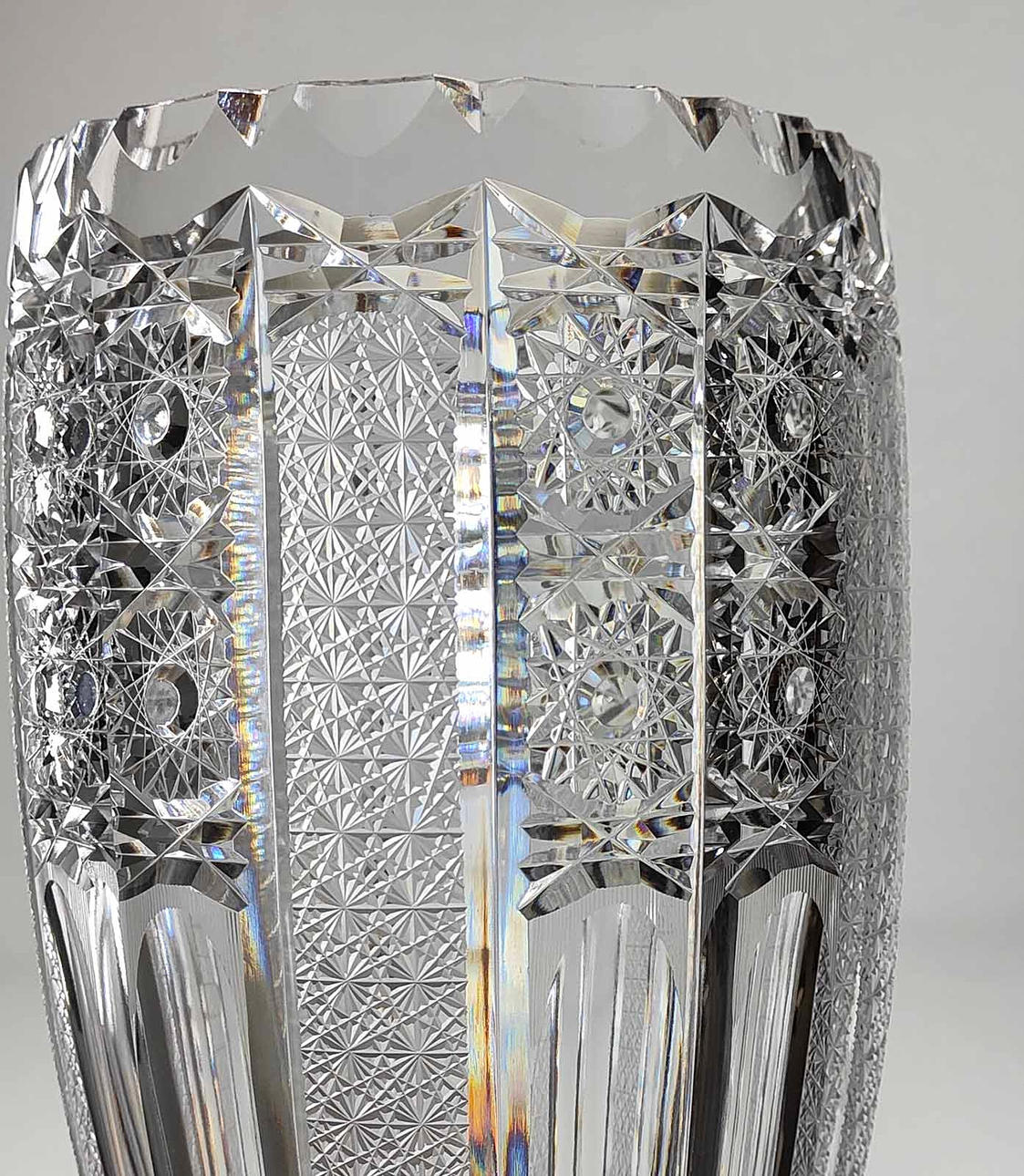 farbloses Kristallglas mundgeblasen und reich von Hand beschliffen, reich mit verschiedenen Schliffarten *Pariser Schliff* umlaufend gearbeitet, Durchmesser 17 cm, Höhe ca. 30 cm, Gewicht 2,5 kg.