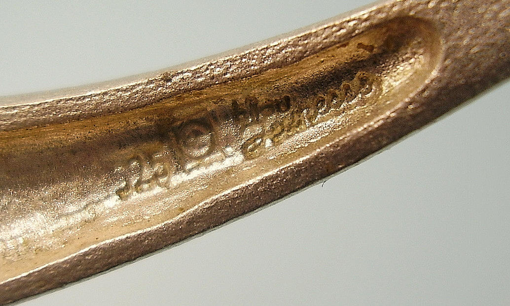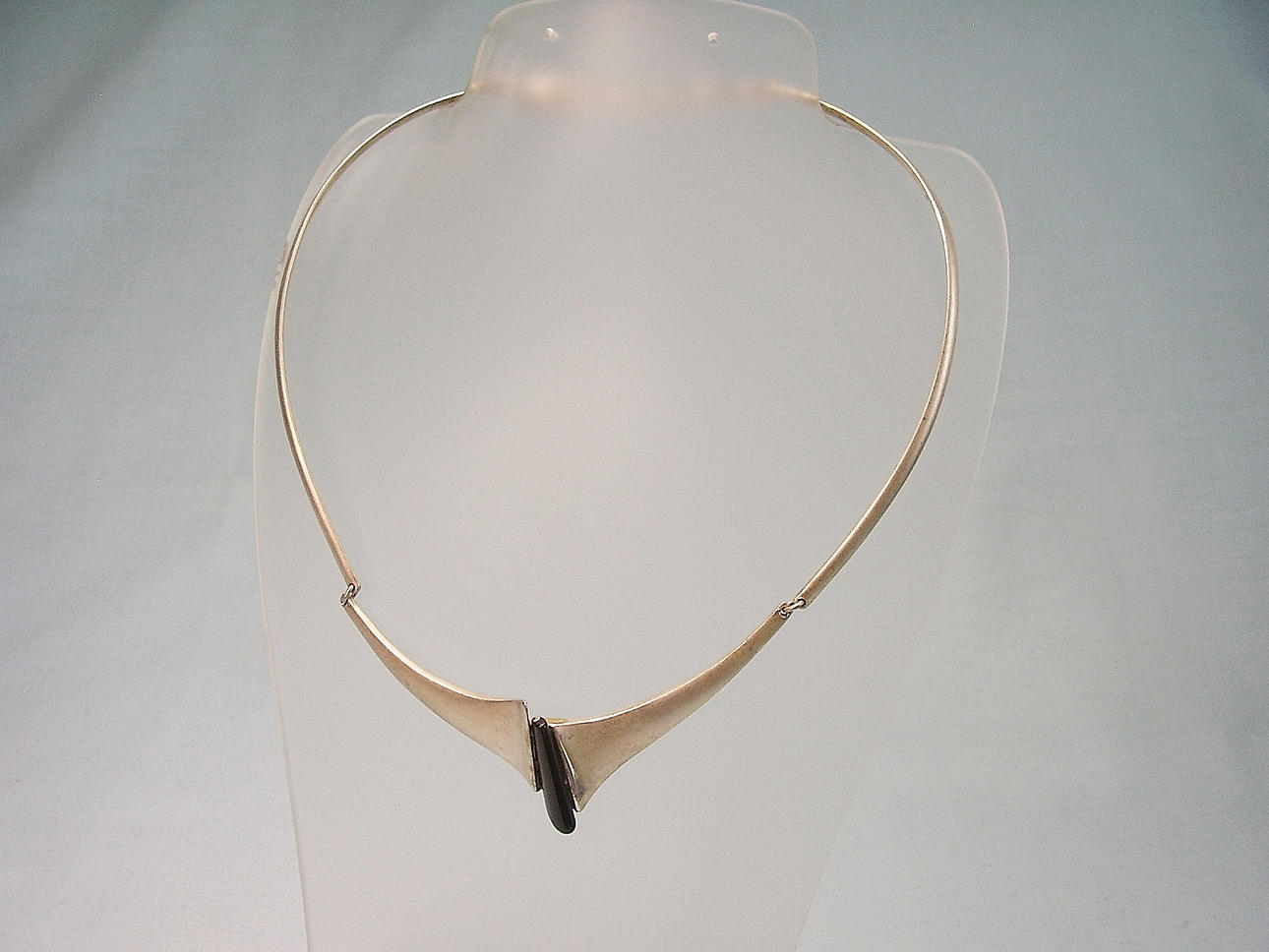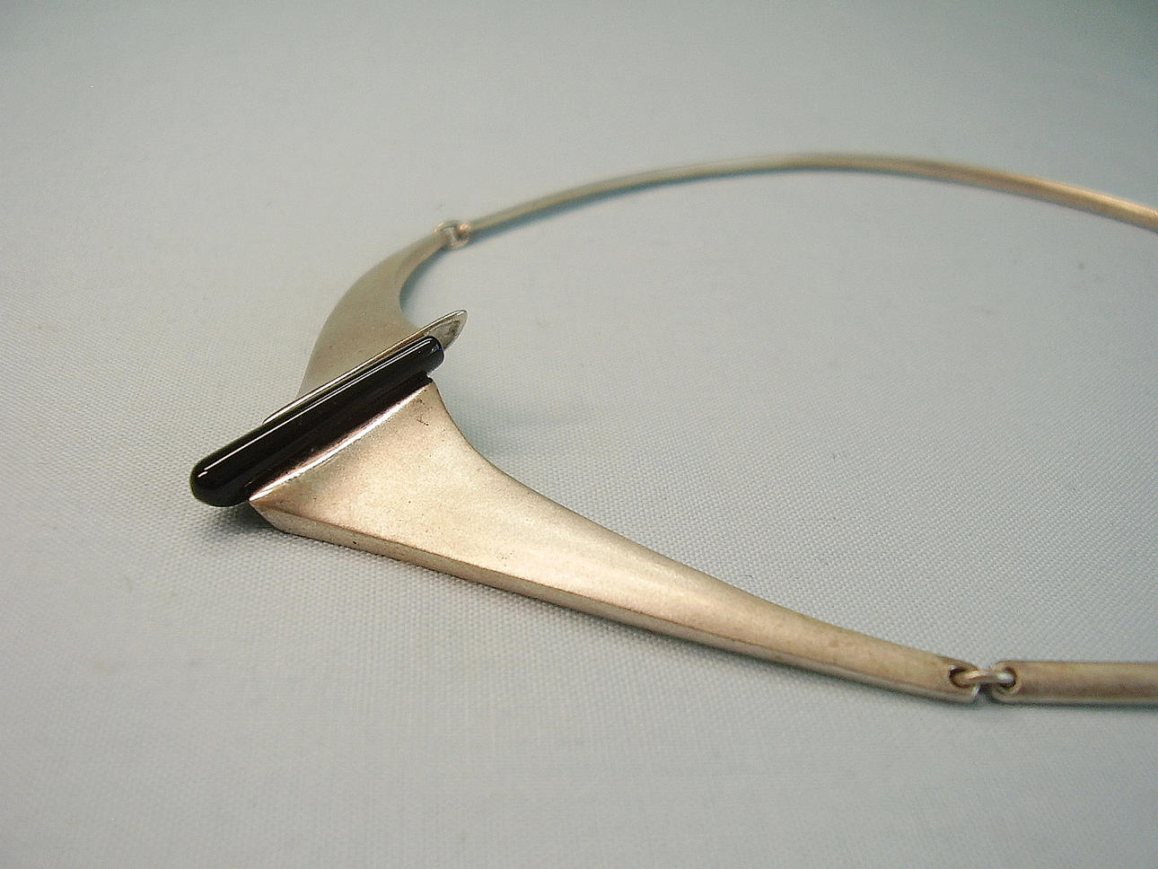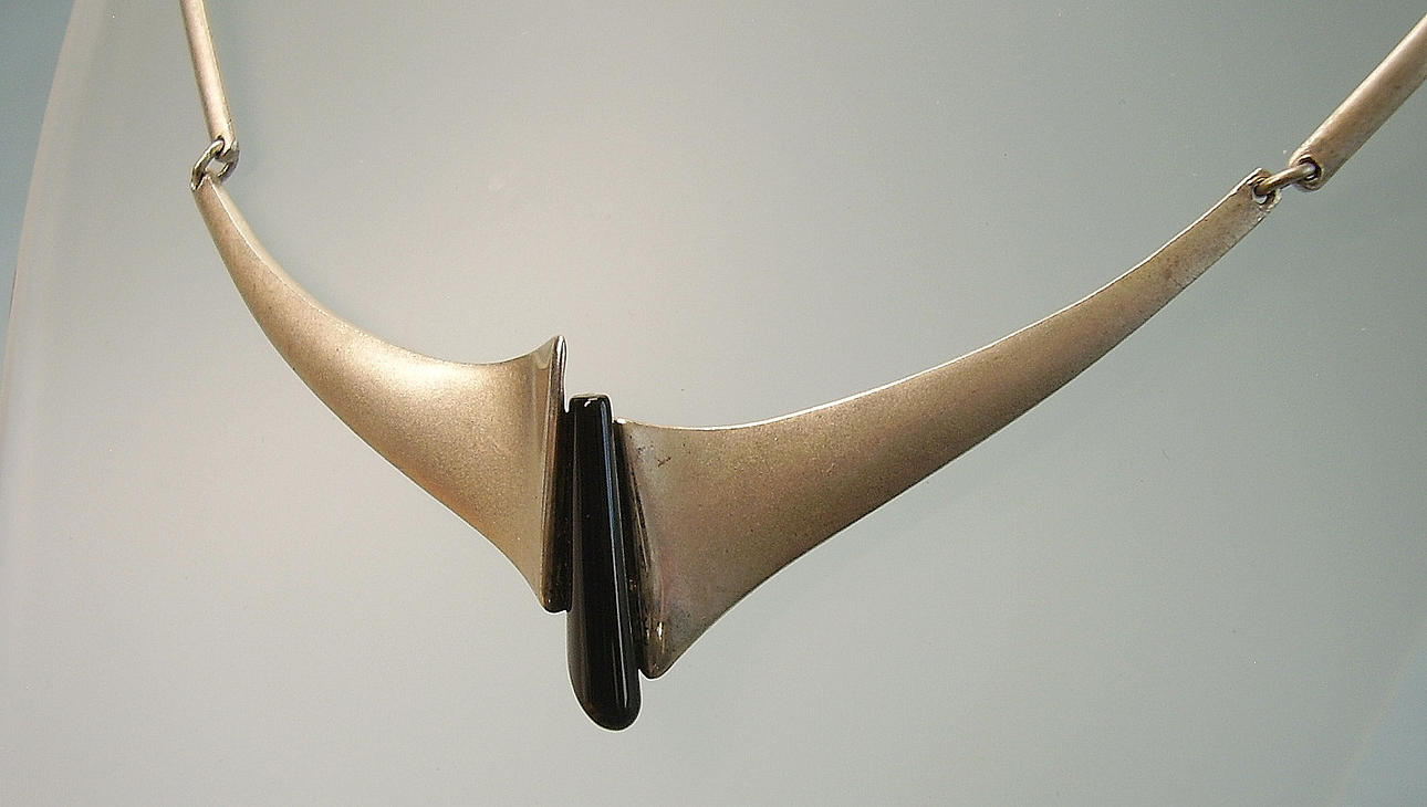 Es hat ein eingearbeitetes Mittelteil aus satinierten Partien, die zwischen sich ein poliertes schwarzes Onyx-Segment tragen. Durch weitere satinierte Bänder und eine Ösenkette mit Karabinerverschluss kann das Collier geöffnet werden.