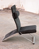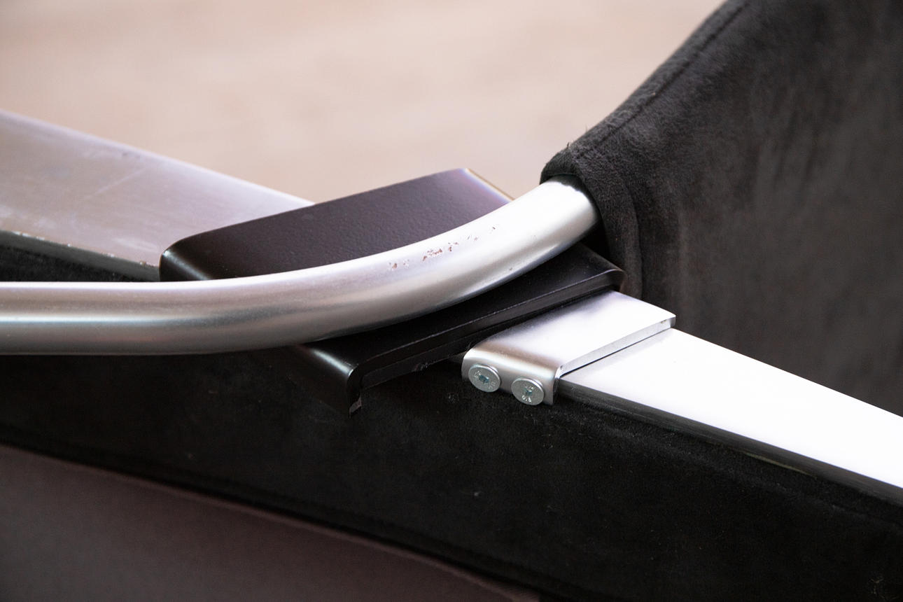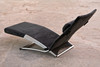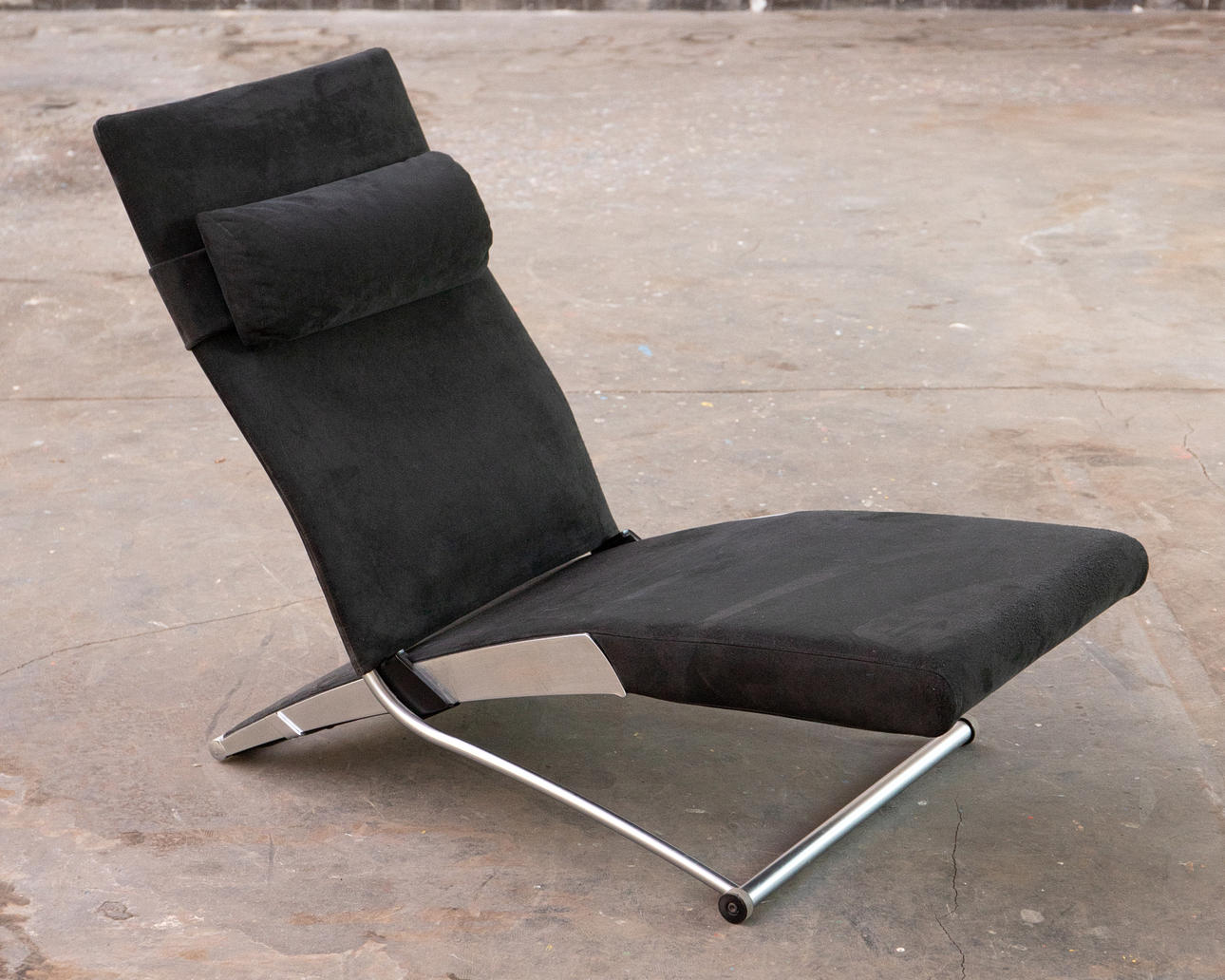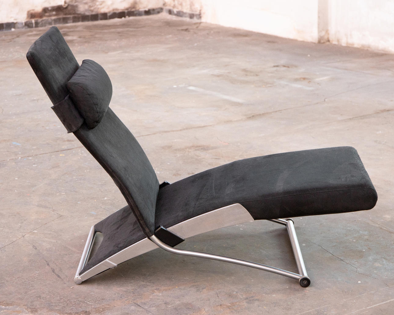 Chaiselounge / Relax Sessel Model X Chair. Mehrfach, stufenlosverstellbare Konstruktion aus mattverchromtem Metall mit Bezügen in schwarzem Alcantara. H. 68,5-108, B. 62, T. ca. 105-150 cm.