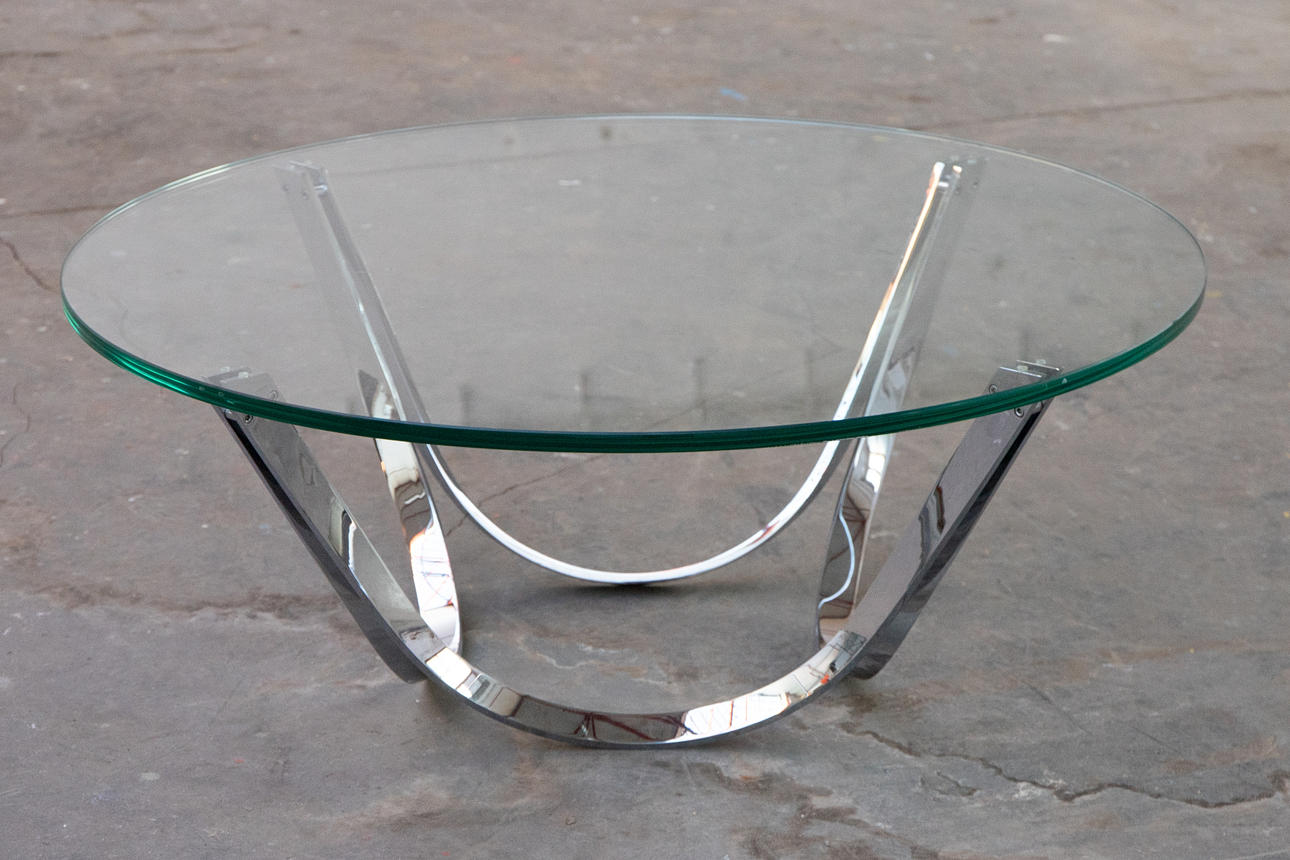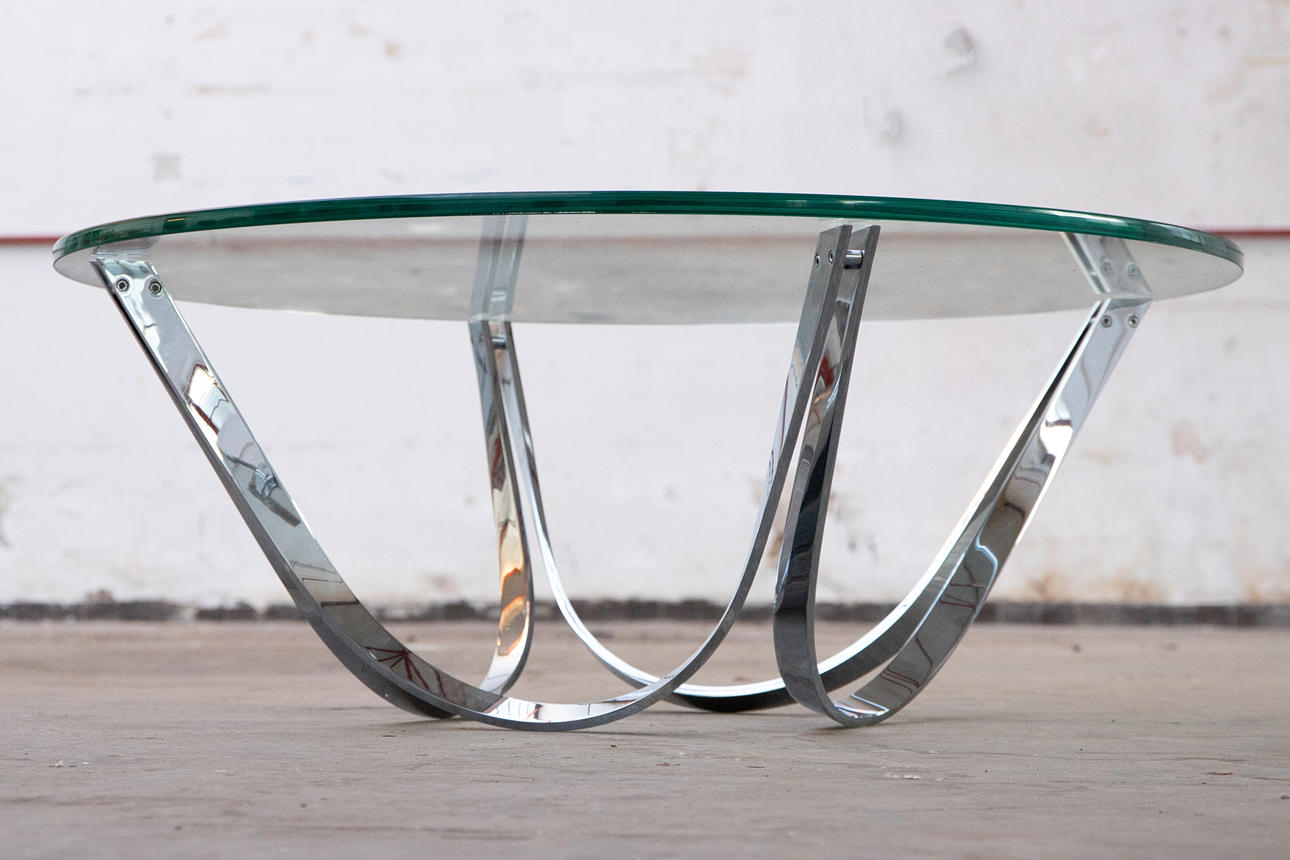 Midcentury Coffee Table / Sofatisch. Entwurf der 1960/70er Jahre für Dunbar Furniture. Verchromtes Metall, Glasplatte. H. 44, D. 110 cm.