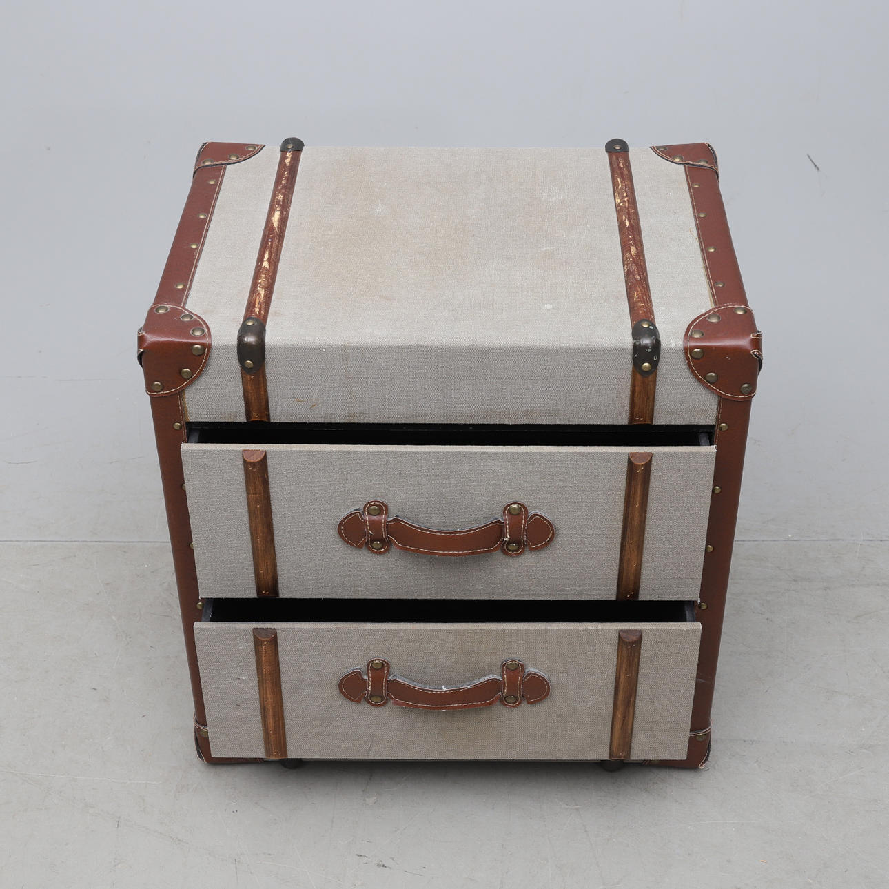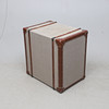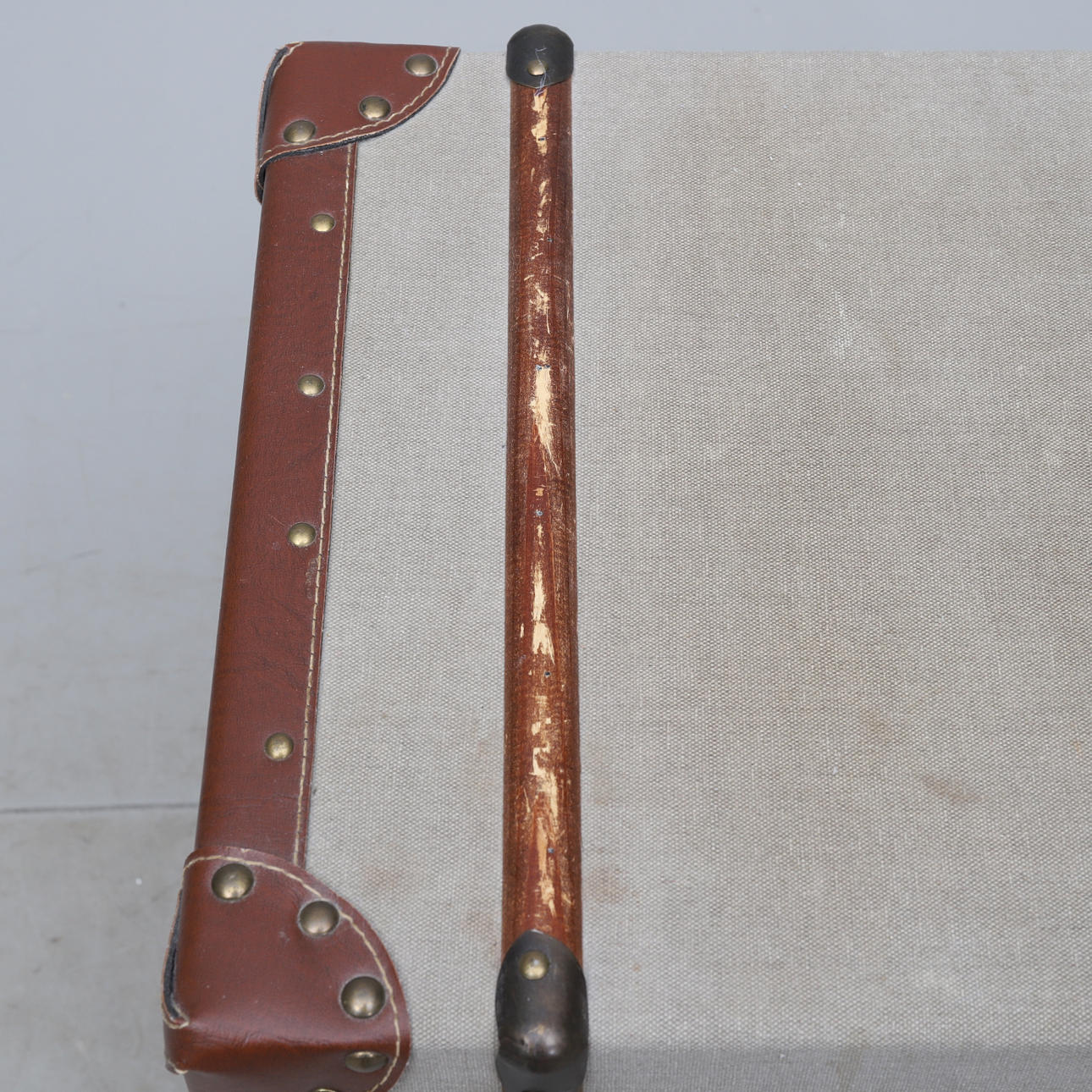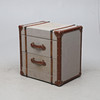Bespannt mit Segeltuch, Details aus gebeiztem Holz und Kunstleder. Zwei Boxen. Länge ca. 57, Breite 40, Höhe 58 cm.