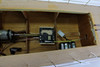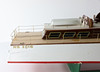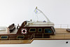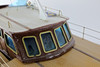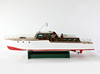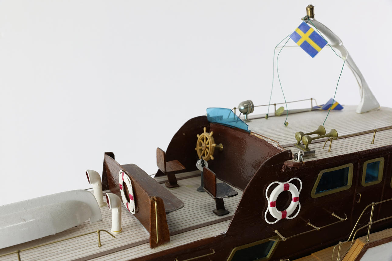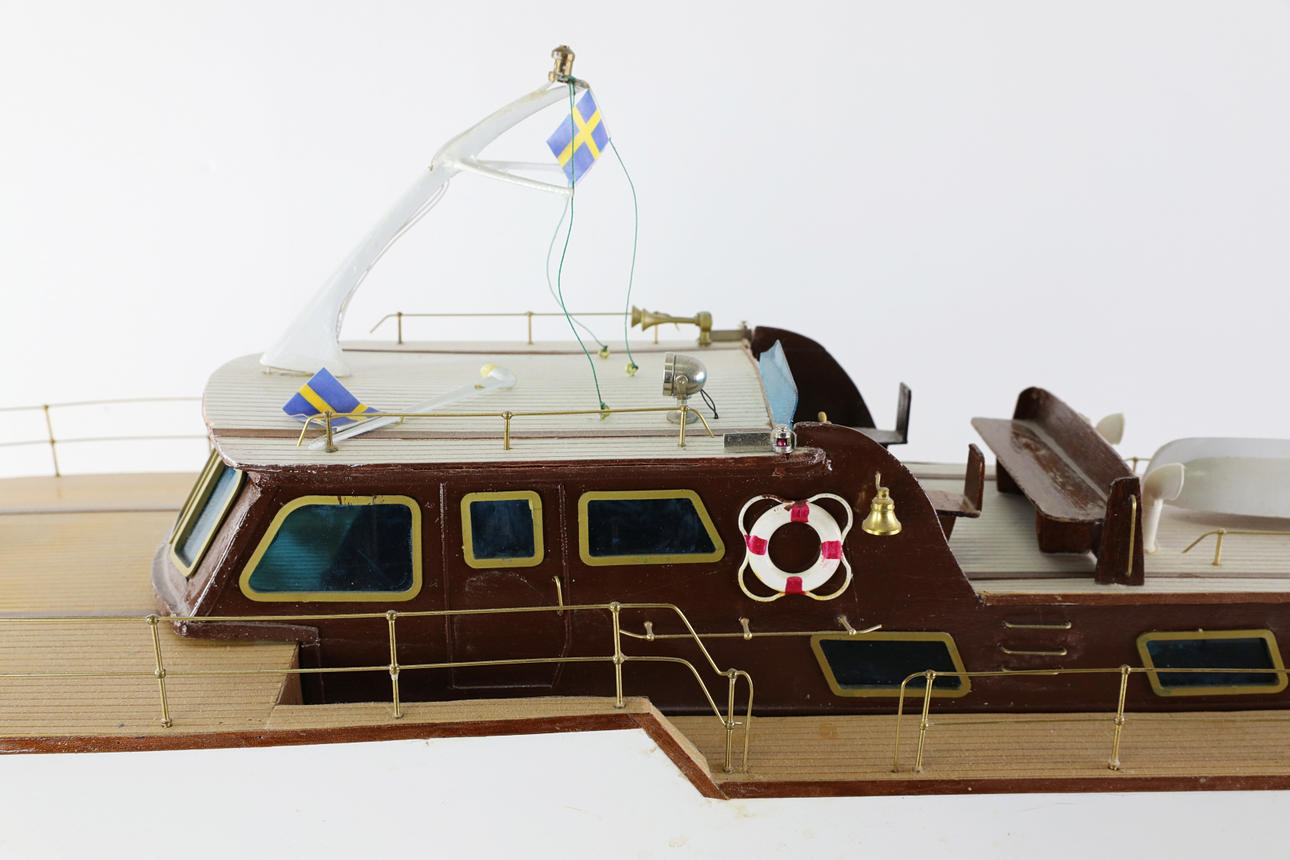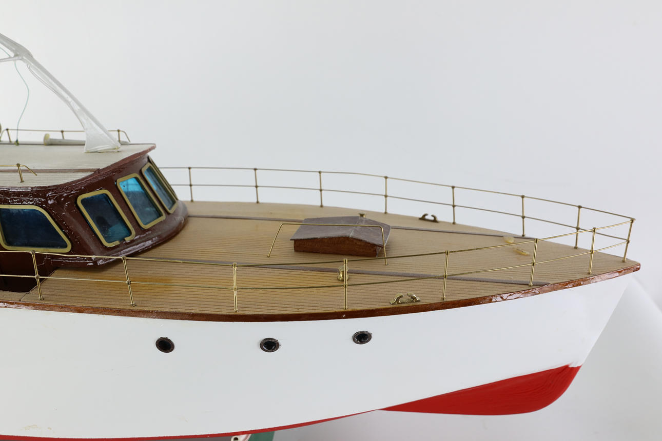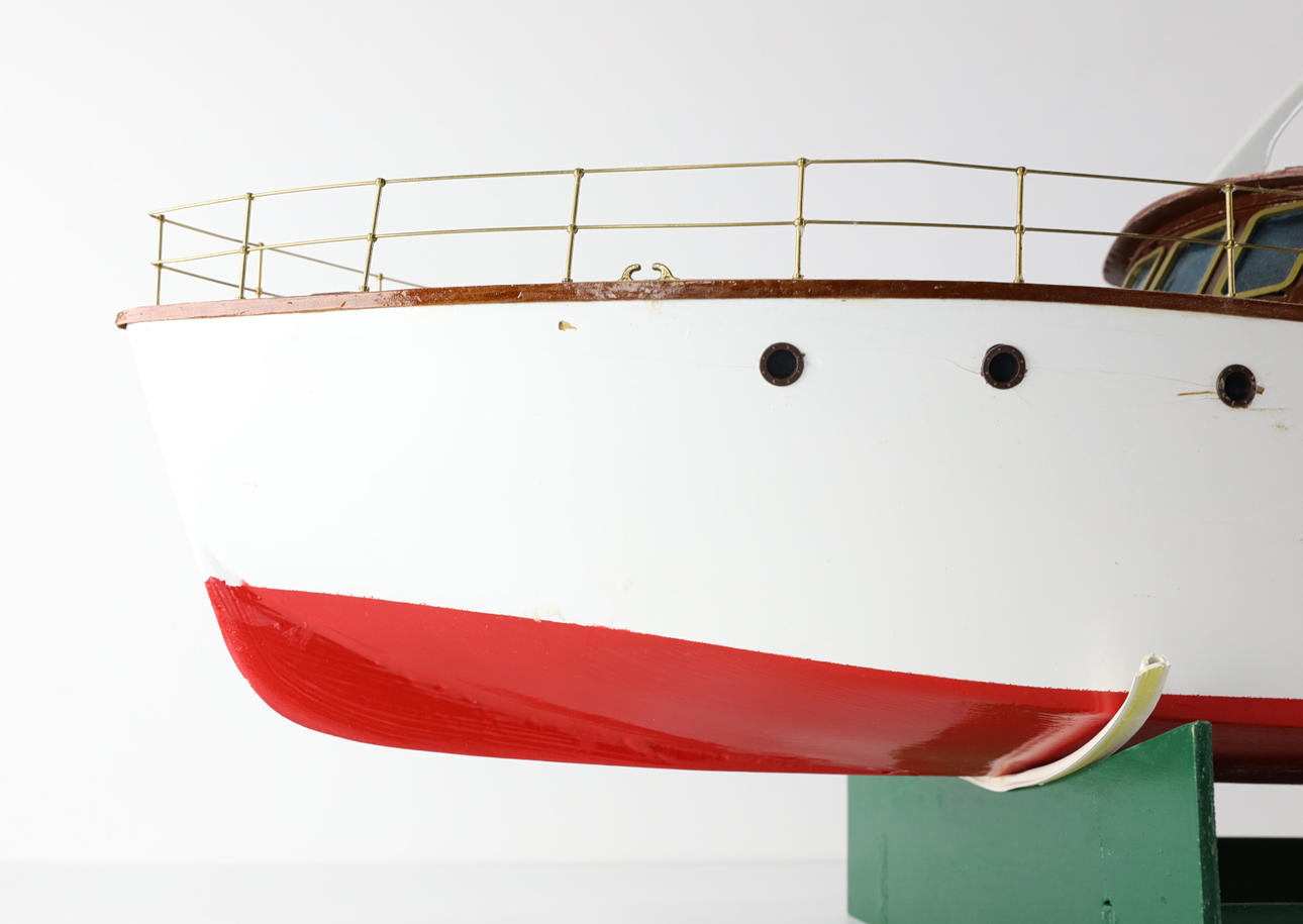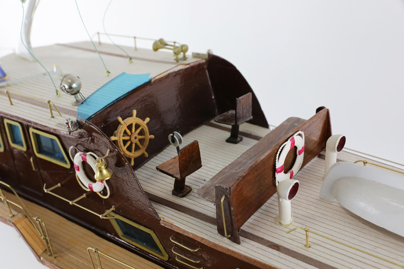 Funkgesteuertes Modellboot aus Holz, auf Ständer.