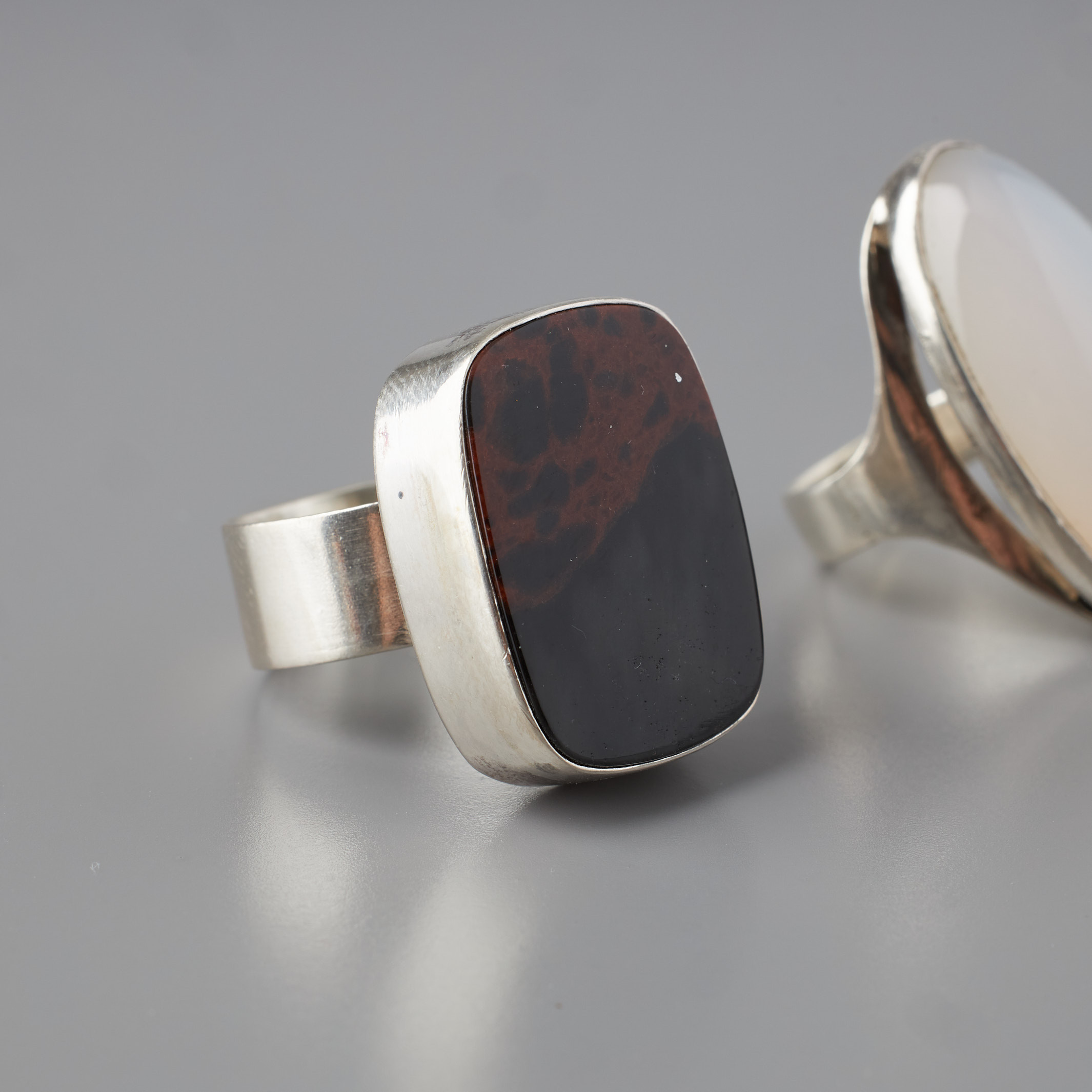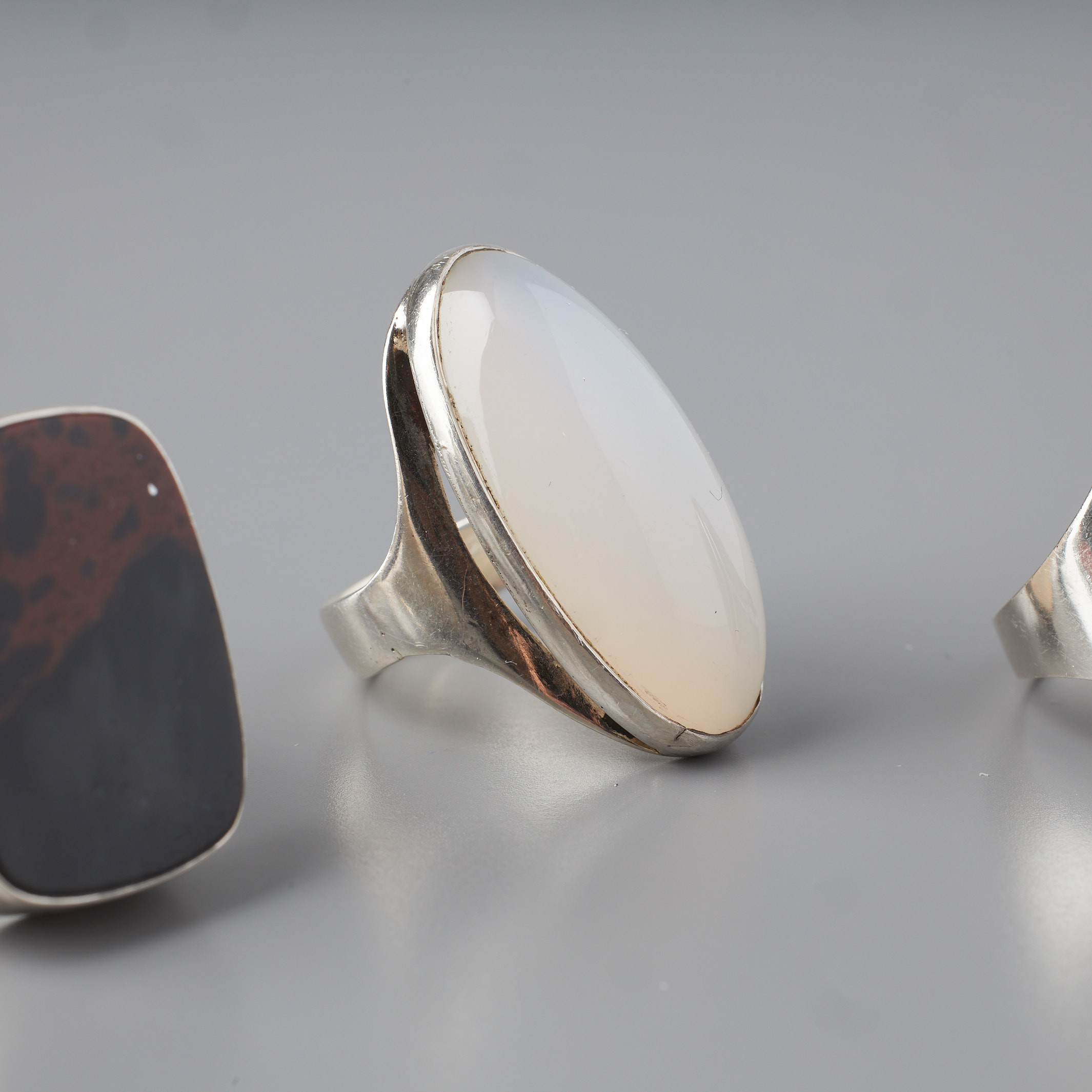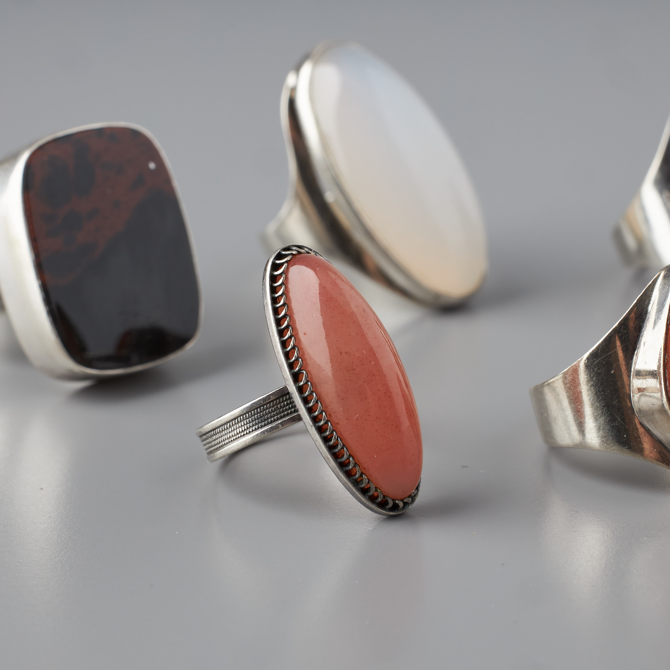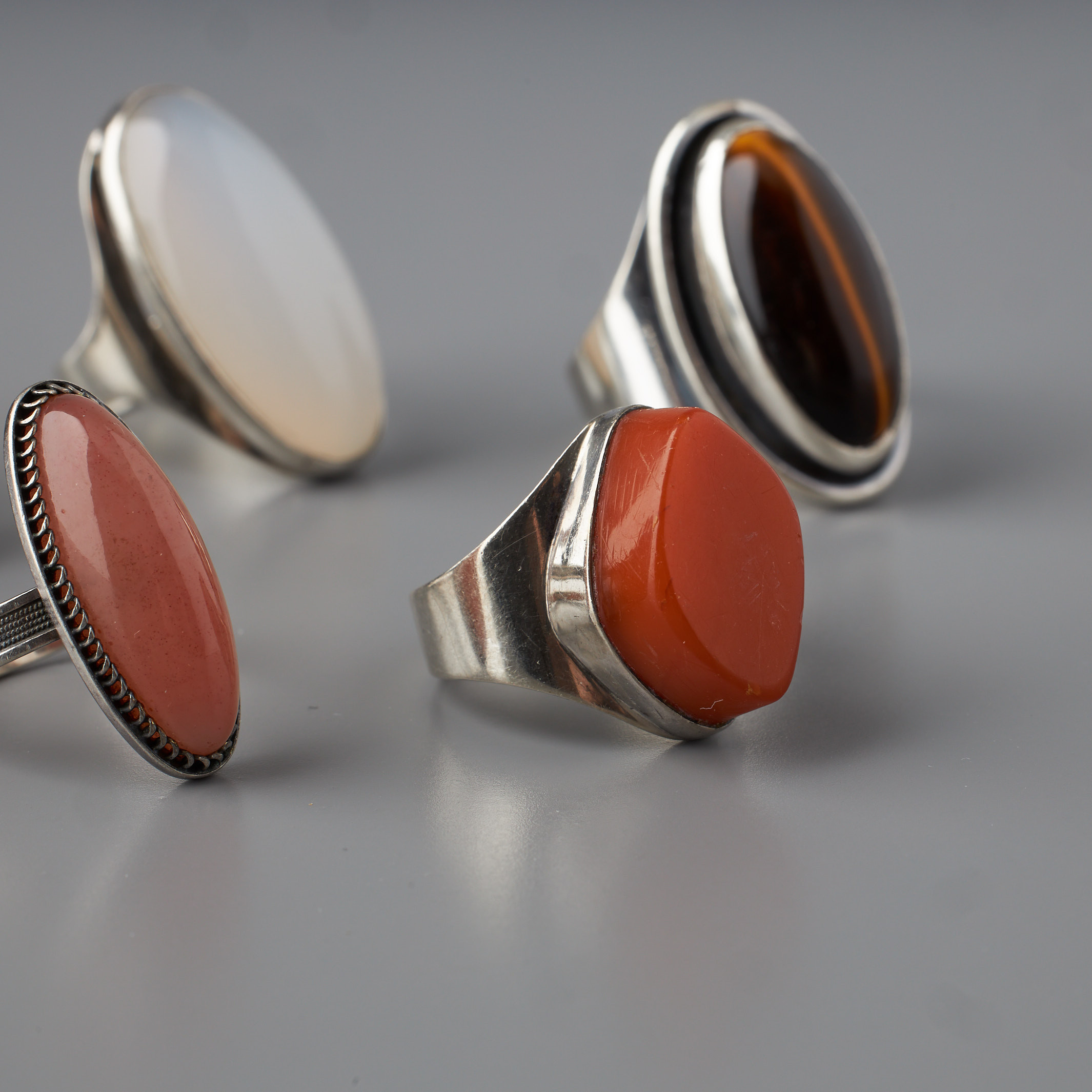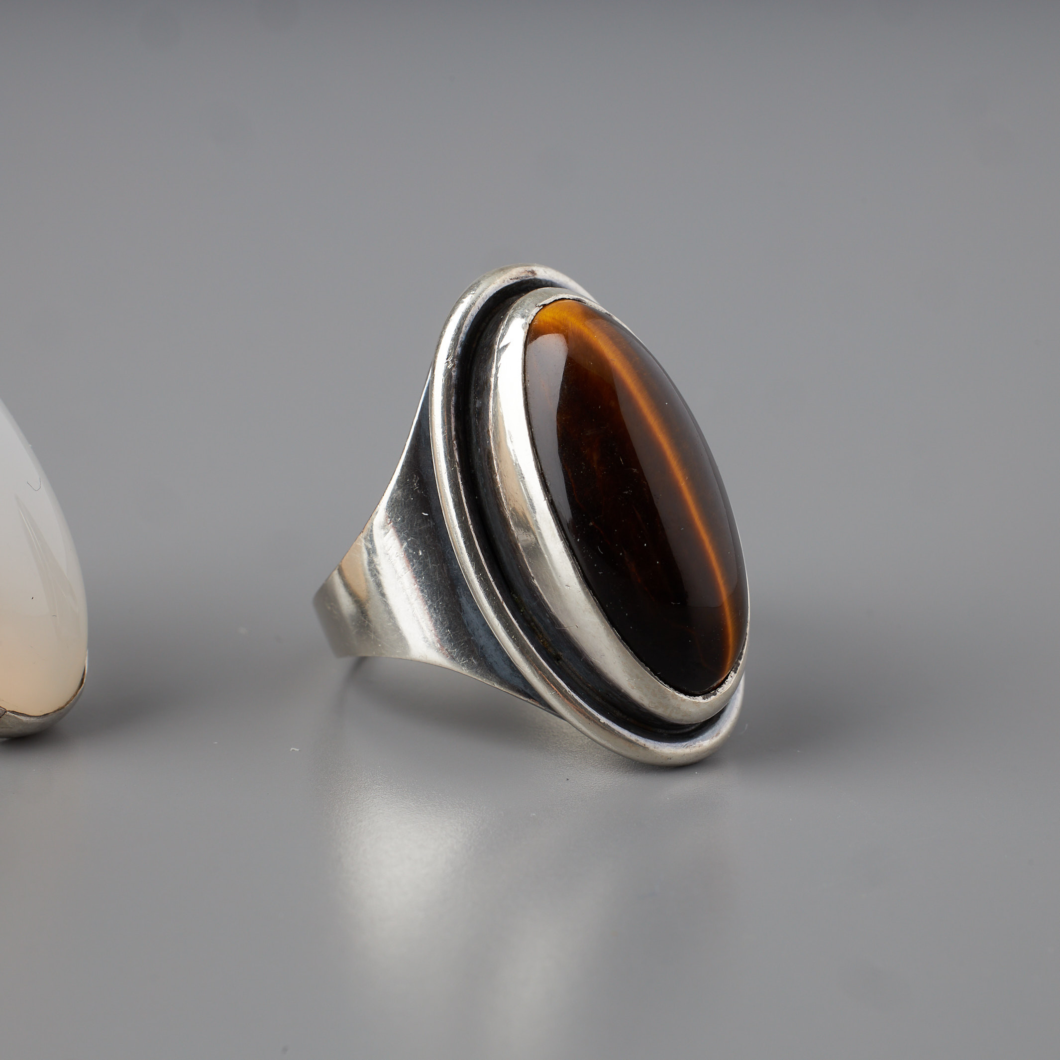 2603392. RINGE, 5 Stück, Silber, Bernstein, Tigerauge, Chalcedon.