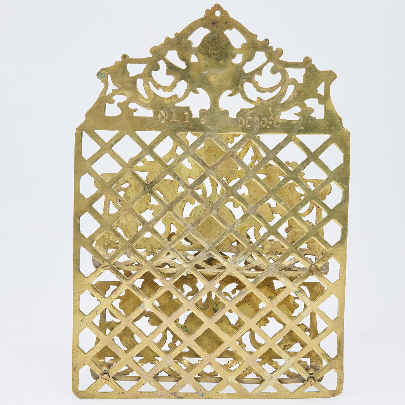 Zeitungshalter aus goldfarben patiniertertem sowie ornamental durchbrochenem Messingguss, mit zwei Fächern, mit Voluten und animalisch-floralen Elementen dekoriert, rückseitig mit 'D L I.' sowie unleserlich bezeichnet, H.31, B.22, T.7cm.