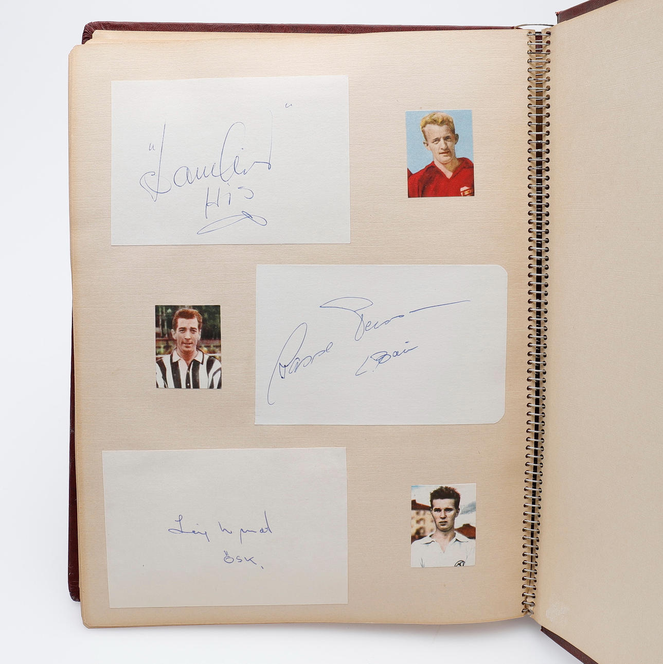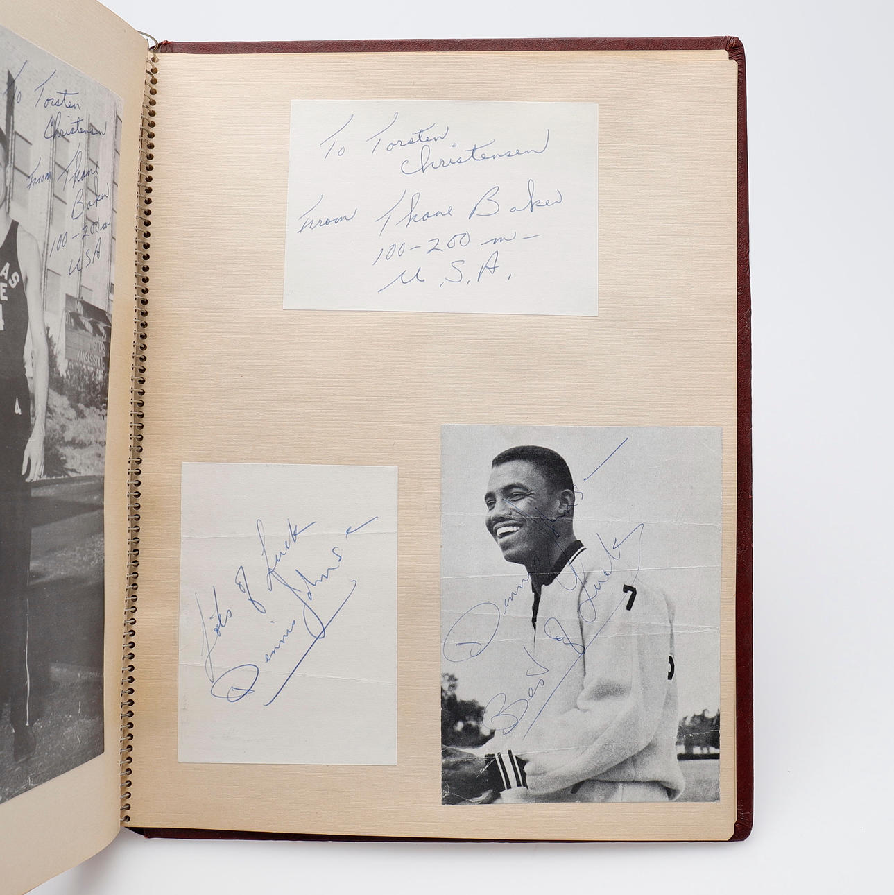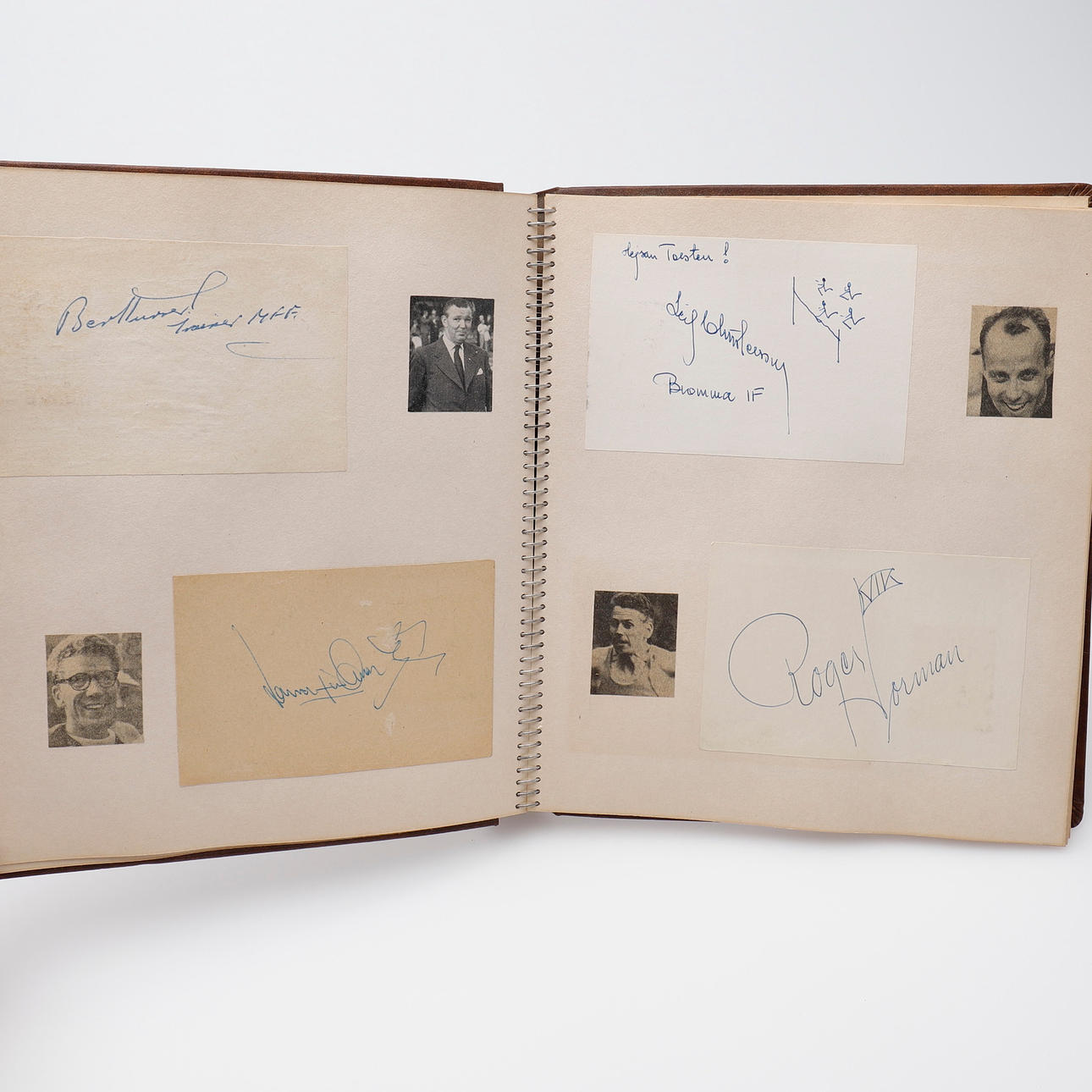 Zwei Autogrammalben mit etwa 75 meist schwedischen Namen repräsentierten viele verschiedene Sportarten, zum Beispiel Fußball, Eishockey und Leichtathletik. Beachten Sie, dass die Autogramme sehr schön in das Album eingeklebt sind. Die Unterschriften sind durch das Einfügen nicht betroffen. Allerdings kleben sie auf beiden Seiten der Blätter, was bedeutet, dass sie nicht ohne große Schwierigkeiten getrennt werden können. Einige Namen sind Armin Hary, Di Stefano, Jean Boliveau, Andy Stanfield, Viking Palm, Bob Mathias, Al Oerter, Ralph Boston, Harry Gregg, John Charles, Sugar Ray Robinson. Max Schmeling, Dawn Frazier, Roger Bannister und zahlreiche schwedische und internationale Fußballspieler.