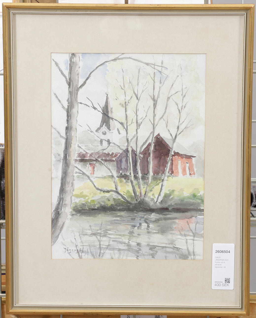 2606504. DAVID JÄGERSKOGH. Kirche am Fluss, Aquarell, signiert.