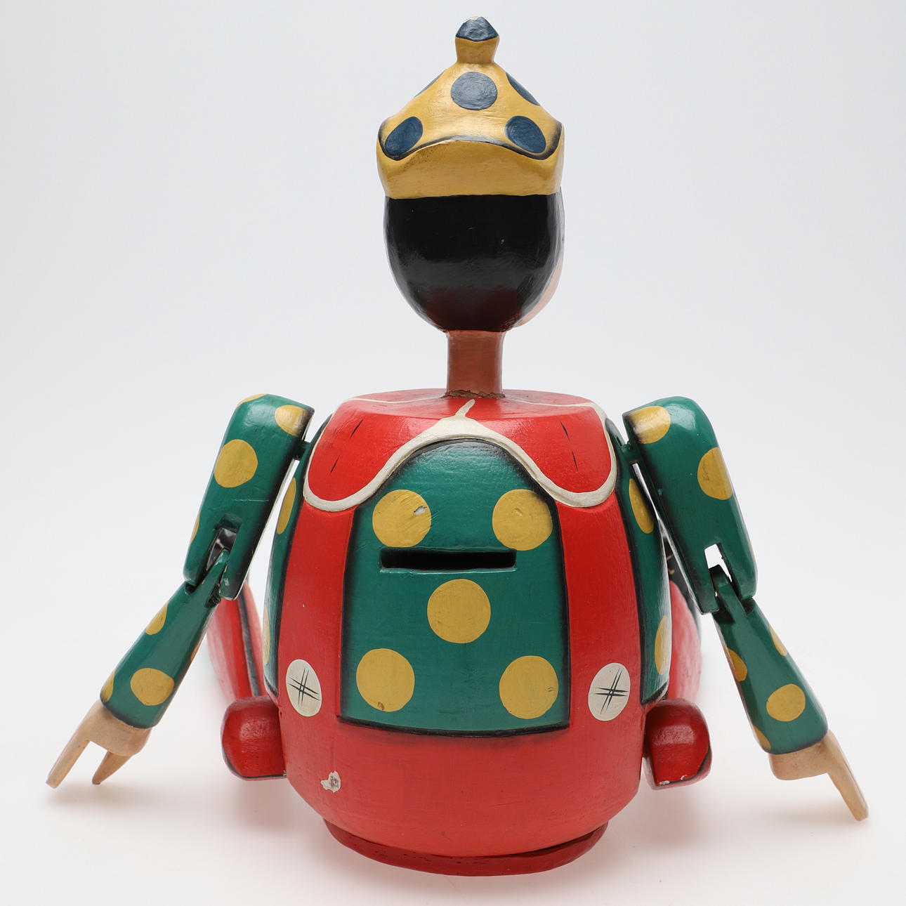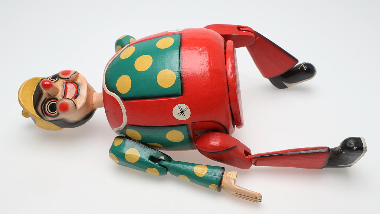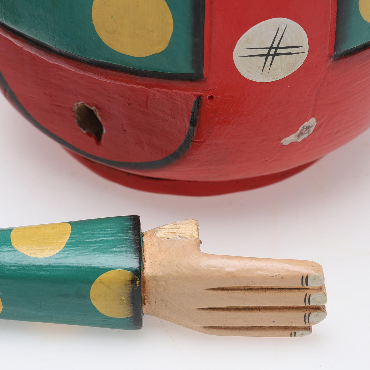 Lockere Gelenke für bewegliche Funktionen, Abplatzer im Daumen an einer Hand, Verschleiß, Kratzer/Flecken in Holz und Farbe. Lockerer Hals.