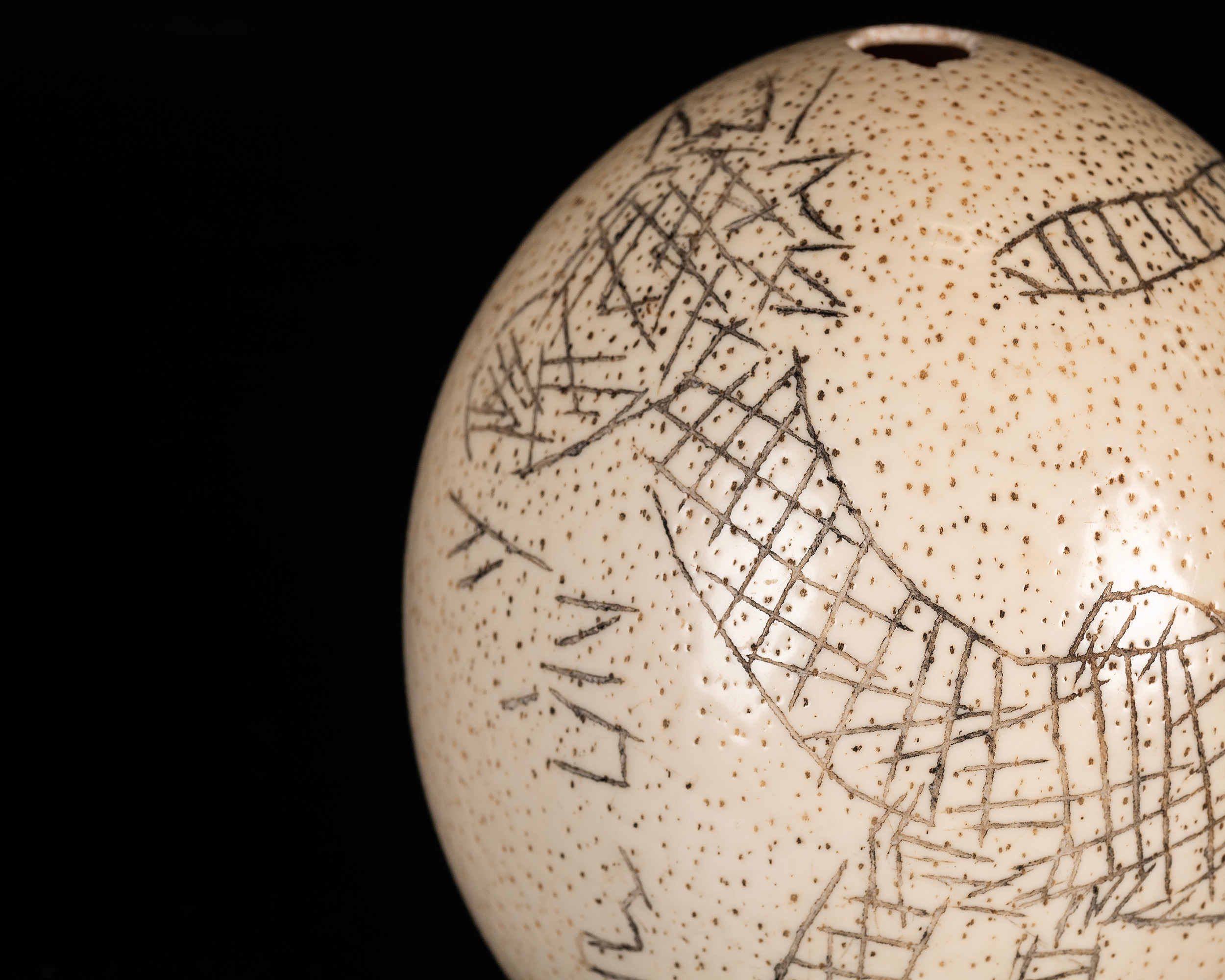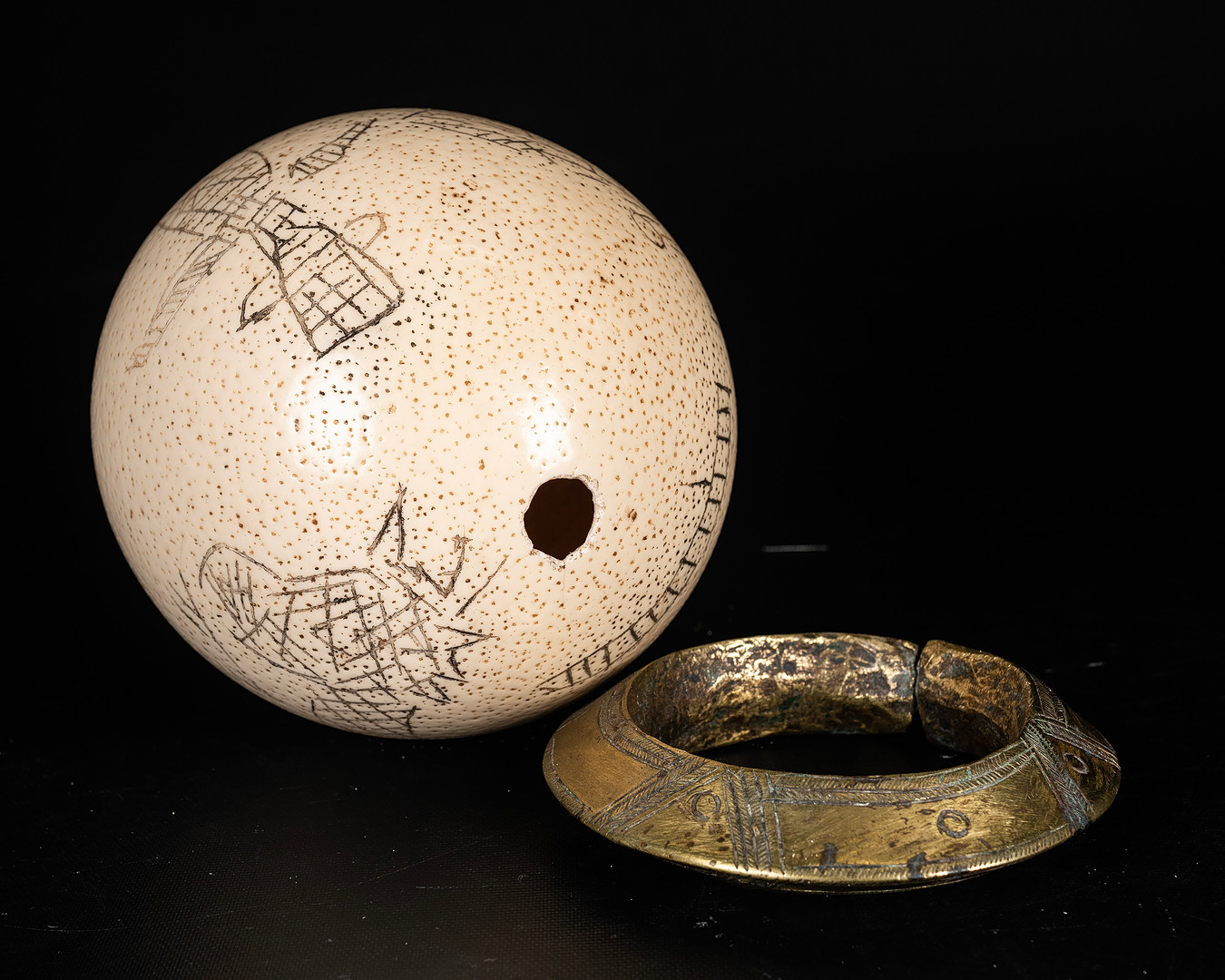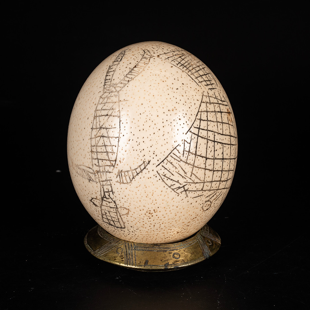 2632500. VERZIERTES STRAUSSENEI mit Messingständer.