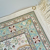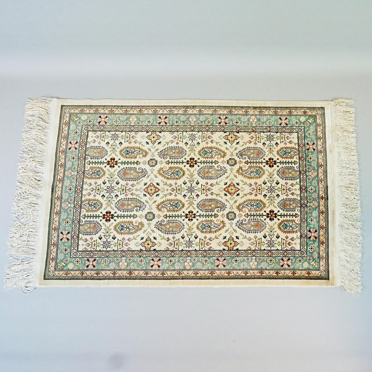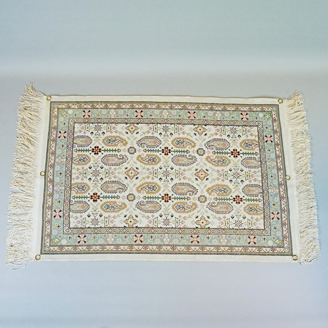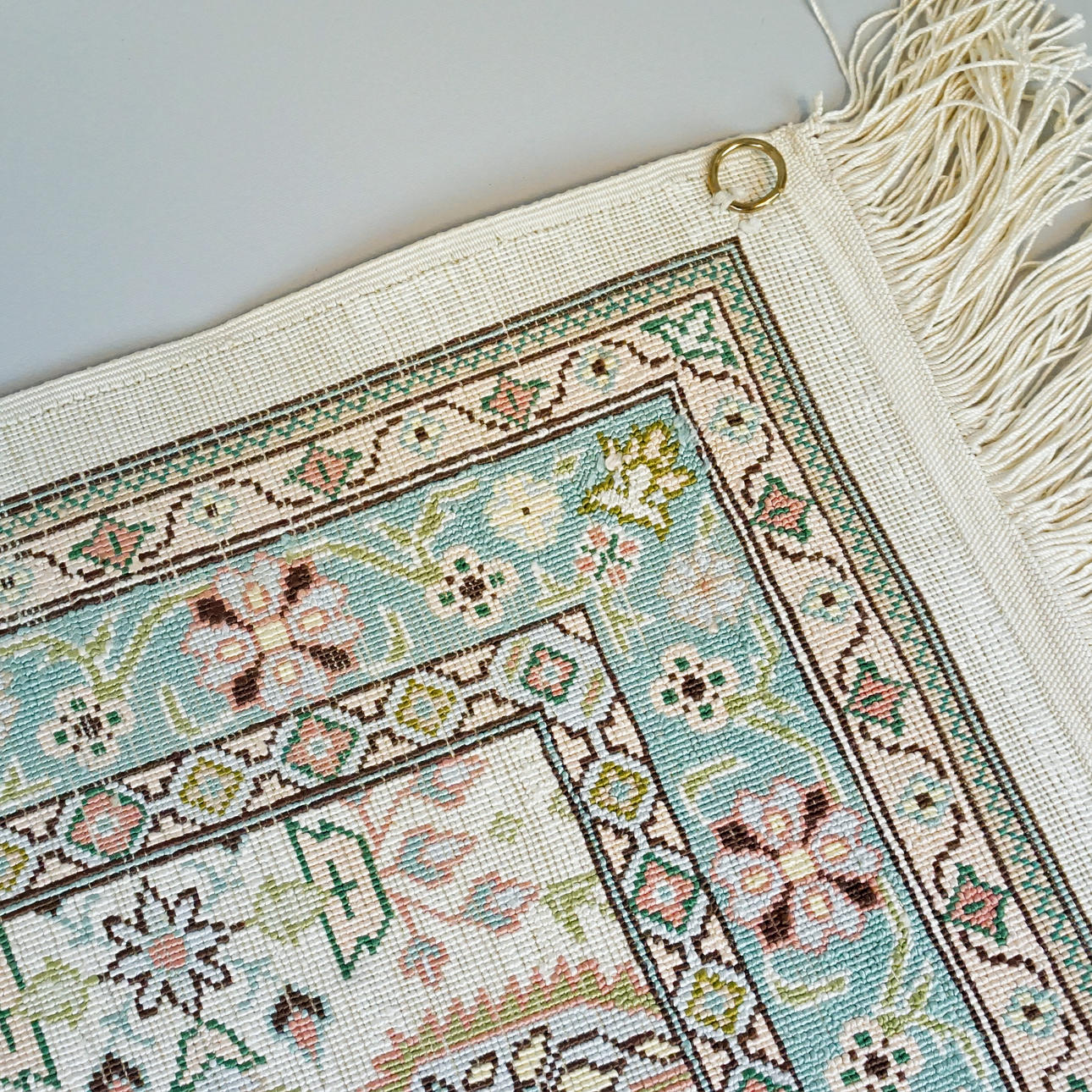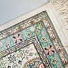 Hereke-Matte, beige, grün, blaues Muster auf hellbeigem Hintergrund. Größe 75 x 51 cm. Prospekt und Zertifikat inklusive.