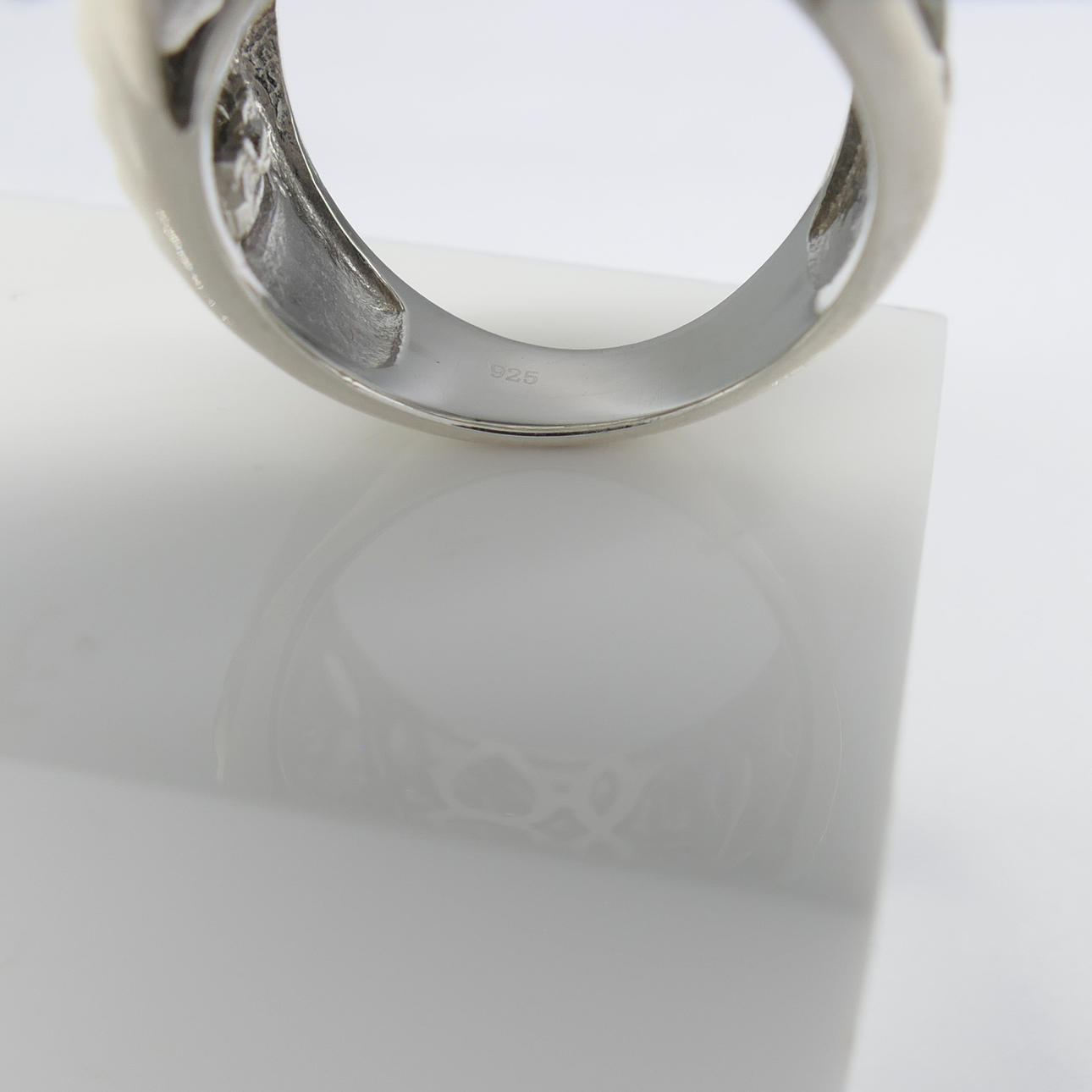 Der Ringkopf (Platte) misst 15 x 14 mm. Die Schultern sind im Stil eines gerippten Armbanduhrarmbands gestaltet.