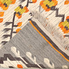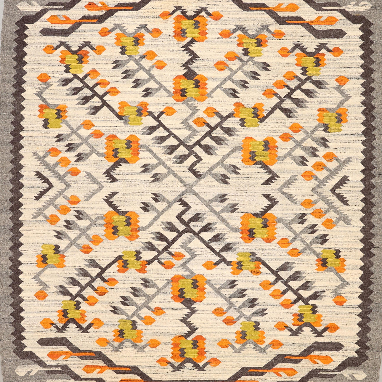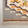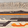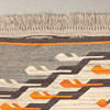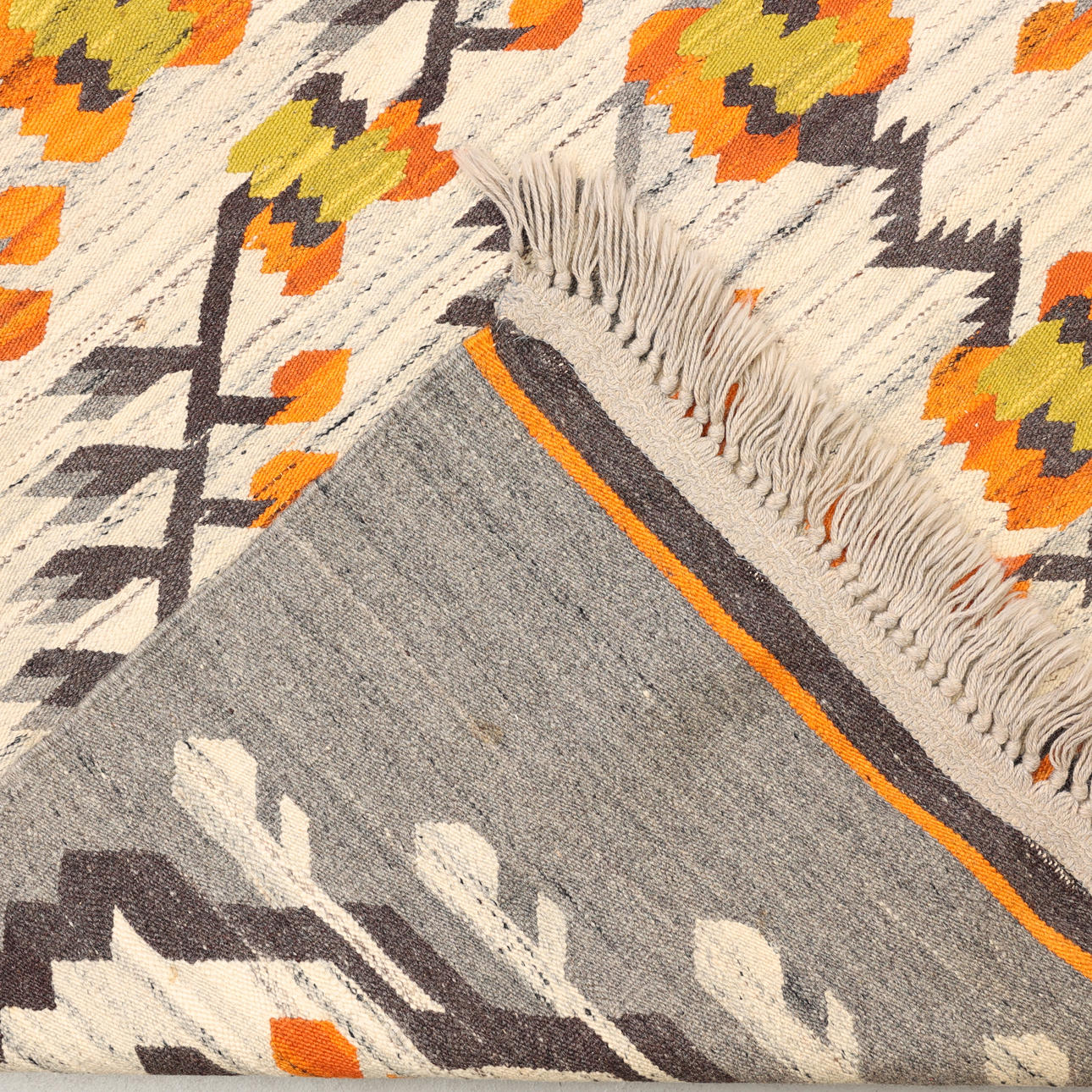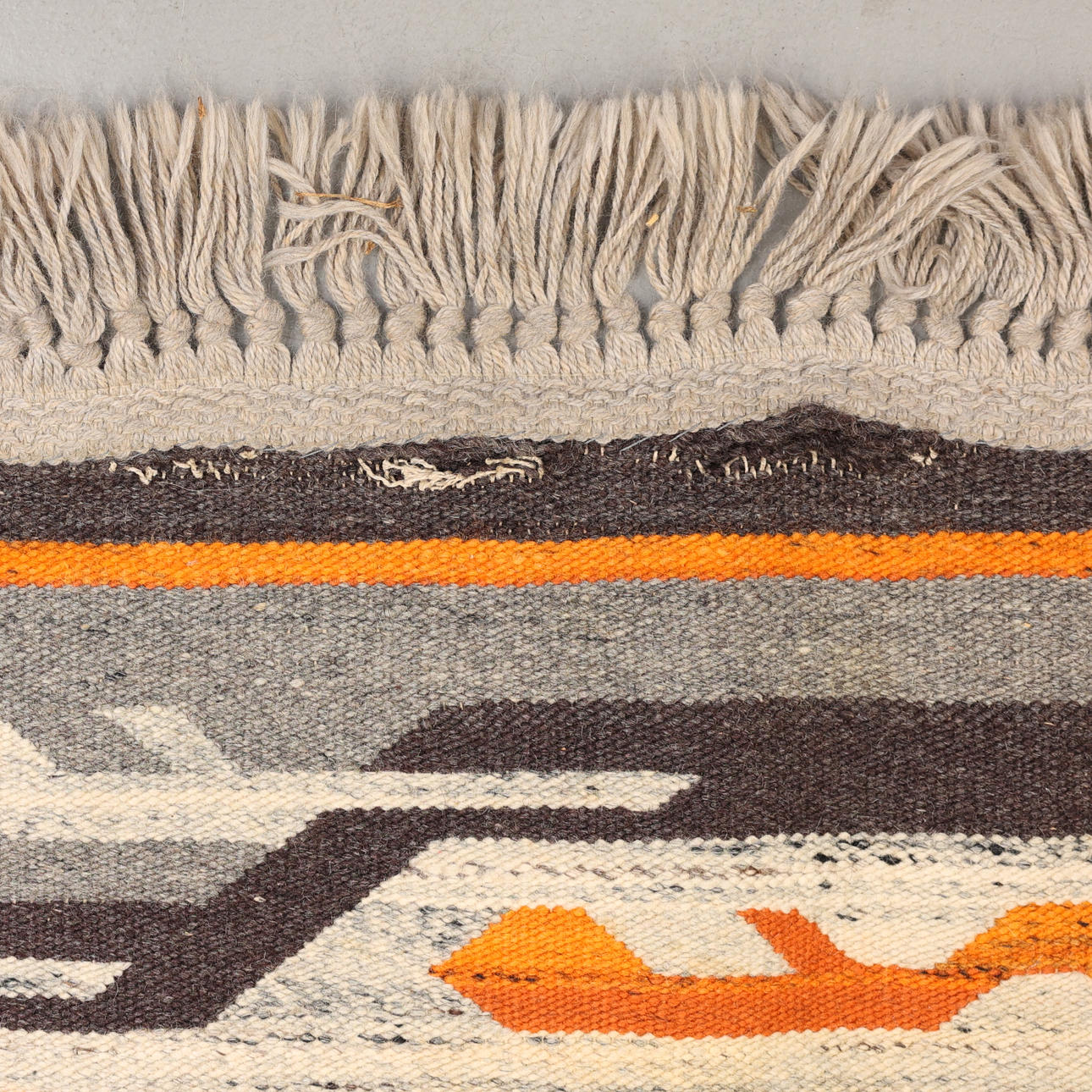 Flachgewebter Teppich aus Wolle mit angenähten Fransen. Polychromes geometrisches Muster.
