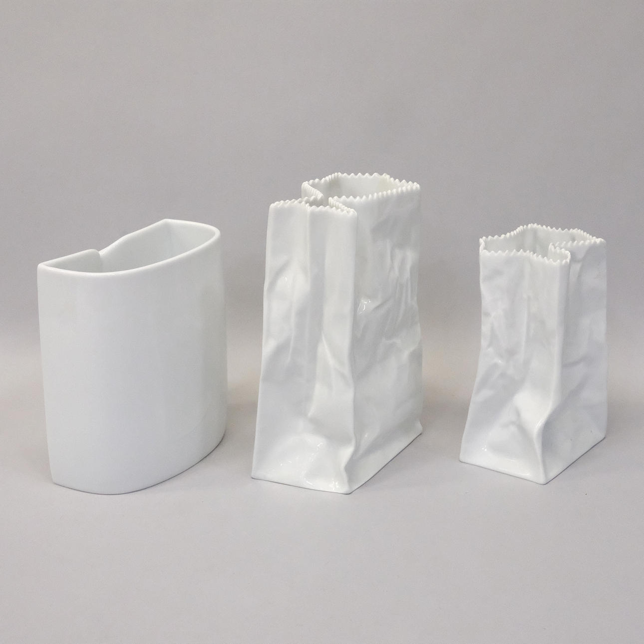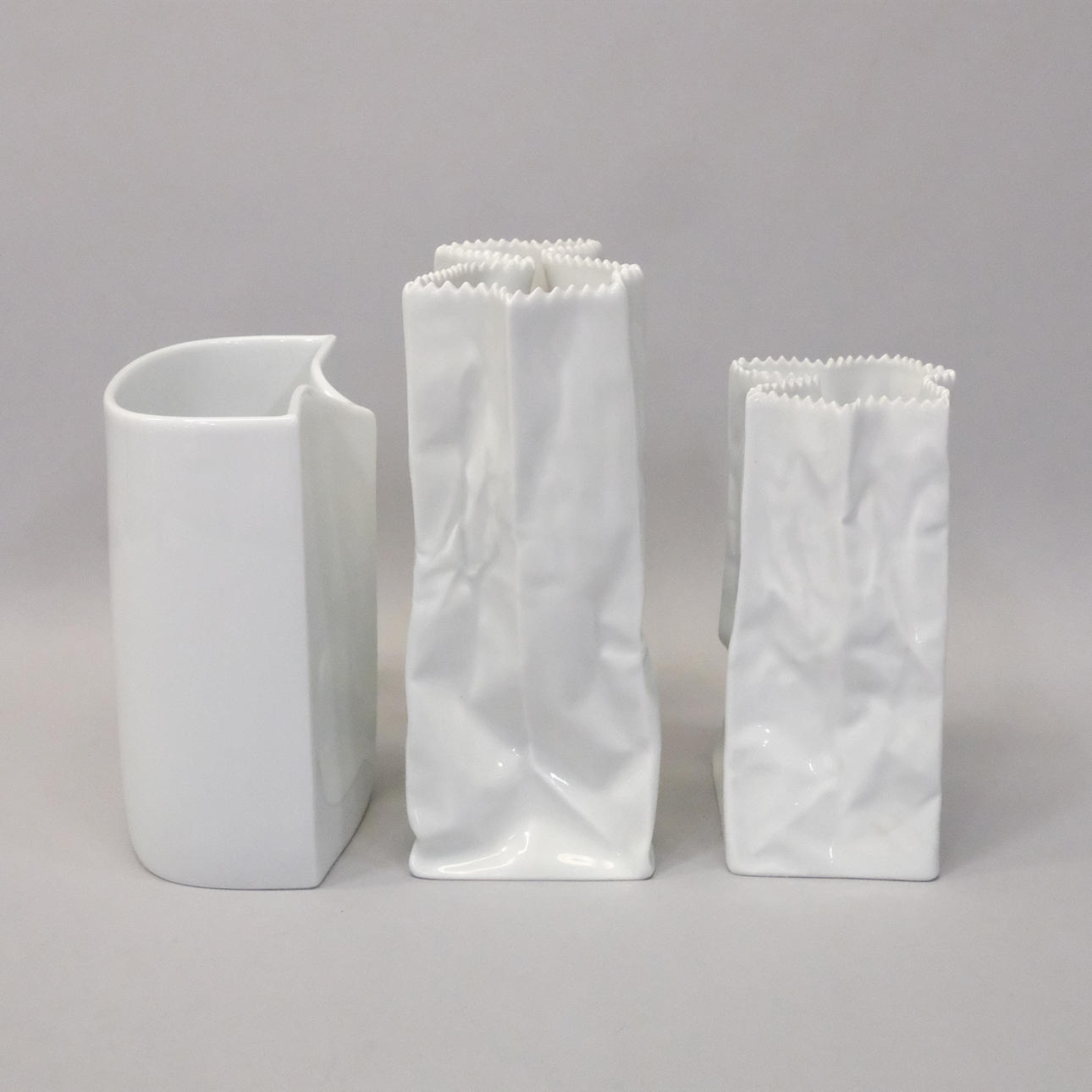 Tapio Wirkkala. "Papiertütenvasen", zweiteilig. Am Boden bezeichnet Rosenthal, Studio-Line Germany, und mit Wirkkalas Unterschrift. Höhenmaße: ca. 15 bzw 19cm.