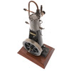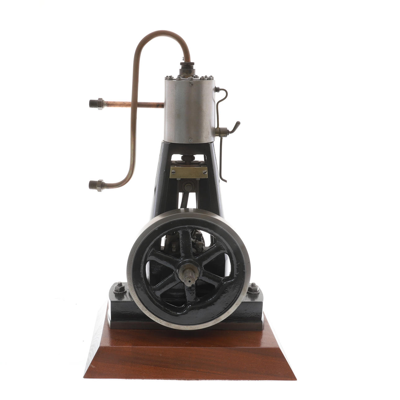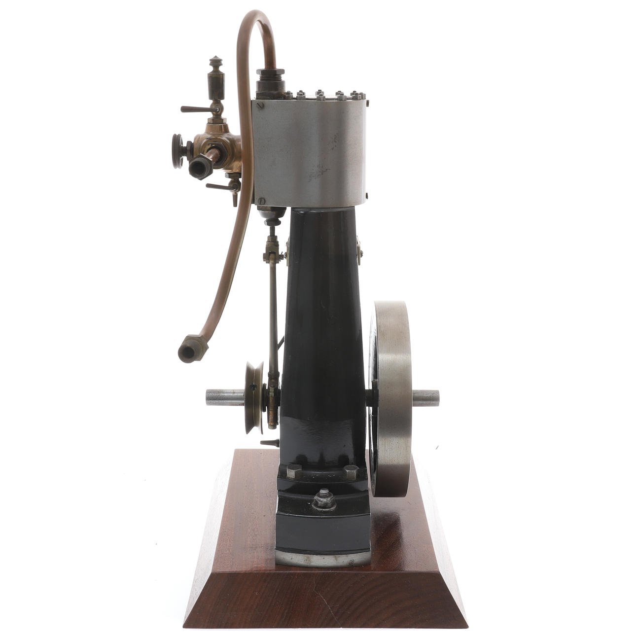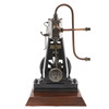 Zylinder 37,5 x 37,5 (Bohrung und Hub/mm), Schwungrad aus Gusseisen, 140 x 22 (Durchmesser und Breite der Stirnseite/mm), Kolbenventil, das durch einen einzelnen Exzenter betätigt wird, ausgestattet mit Schmierleitung zu den Lagern, Ablasshahn und ausgeglichenem Schwungrad V - Riemenscheibe mit 55 mm Durchmesser für 6 mm Rundriemen, Afrormosia-Basis, 24 cm x 18,5 cm x 3,2 cm *** in den 1970er Jahren vom Ingenieur und Naturschützer Jonathan Minns gekauft.