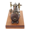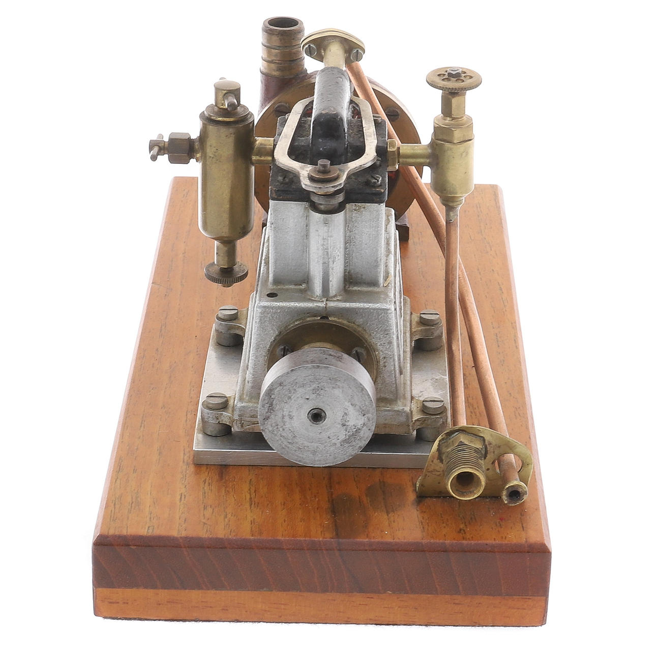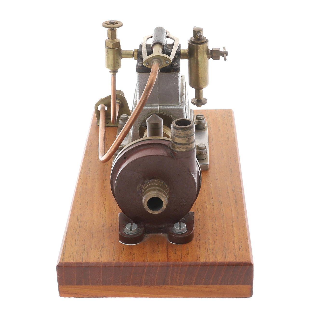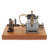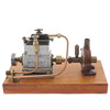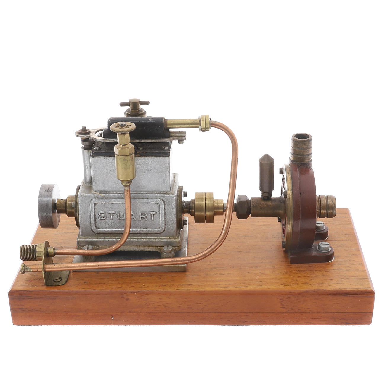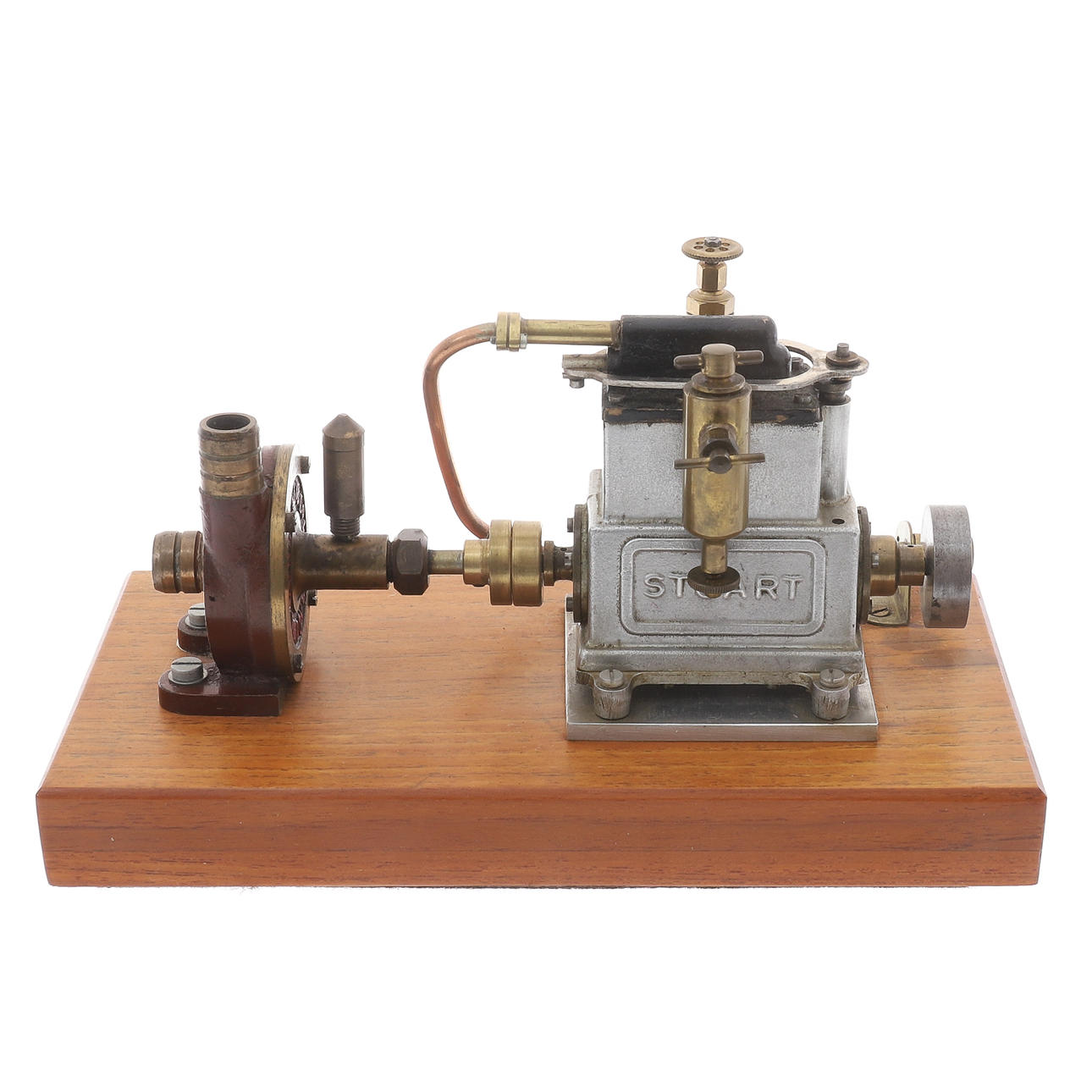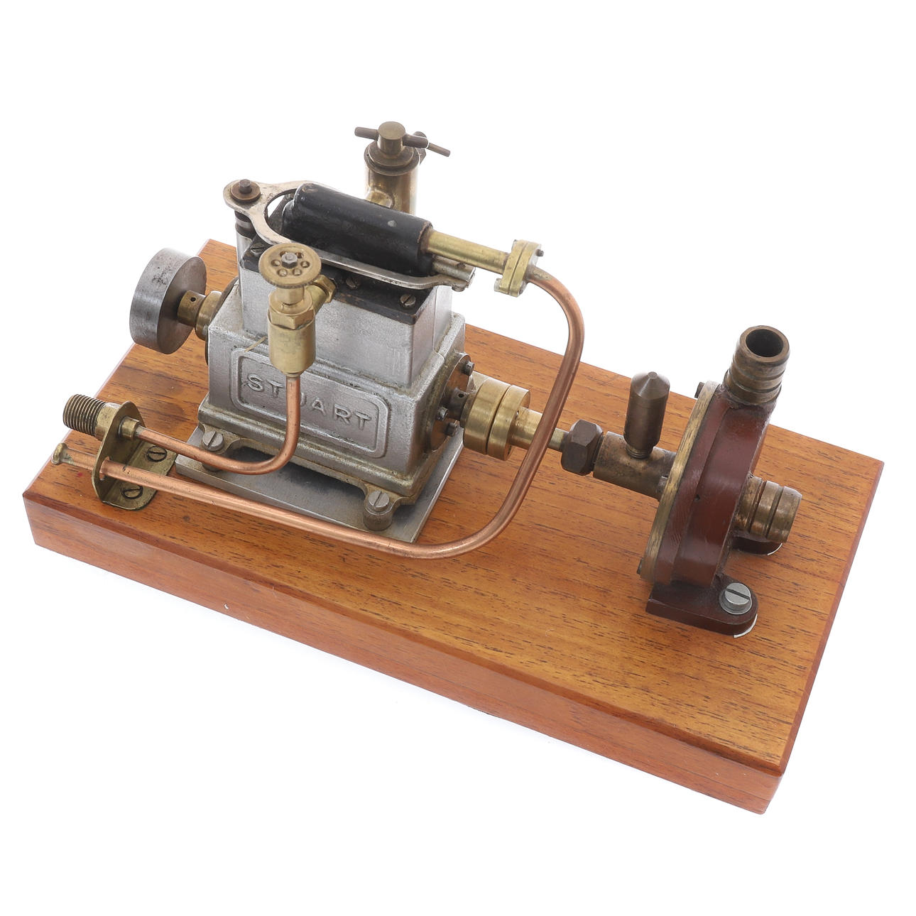 der kleinste Stuart-Zweizylinder-Umkehrmotor, zwei Zylinder 16 x 16 (Bohrung und Hub/mm), Schwungrad aus Weichstahl, 32 x 9 (Durchmesser und Breite der Fläche/mm), Einzelkolbenventil über Zylinderköpfen, im Stil von Westinghouse, Pumpenkörper aus „CC Whitney & Co Ldt (sic) London E11“, Teakbasis, 24 cm x 12,5 cm x 2,7 cm *** Die Stuart-Reihe war „Star“, „Sun“ und „Sirius“ für hoch einfachwirkende Motoren für Rennboote.