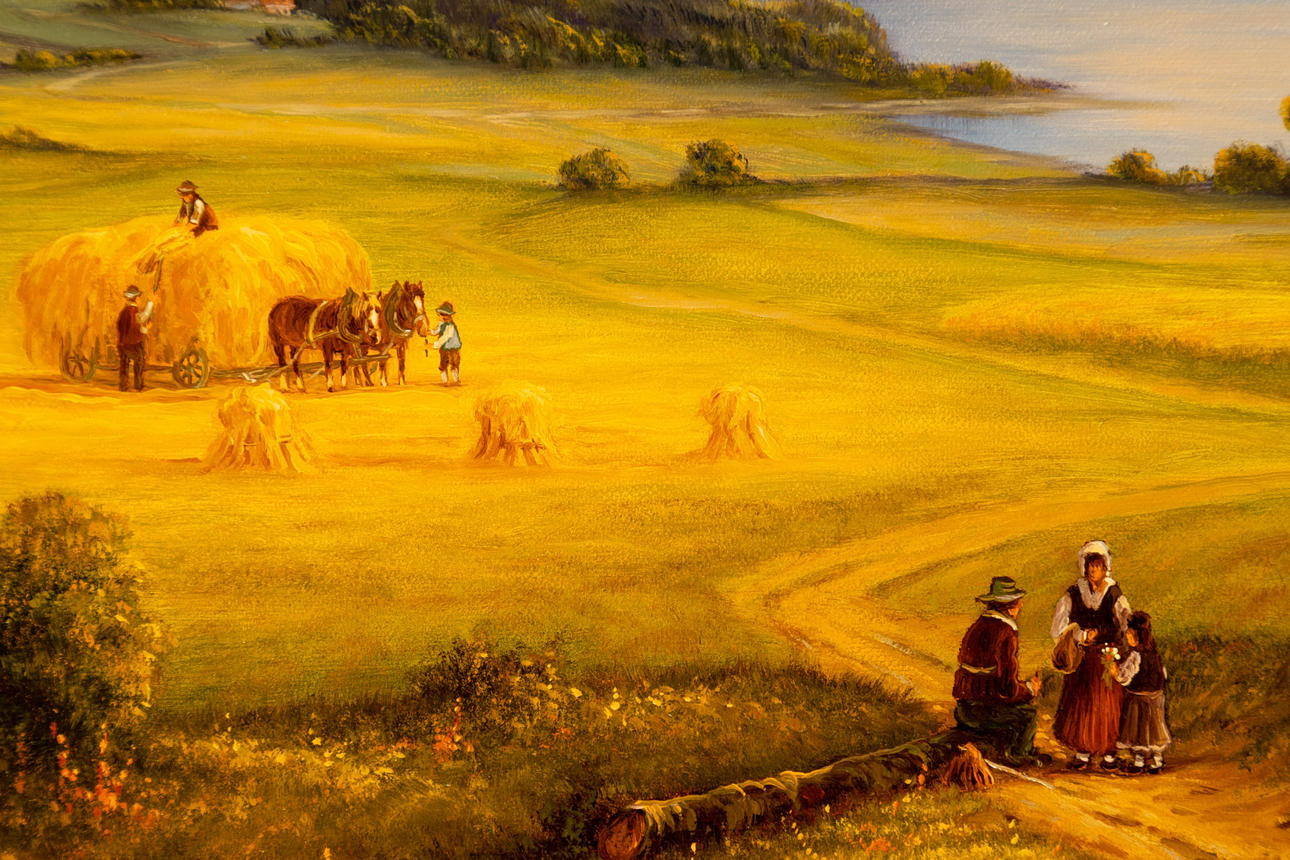 Hans Joachim Spichalski (geb. 1938), Getreideernte, 1980/90er, Öl auf Leinwand, links unten signiert, ca. 70,2 x 80,5 cm, mit Rahmen ca. 85 x 95 cm.