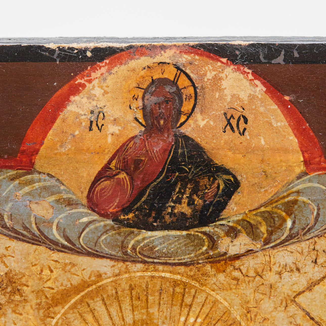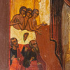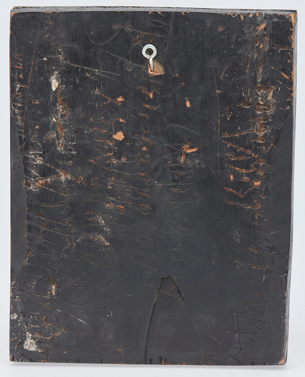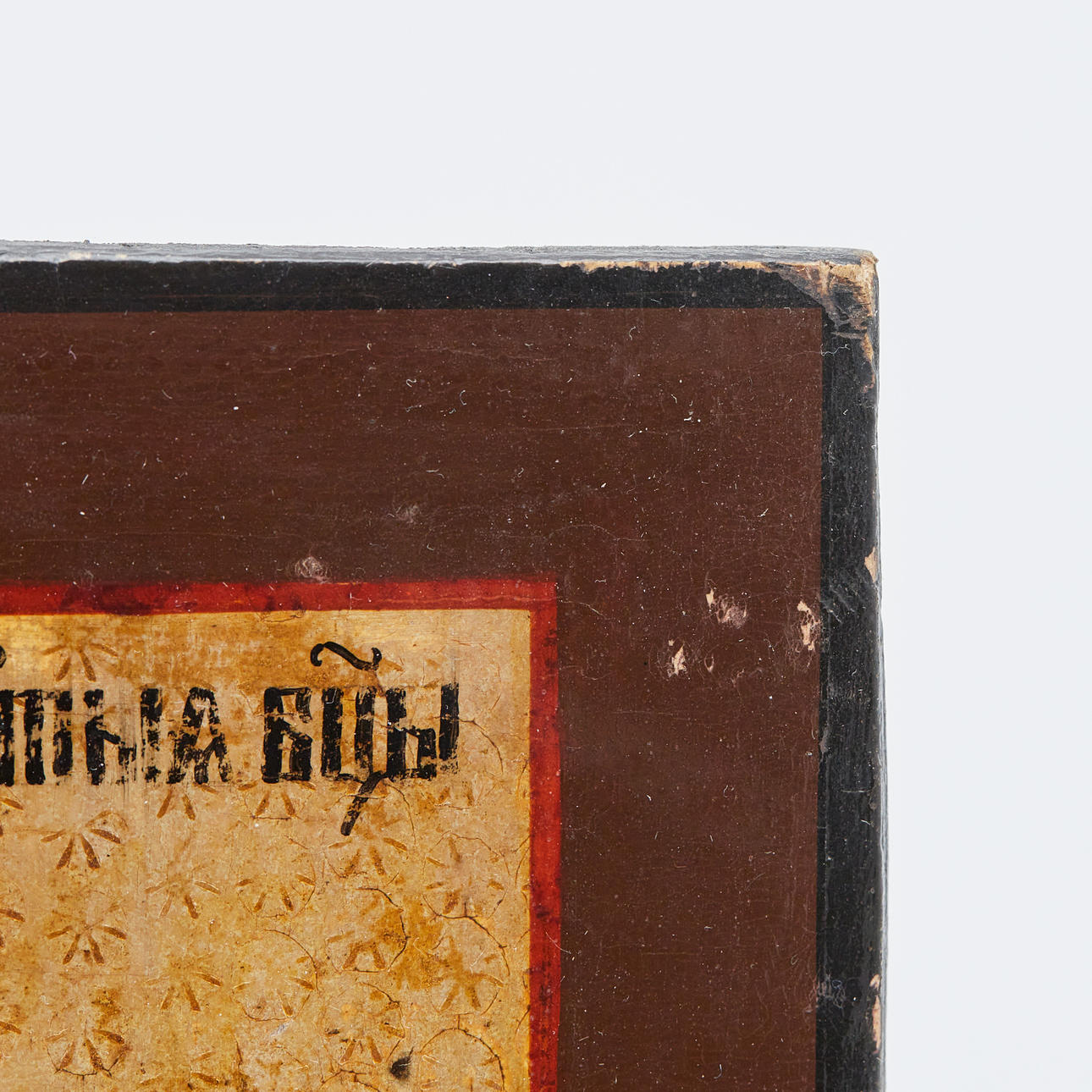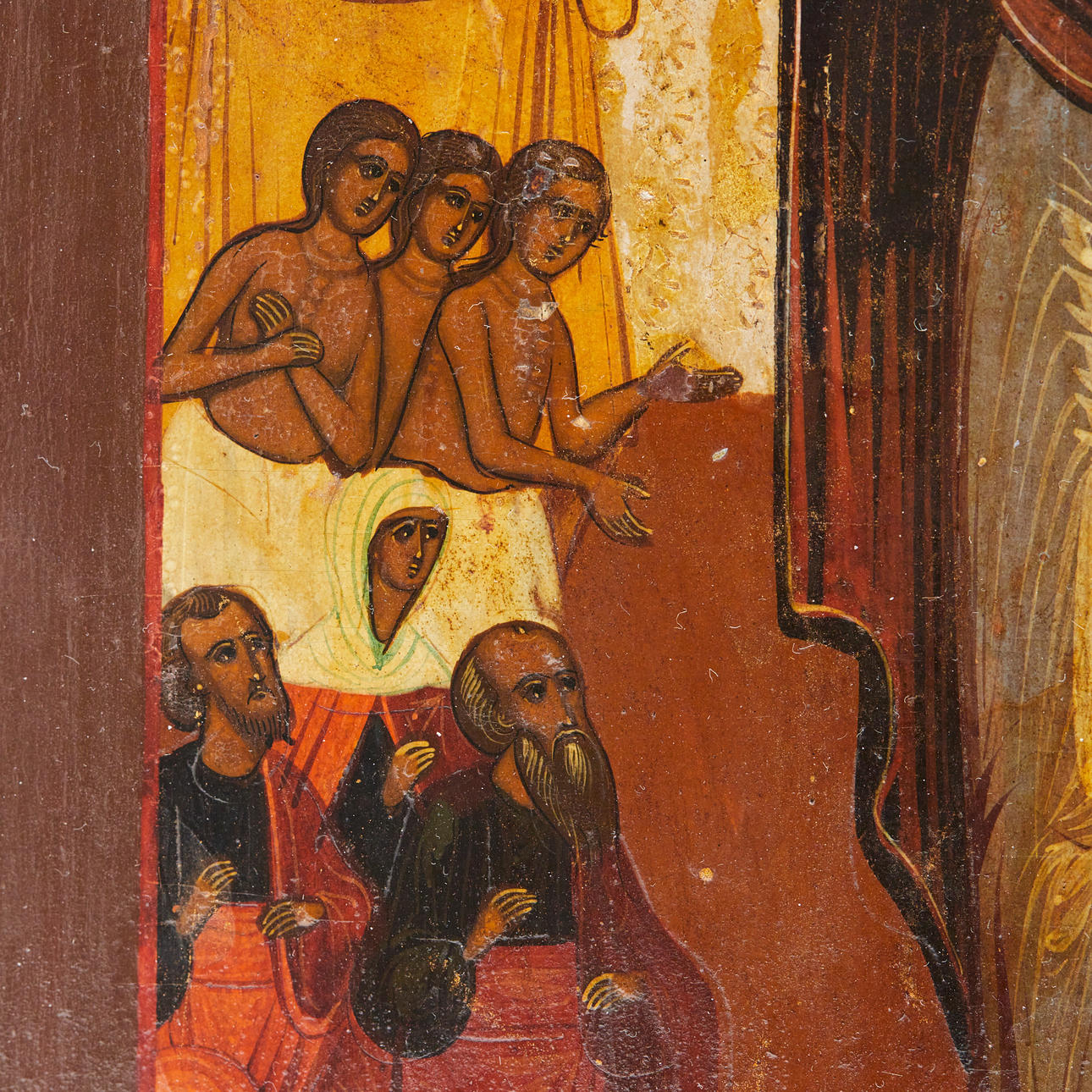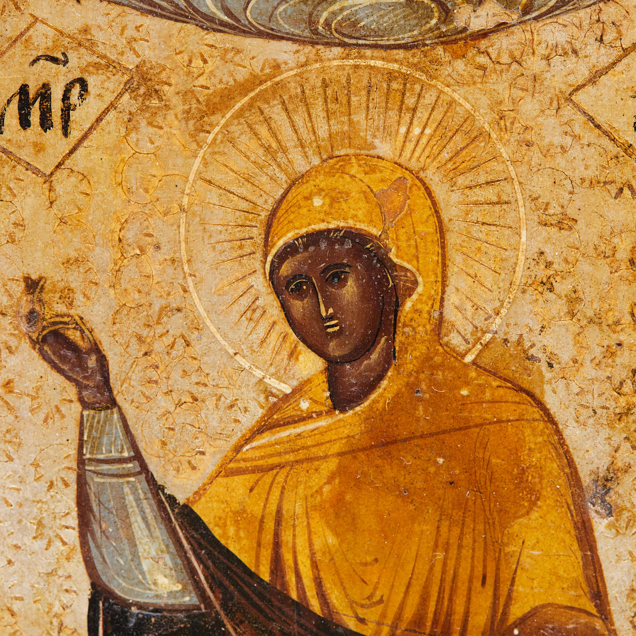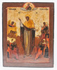 Ikone / Heiligenbild, Marienikone, Russland, Tempera auf Holz. Darstellung der Muttergottes flankiert von Heiligen und zwei Engeln, vor goldfarbenem Grund, mit kyrillischen Schriftzeichen versehen, rückseitig mit Hängevorrichtung und Einritzungen, 29,5x23cm.