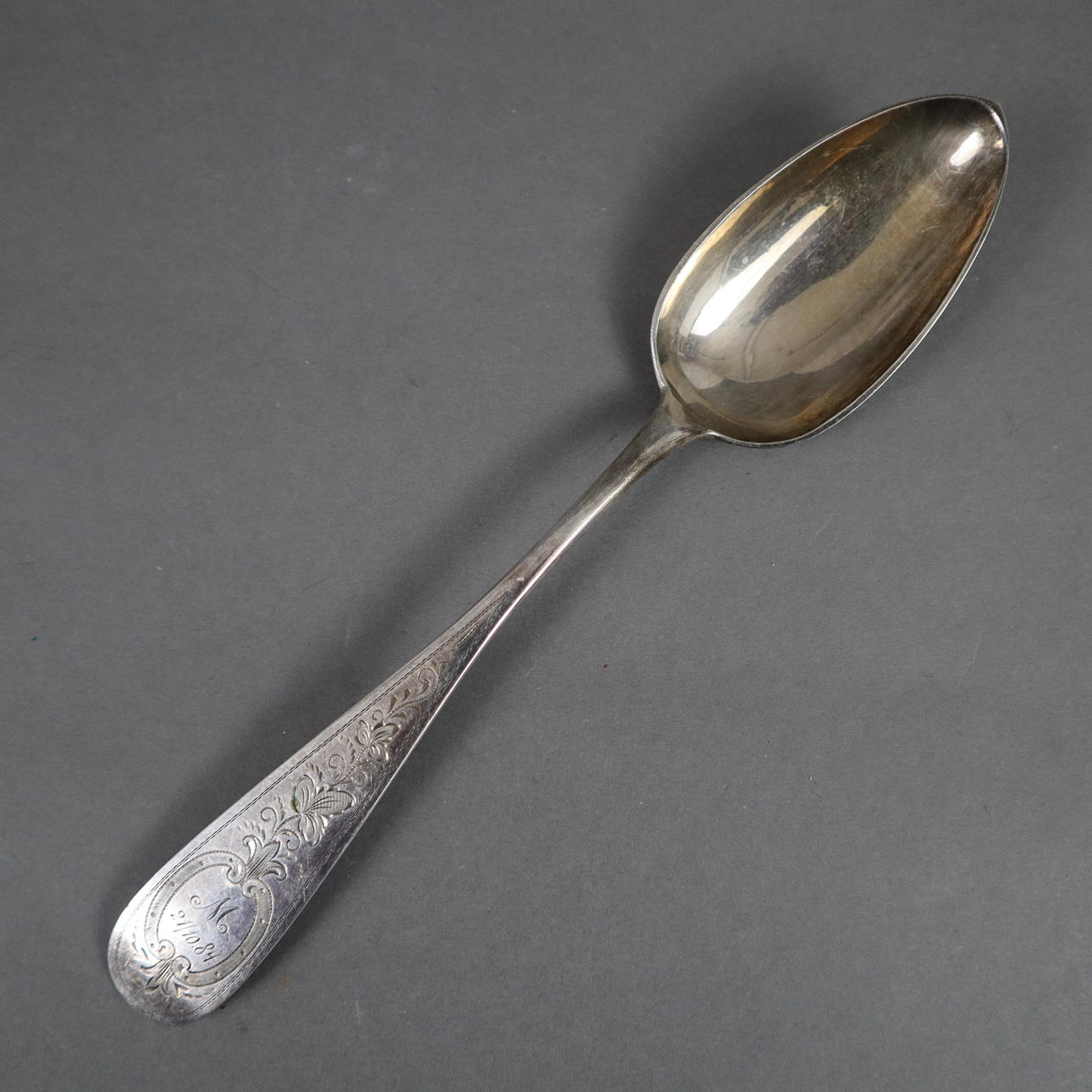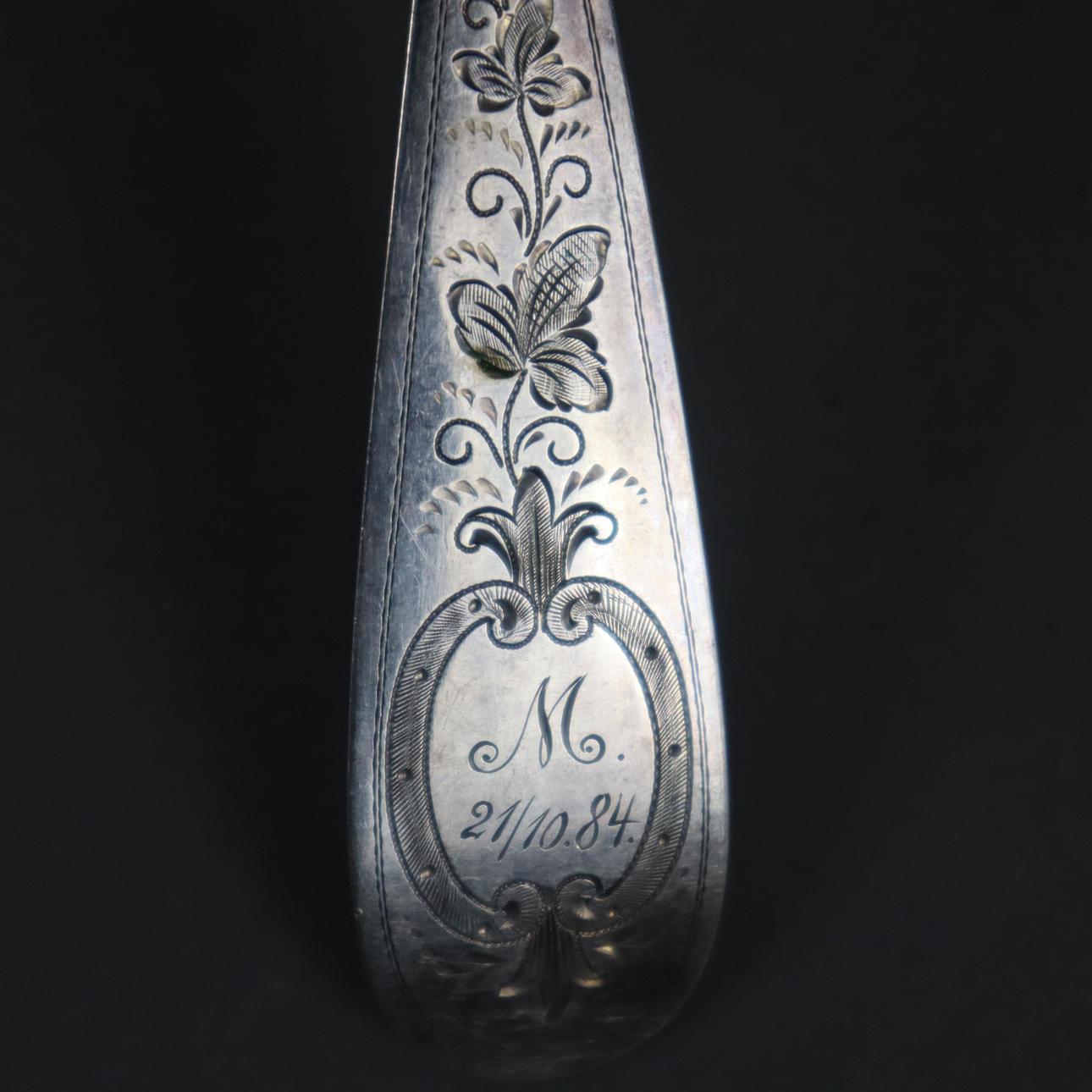 "750" gestempelt, floral gravierte Griffe mit jeweils einer monogrammierten Kartusche "M 21/10.84", spitzovale Laffen, L. ca. 21,5 cm, Gesamtgewicht ca. 243 g.