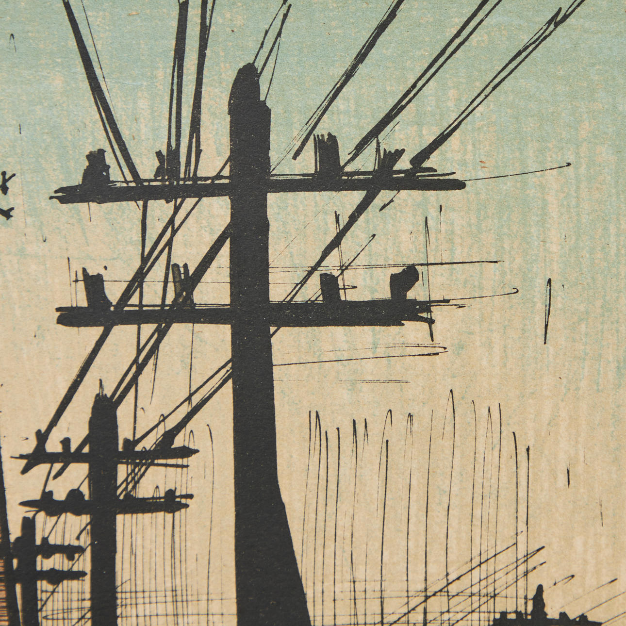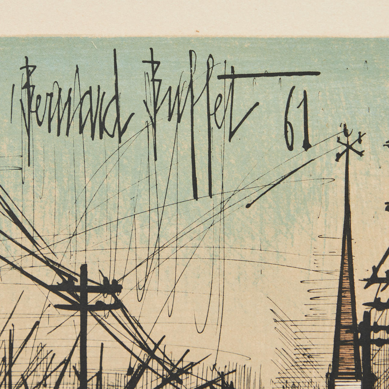 Bernard Buffet (1928-1999), Lithographie, 'La Route', 1961, Frankreich. Darstellung einer Straße von Strommasten gesäumt, in Blau, Grün und Grau, oben rechts im Druck signiert und datiert sowie unten links in Blei signiert, 50x40cm (56x46,5cm).