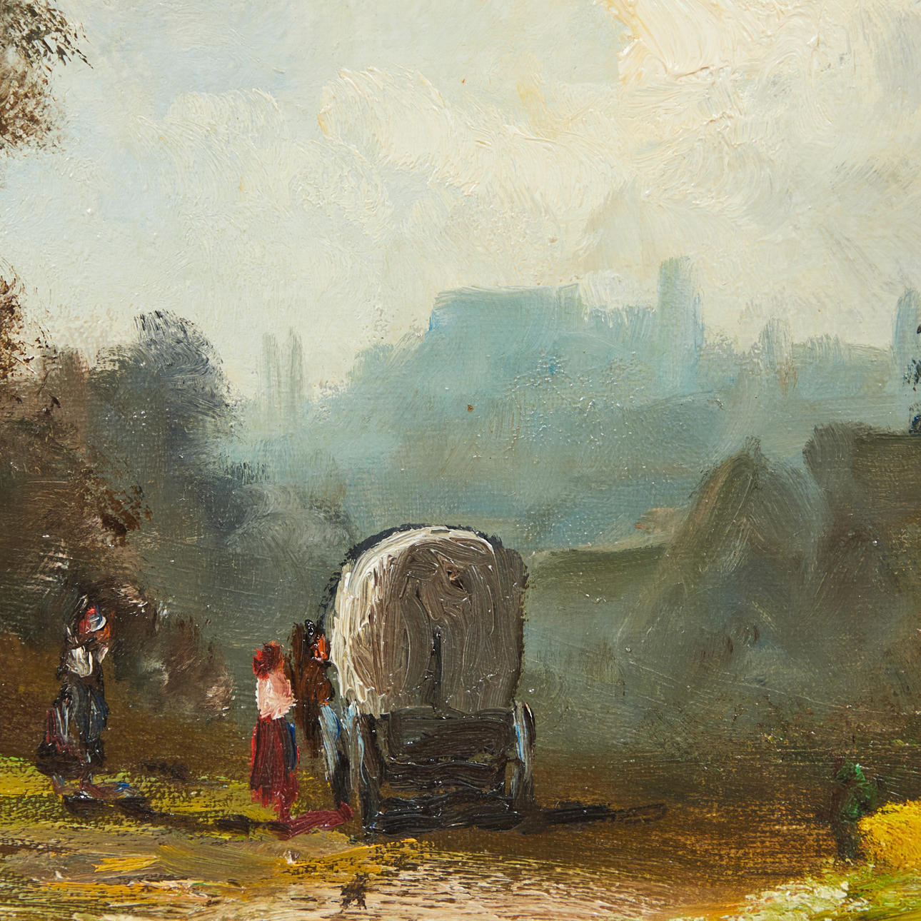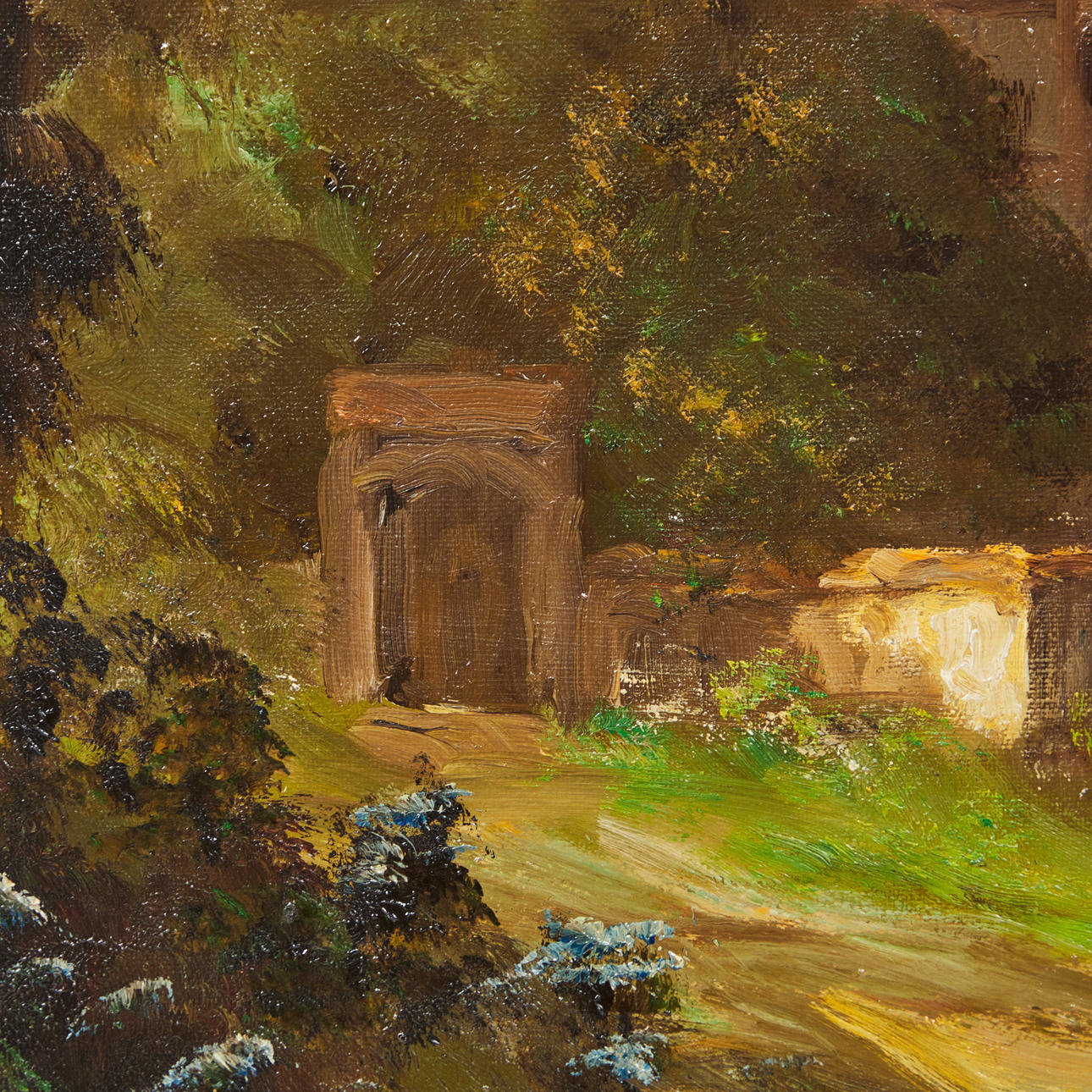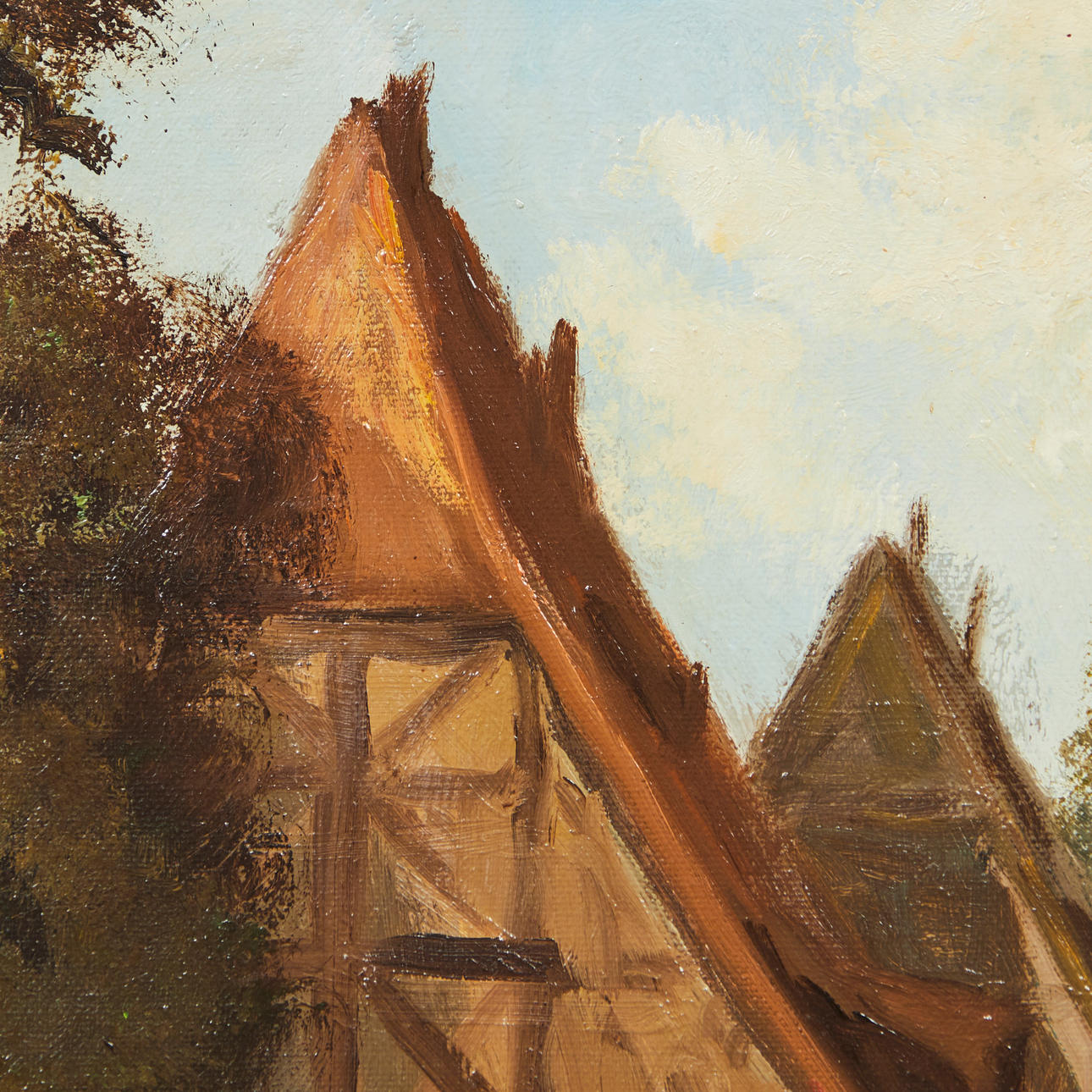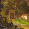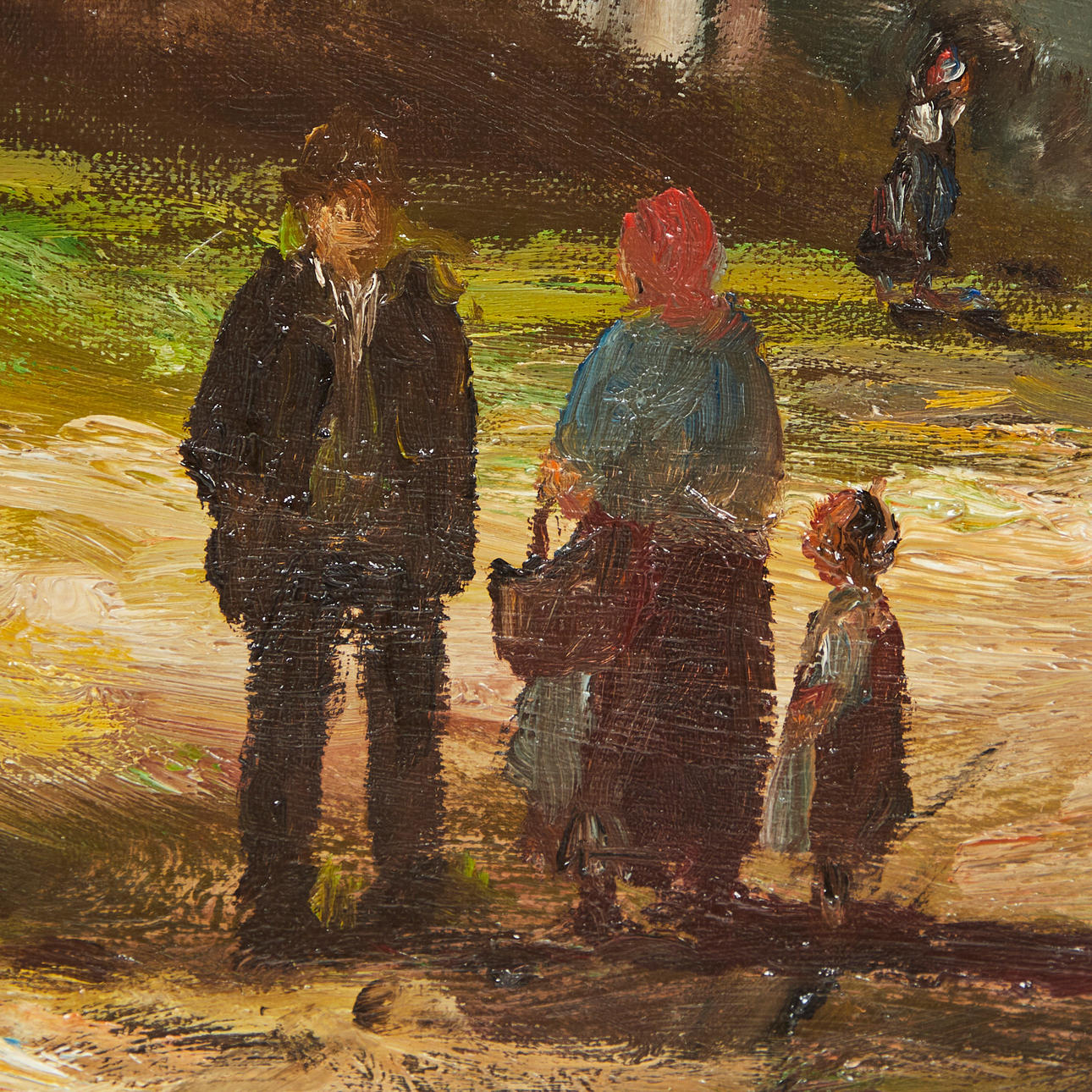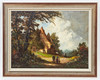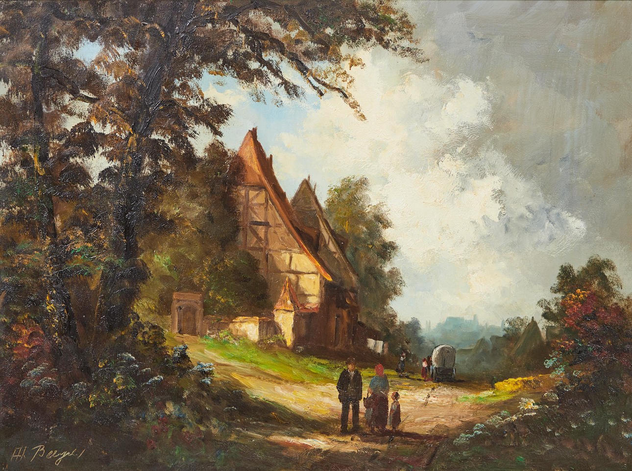 Heinrich Berger (geb. 1898), Gemälde, Landschaft, Öl auf Leinwand. Darstellung einer spätsommerlichen Landschaft mit einem ländlichen Anwesen sowie einer Menschengruppe im Vordergrund, unten links signiert, 79x95 (58x79cm).