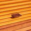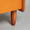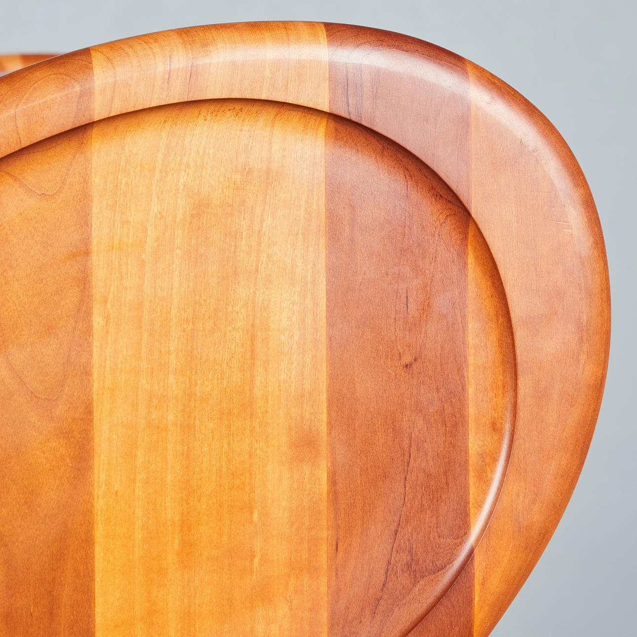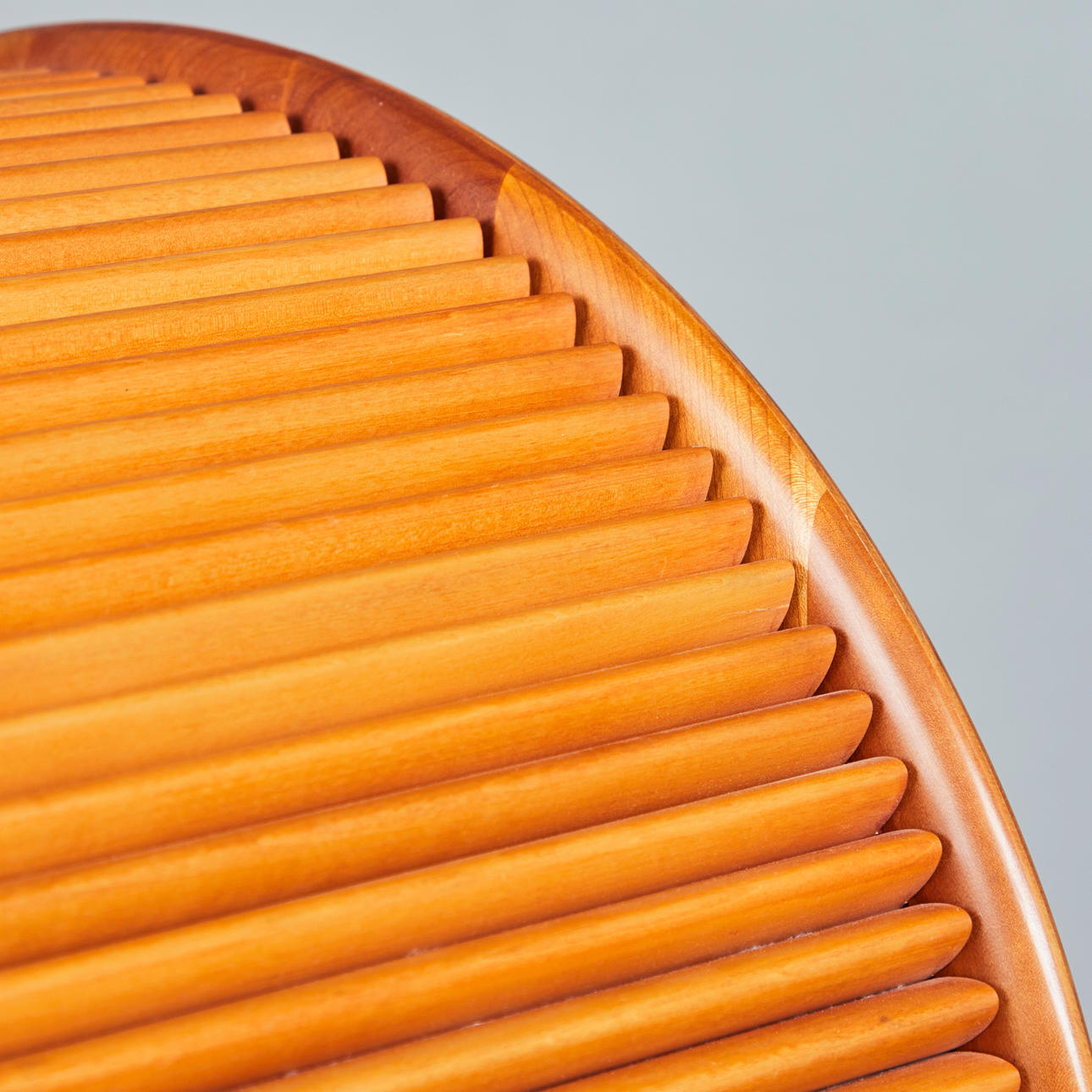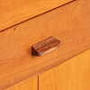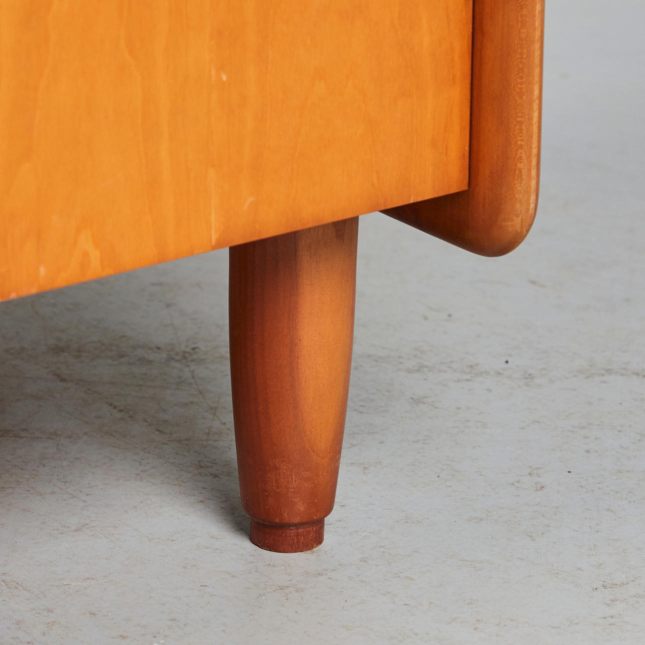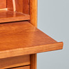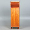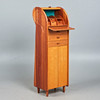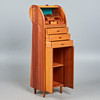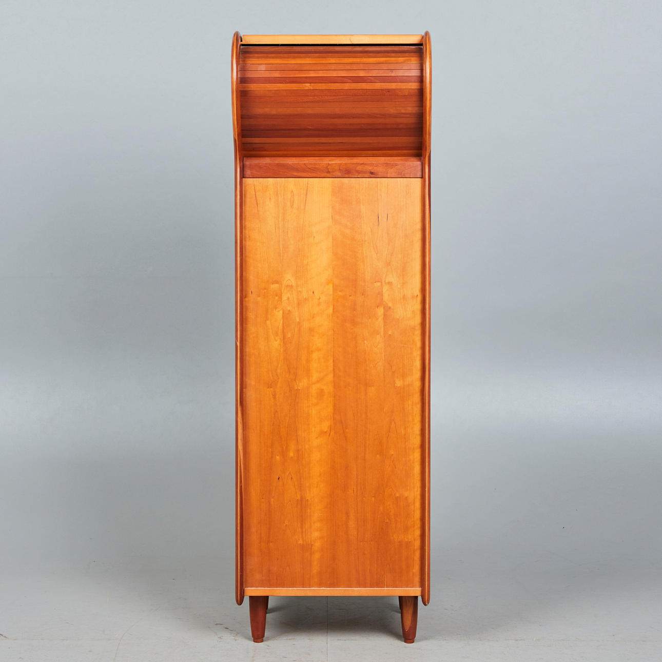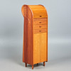 Regal, Kirsche. Regal aus lasiertem Kirschholz mit drei Schüben, zwei Türen mit Druckknöpfen sowie einer innenliegenden Ablage, oberseitig mit einem abgerundeten Rollverschluss und vier innenliegenden Schüben sowie zwei Fächern versehen, H.153cm, L.47cm, B.40cm.
