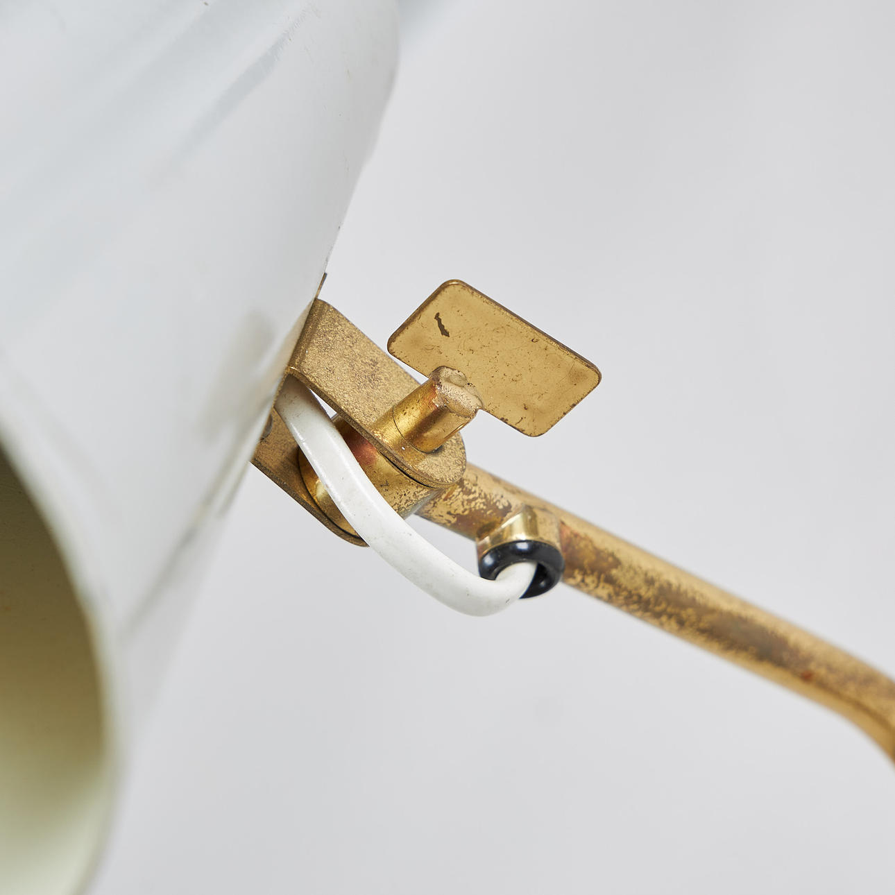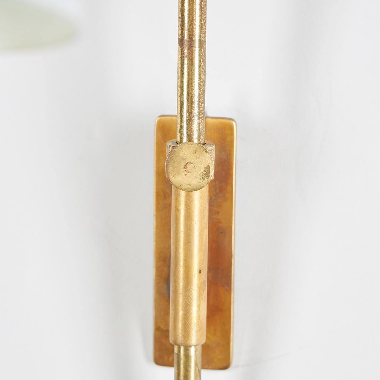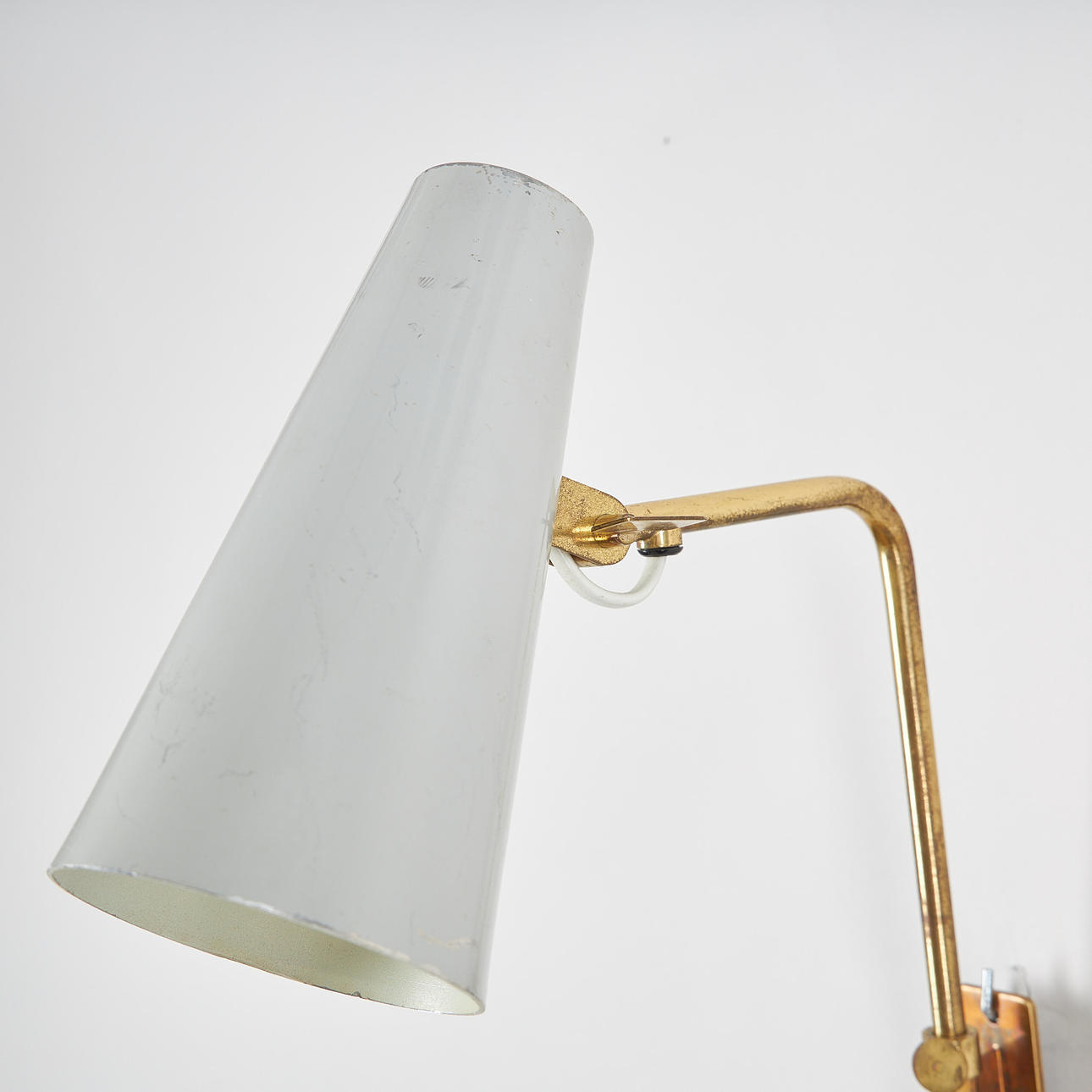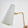 Messingschaft, hell lackierter Metallschirm mit verstellbarer Richtung, Durchmesser 10 cm, Länge ca. 18 cm. Gesamthöhe 37 cm.