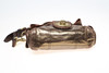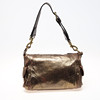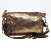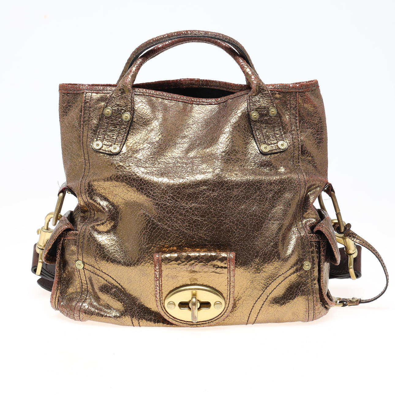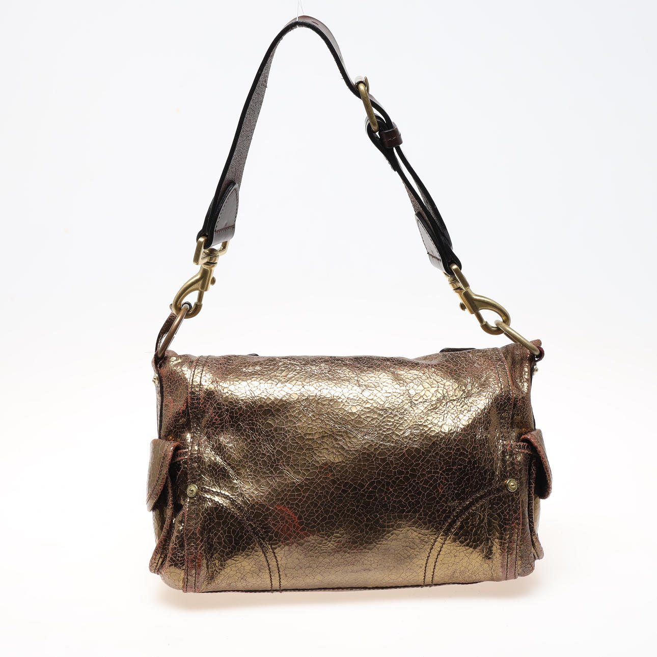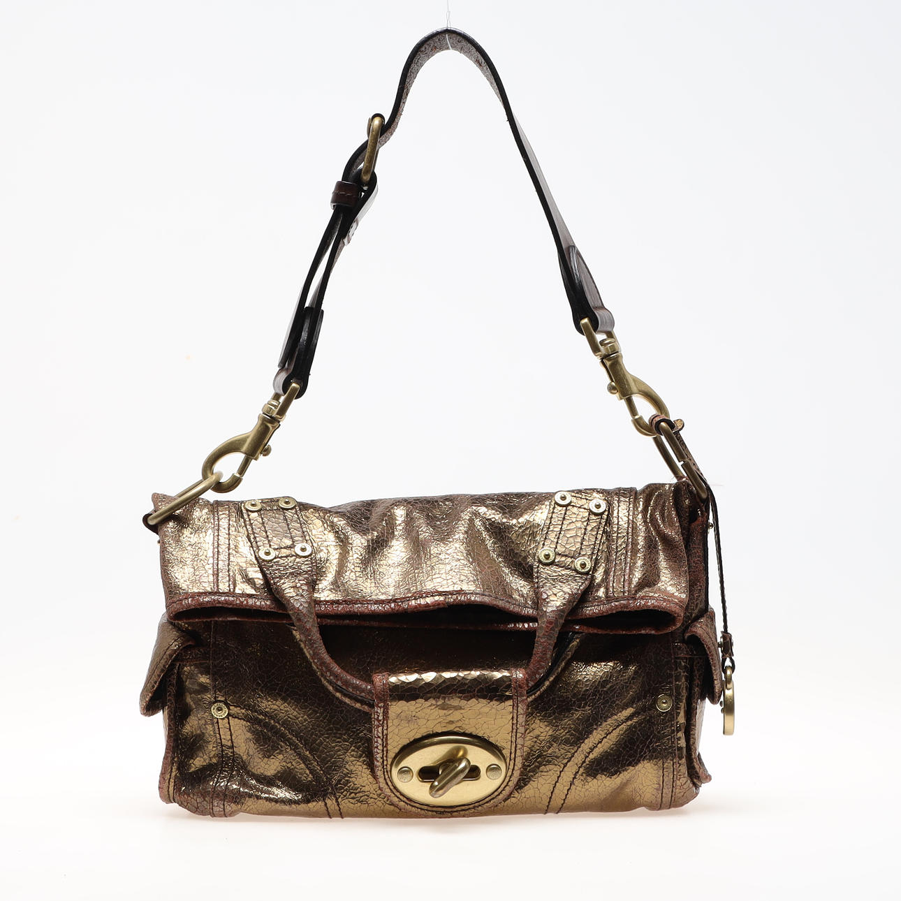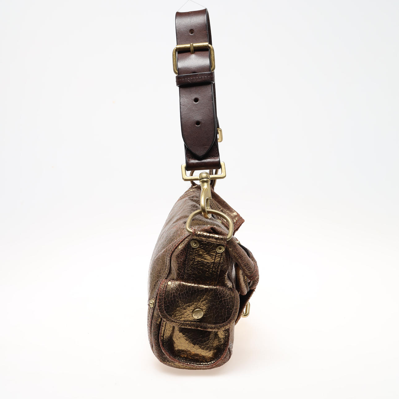 Tasche aus rissigem bronzefarbenem Leder mit Beschlägen aus messingfarbenem Metall. Abnehmbarer Schultergurt mit Karabinern. Innen aus schwarzem Nylon, einem offenen Seitenfach und einem Reißverschluss. Markiert MULBERRY, Plakette markiert 488917. Abmessungen Höhe 17/28 cm, 27x10 cm.