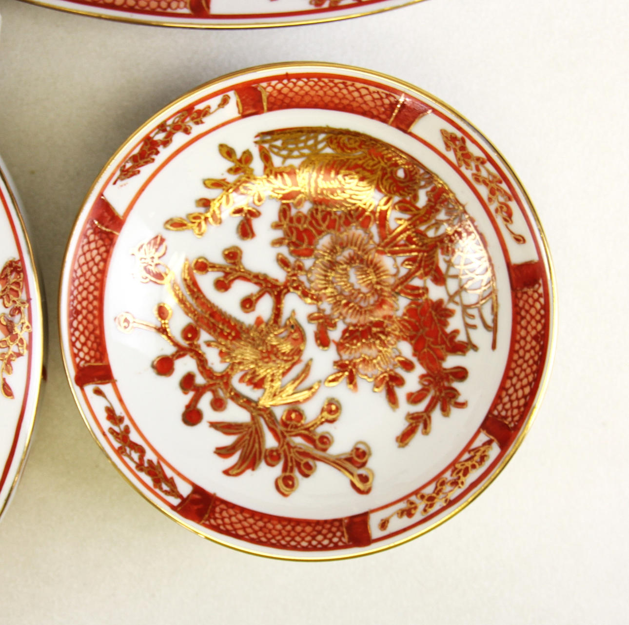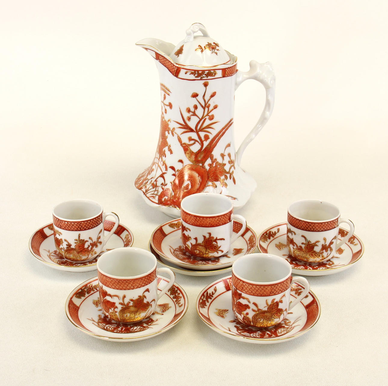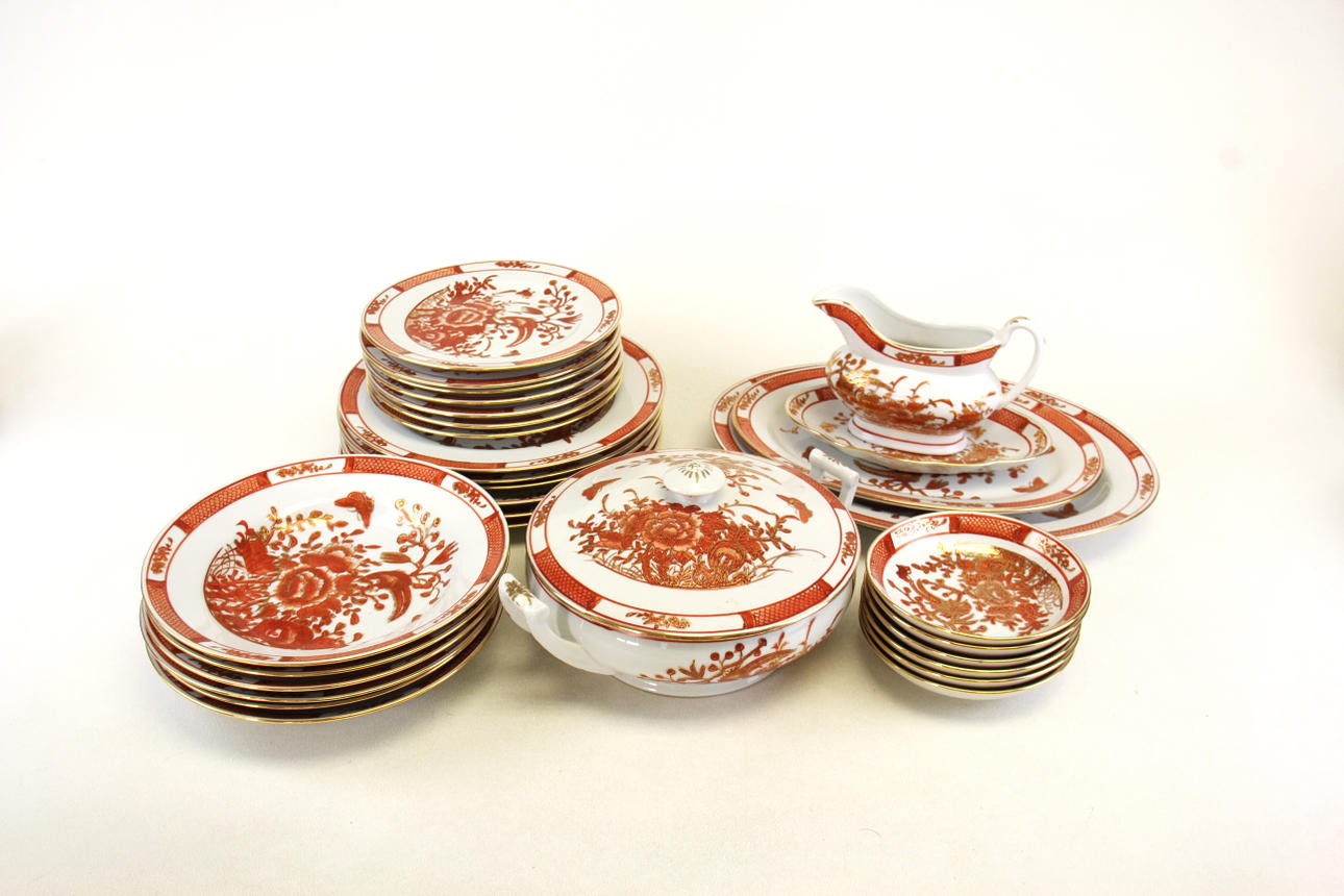 Eine große Menge japanischer Porzellangeschirrteile, Kaffee- und Tafelservice, bestehend aus 6 Speisetellern, 7 Beilagentellern, sechs Schalen, 1 Kaffeekanne, 1 Terrine, 2 Serviertellern, 1 Sauciere und Teller, 5 Tassen und 10 Untertassen.