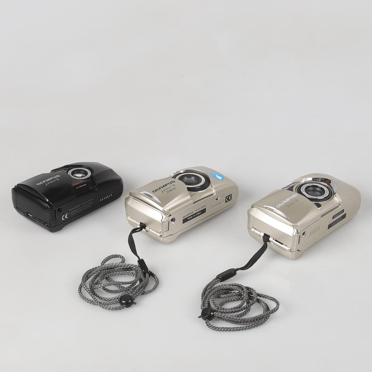 Ein Menge Olympus Kameras für Kleinbildfilm bestehend aus: Olympus µ [mju:] II mit festem 35 mm, schwarze Version Olympus µ [mju:] II Zoom 80 mit 38-80 mm Zoomobjektiv, silber Olympus Stylus 120 (µ [mju :] III ) mit 38-120mm Zoomobjektiv, silber Zwei Kameras mit Tragegurt, eine mit mitgeliefertem Notfallkoffer.