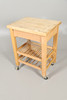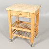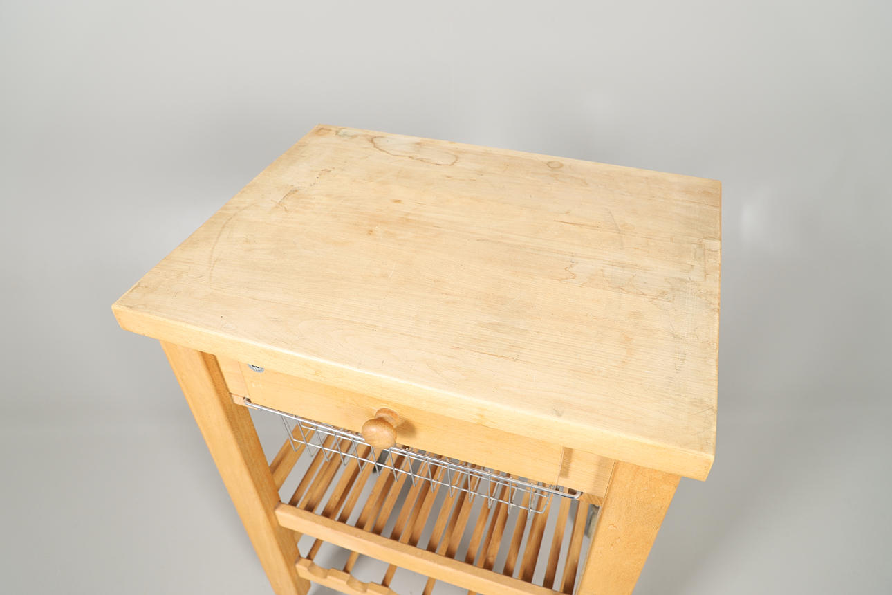 Ein Küchen-/Hausmetzgerblock/Kücheninsel auf Rollen, mit zweistöckigen Lagerregalen, einer einzelnen Schublade in der Haupteinheit und einem ausziehbaren Aufbewahrungskorb aus Metall. Höhe 89 cm x Länge 67 cm x Tiefe 52 cm.