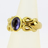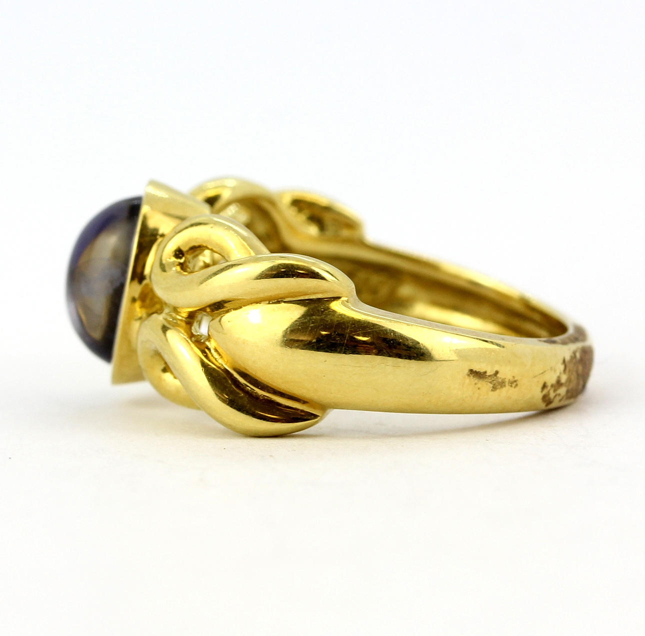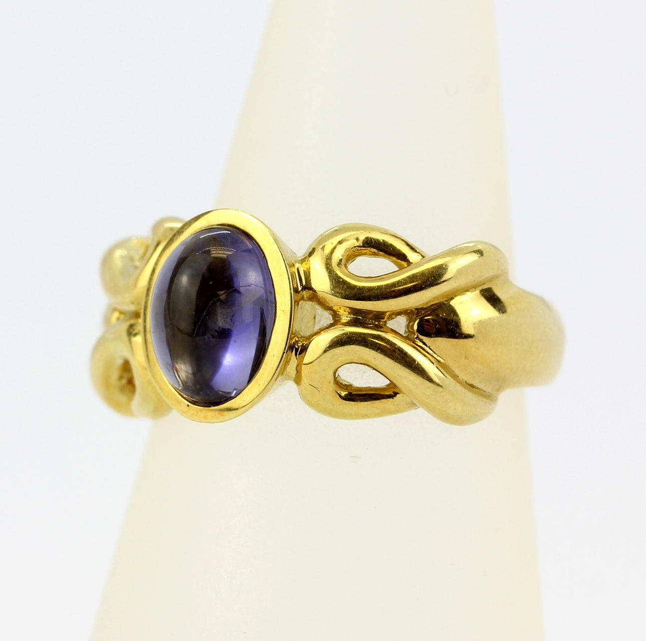 Ein Solitärring aus 10 Karat Gelbgold (gestempelt 10 Karat), besetzt mit einem ovalen Cabochon-Saphir (L).