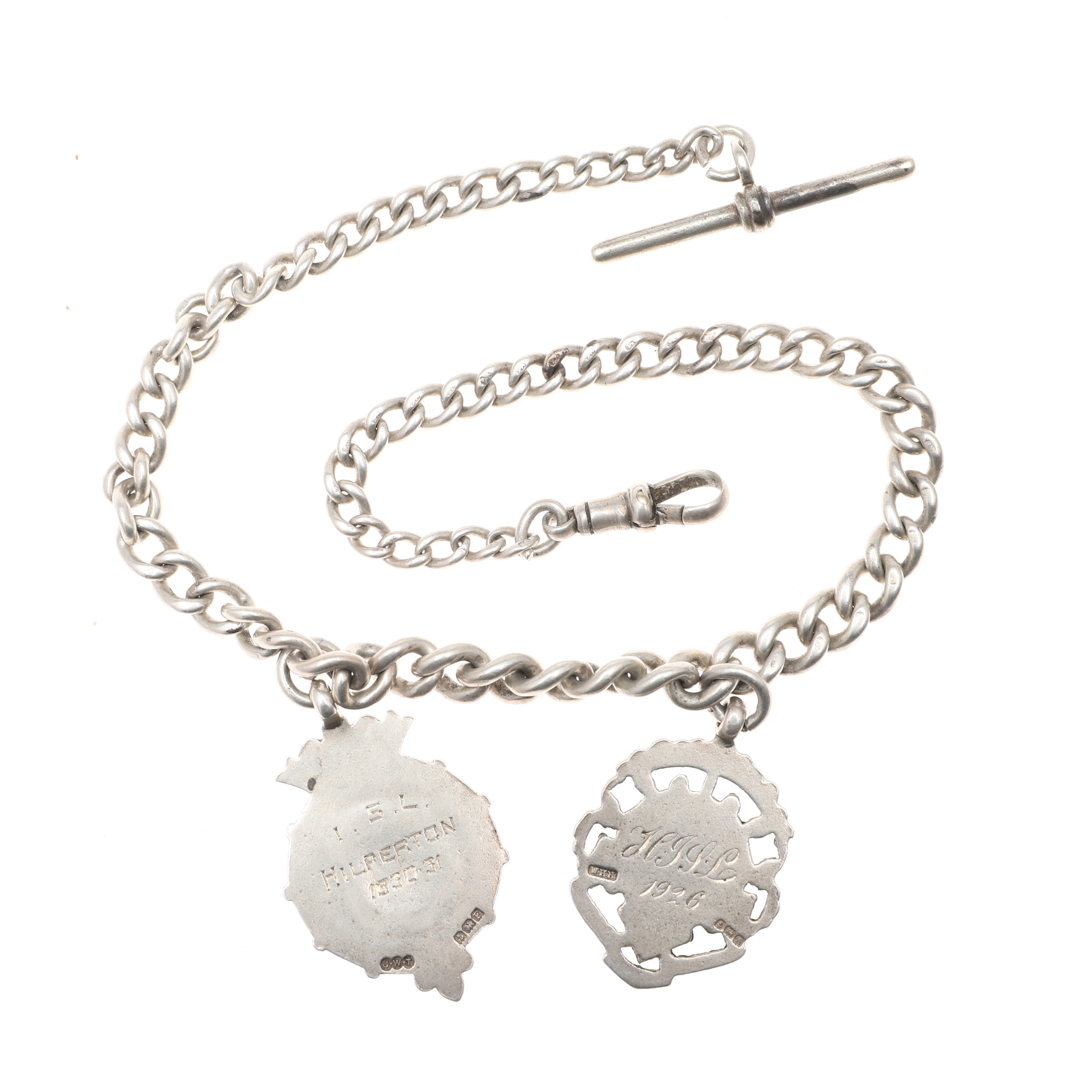 2683872. EINE SILBERNE UHRENKETTE UND ZWEI ANHÄNGER.