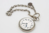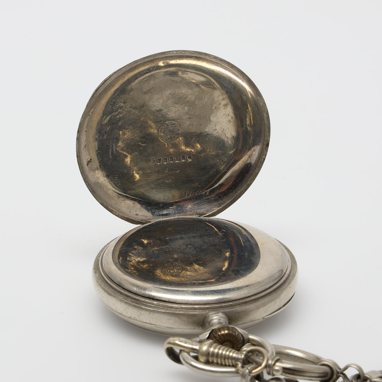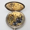 Weißmetall, Anker, Zentralsekunde, nicht originale Kette und Anhänger mit "Monogramm Oscar II" und Gravur, Seriennummer 4905756, Gehäusenummer 5705164, Gehäusedurchmesser 50,5 mm.