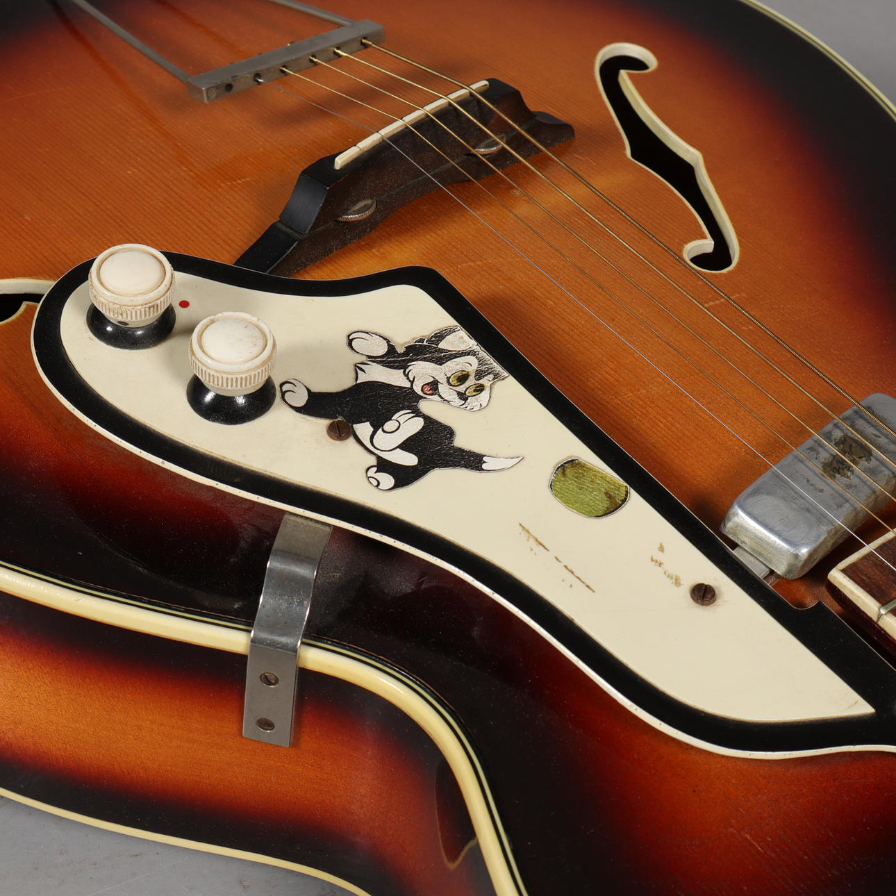 Loch an der Seite des Körpers. 1 Saite fehlt. Verschleiß.