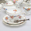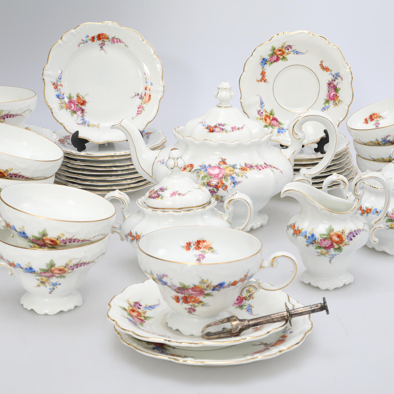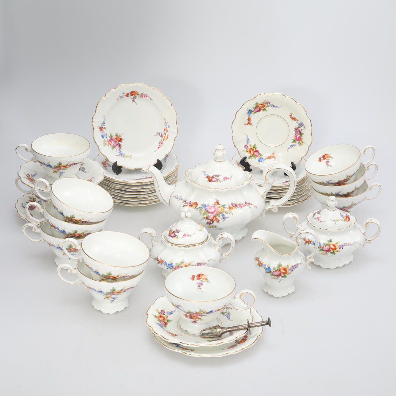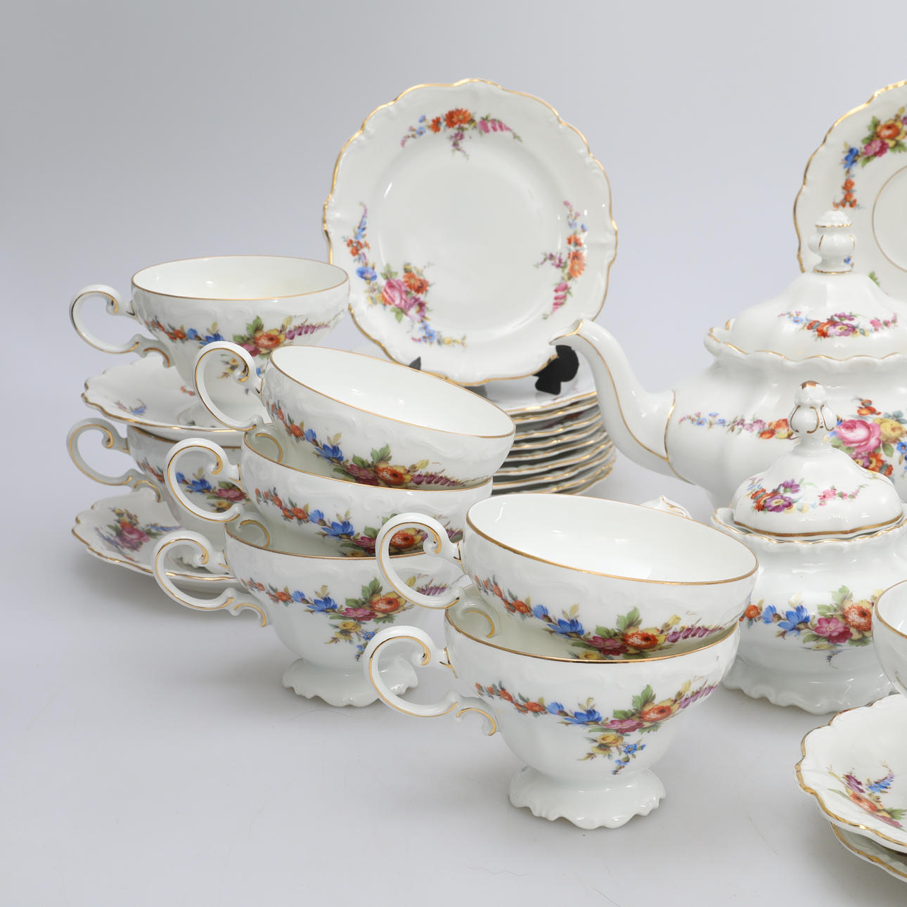 11 Teller, Durchmesser ca. 17 cm, 12 Teller, Durchmesser ca. 16 cm, 11 Tassen, Höhe ca. 7,5 cm, 1 Teekanne, Höhe ca. 19 cm, 2 Zuckerdosen, Höhe ca. 12 cm, 1 Milchkännchen, Höhe ca. 10 cm, 1 Zuckerzange.