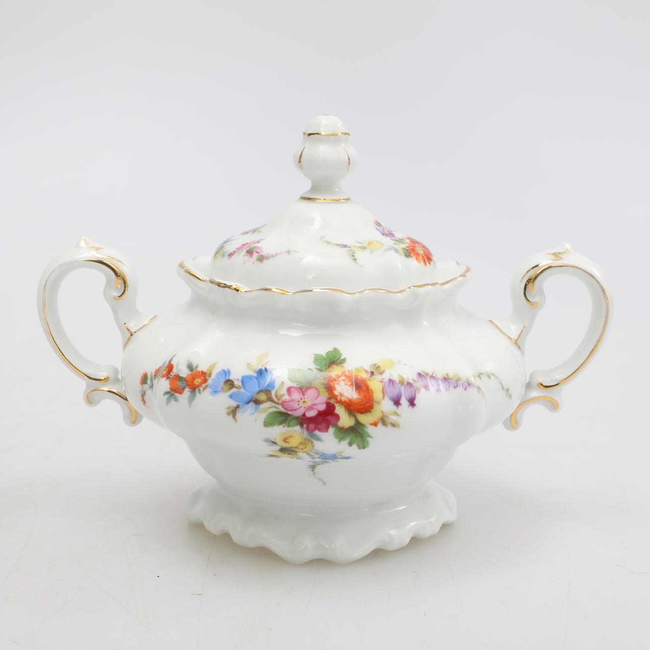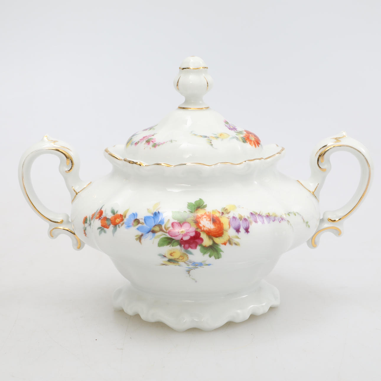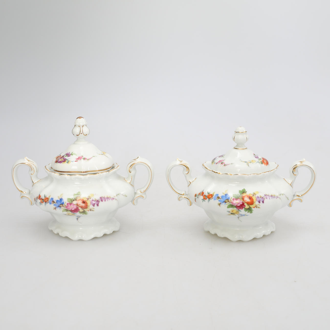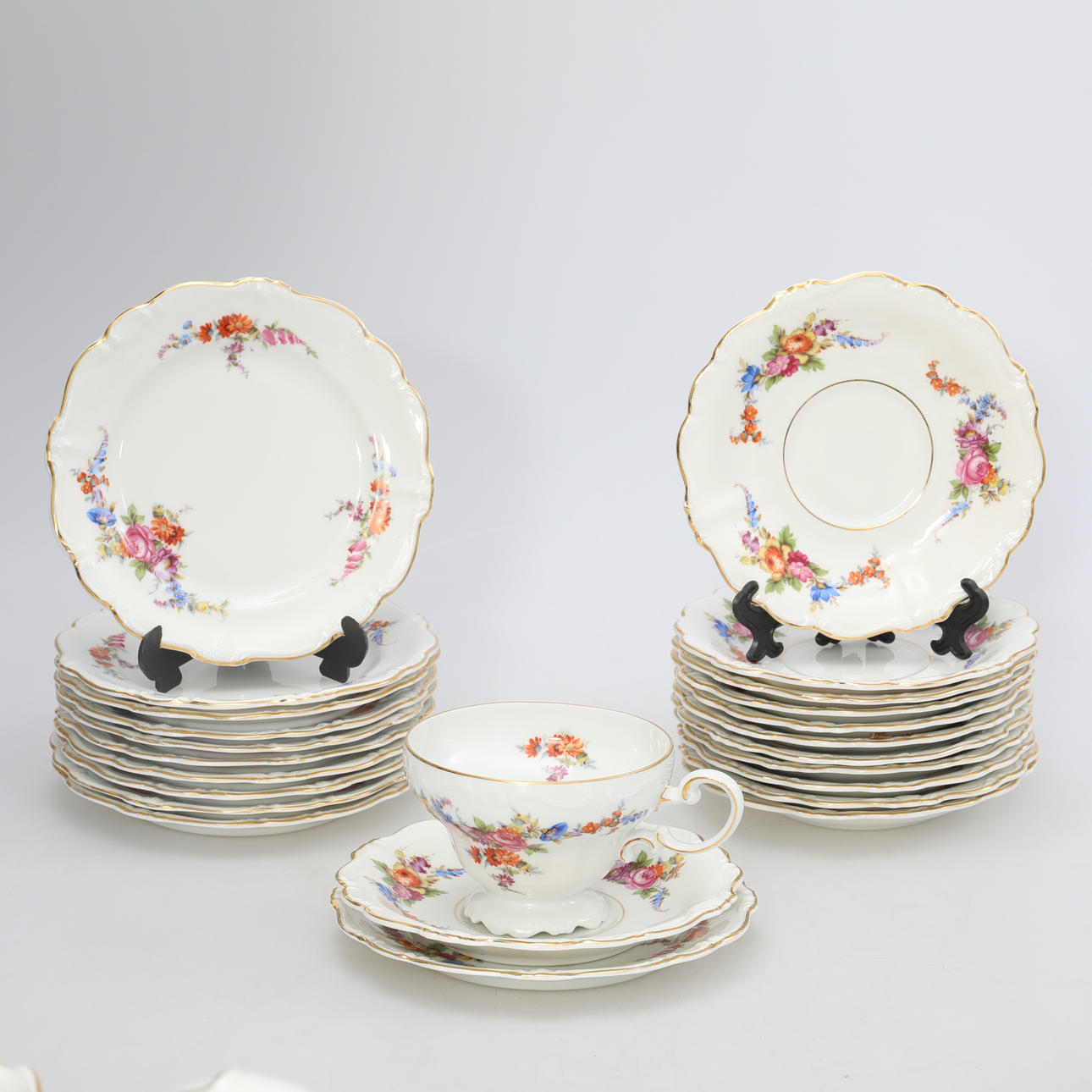 11 Teller, Durchmesser ca. 17 cm, 12 Teller, Durchmesser ca. 16 cm, 11 Tassen, Höhe ca. 7,5 cm, 1 Teekanne, Höhe ca. 19 cm, 2 Zuckerdosen, Höhe ca. 12 cm, 1 Milchkännchen, Höhe ca. 10 cm, 1 Zuckerzange.