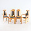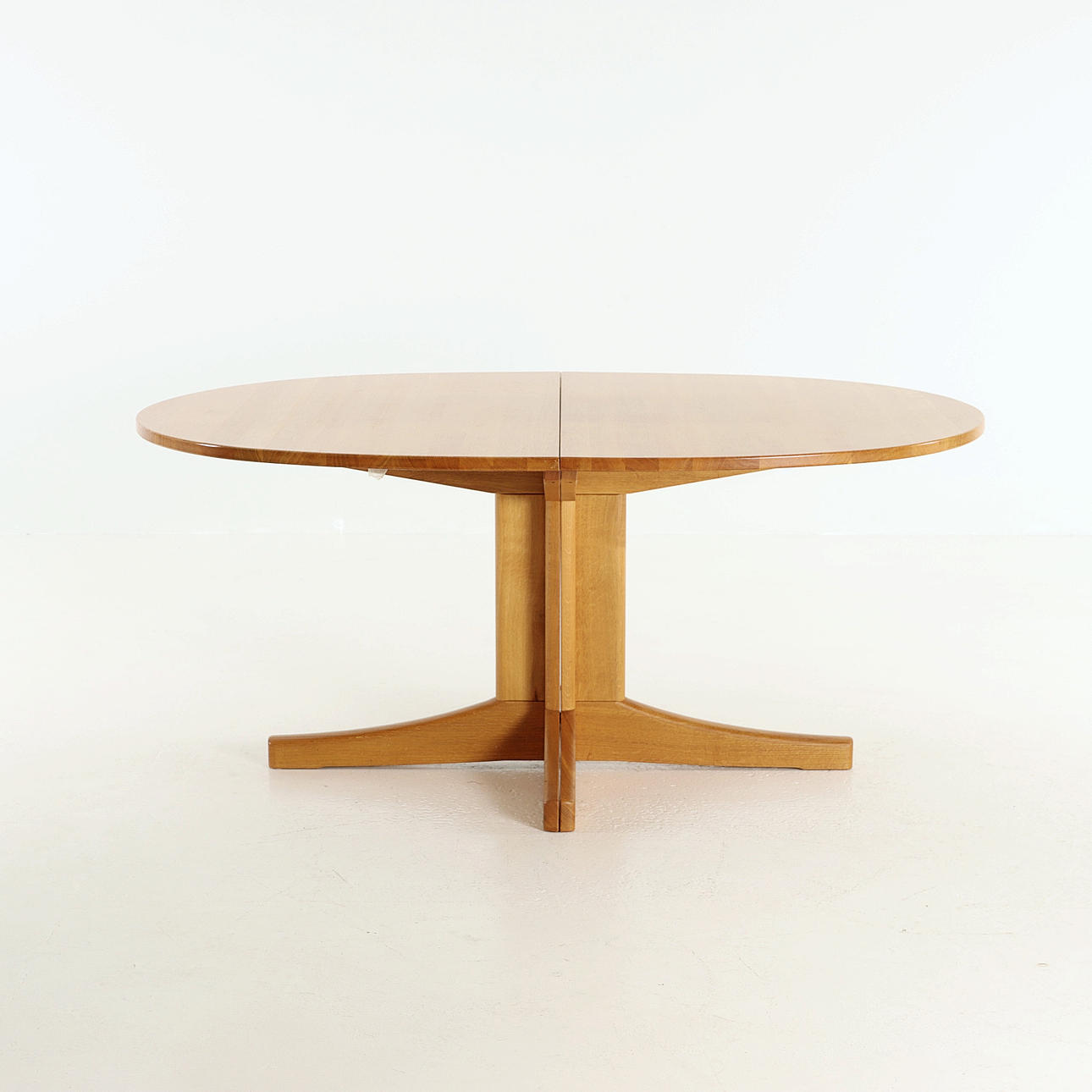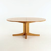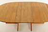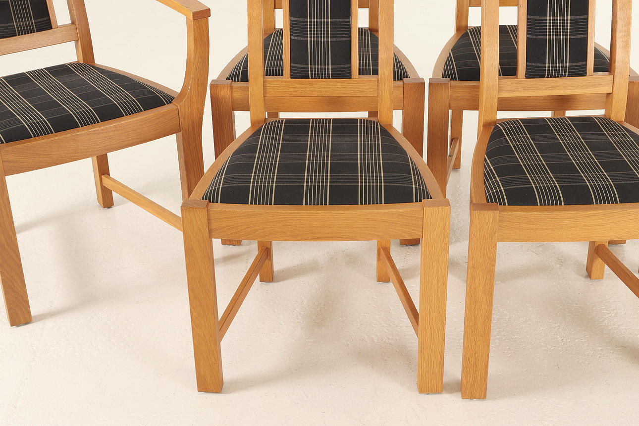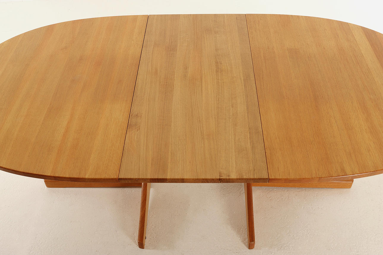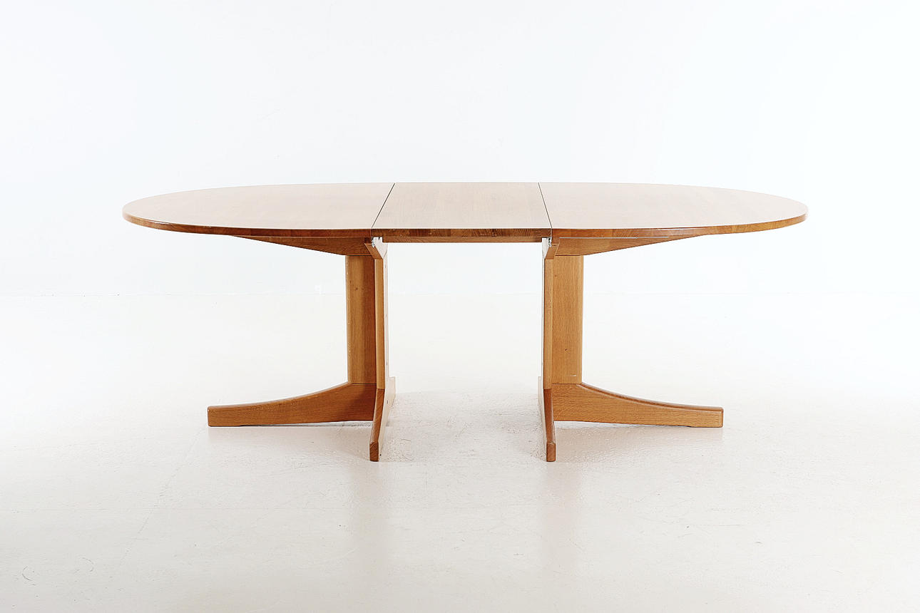 Ovaler Esstisch aus Eiche. 2 Einlegeplatten, eine aus MDF. Insgesamt 6 Stühle nebeneinander, davon 2 mit Armlehnen.