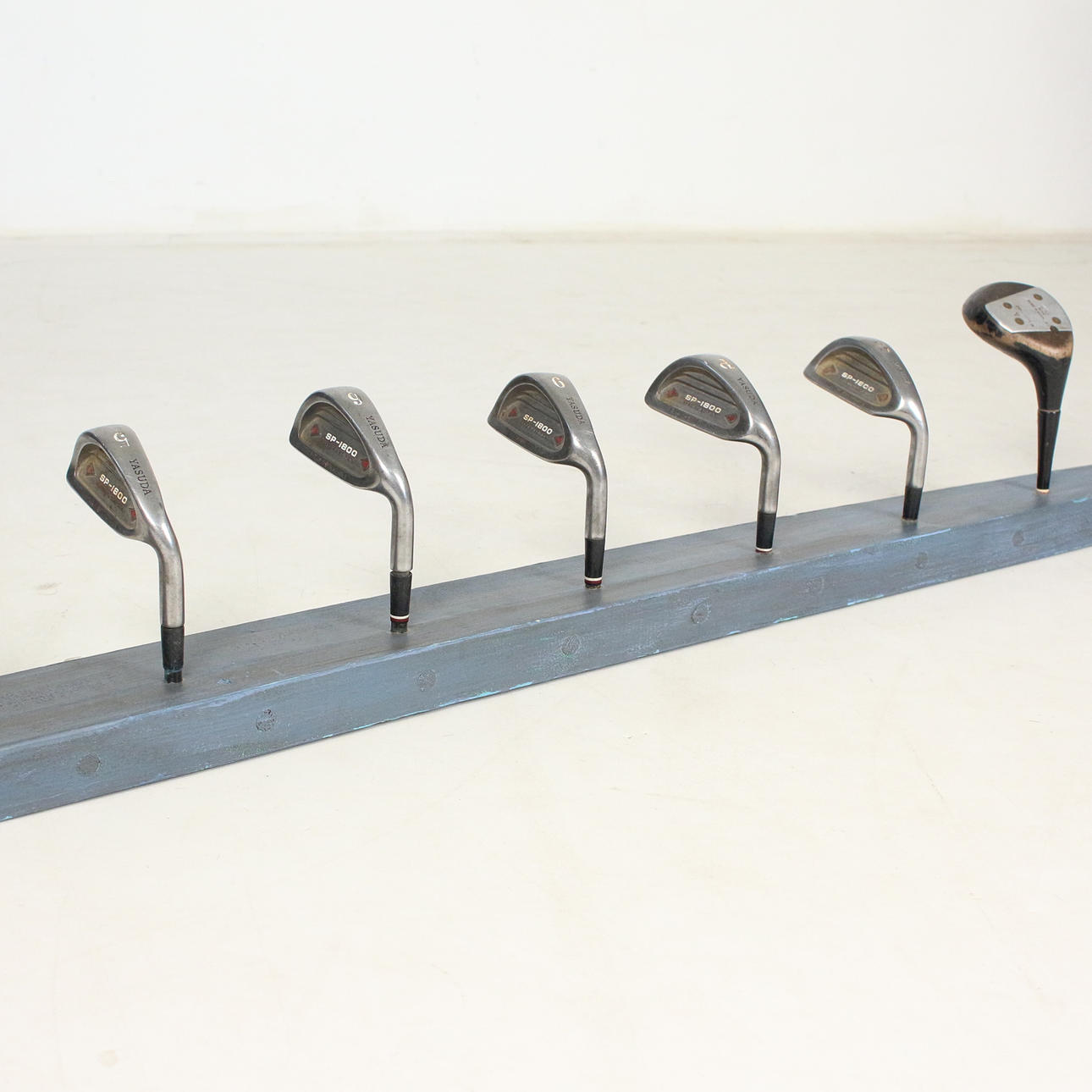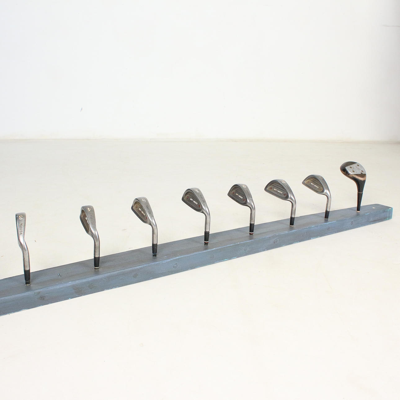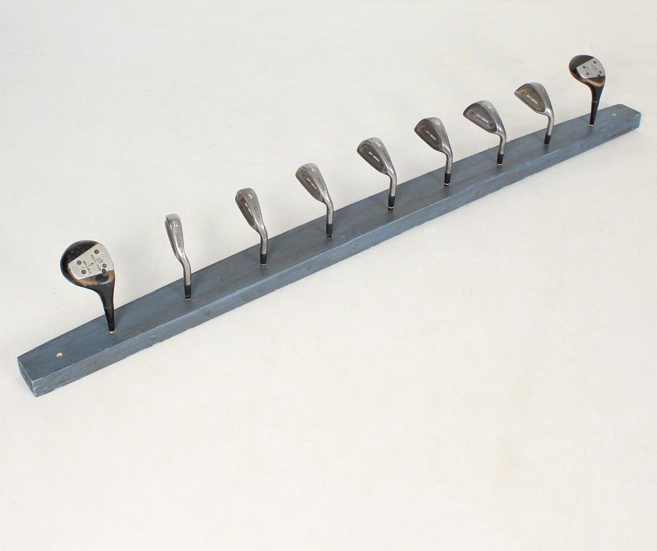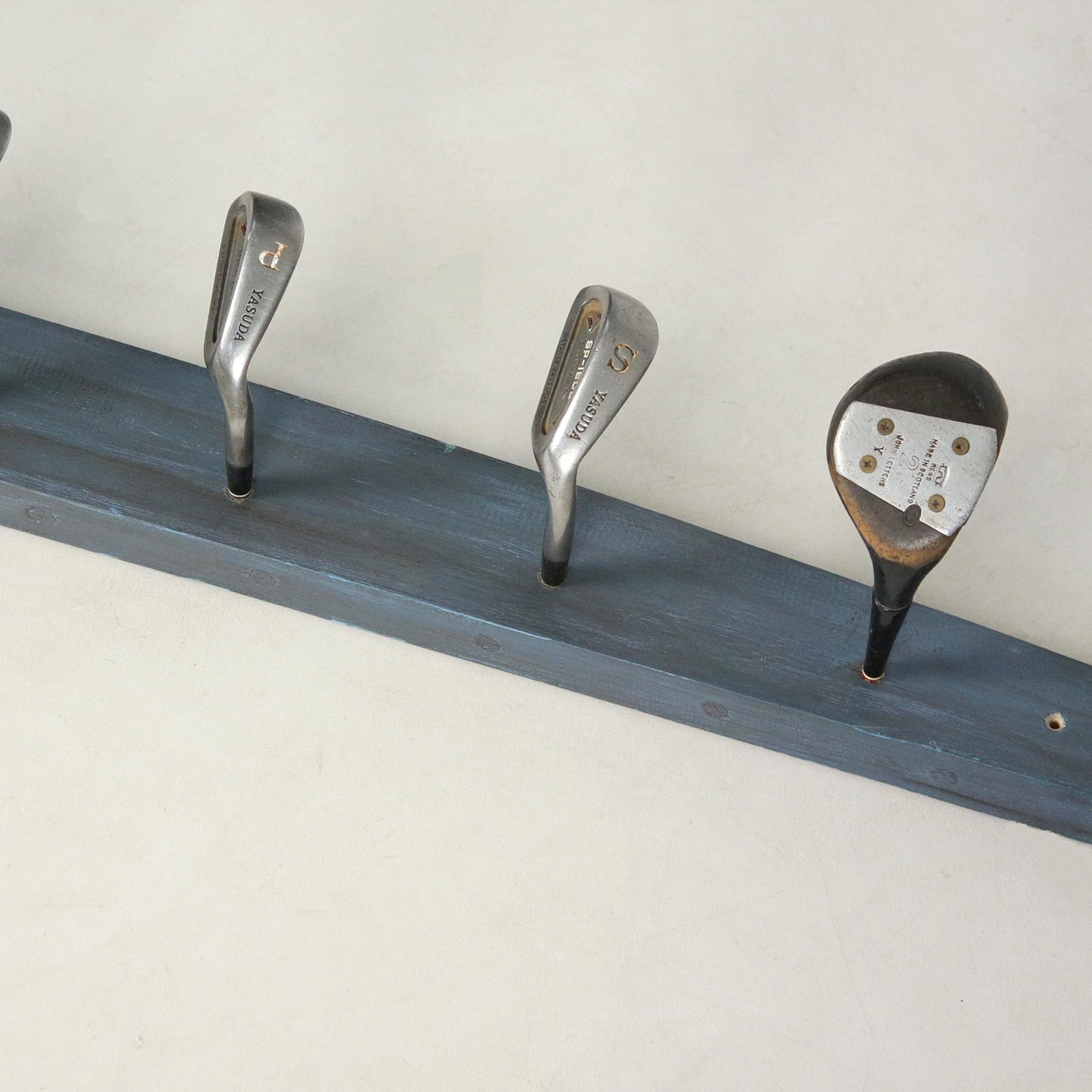Garderobe 'Golfschläger', Unikat, mit 9 Haken, montiert auf einem Holzbrett, lackiert,